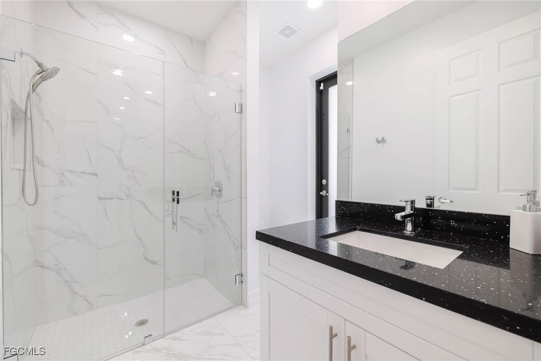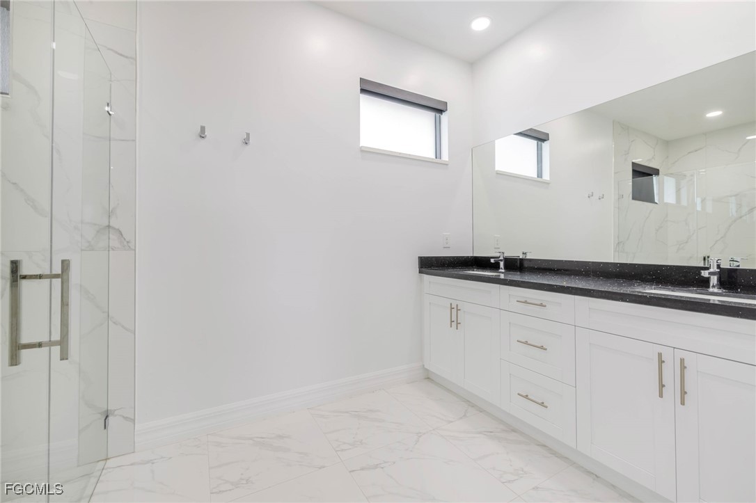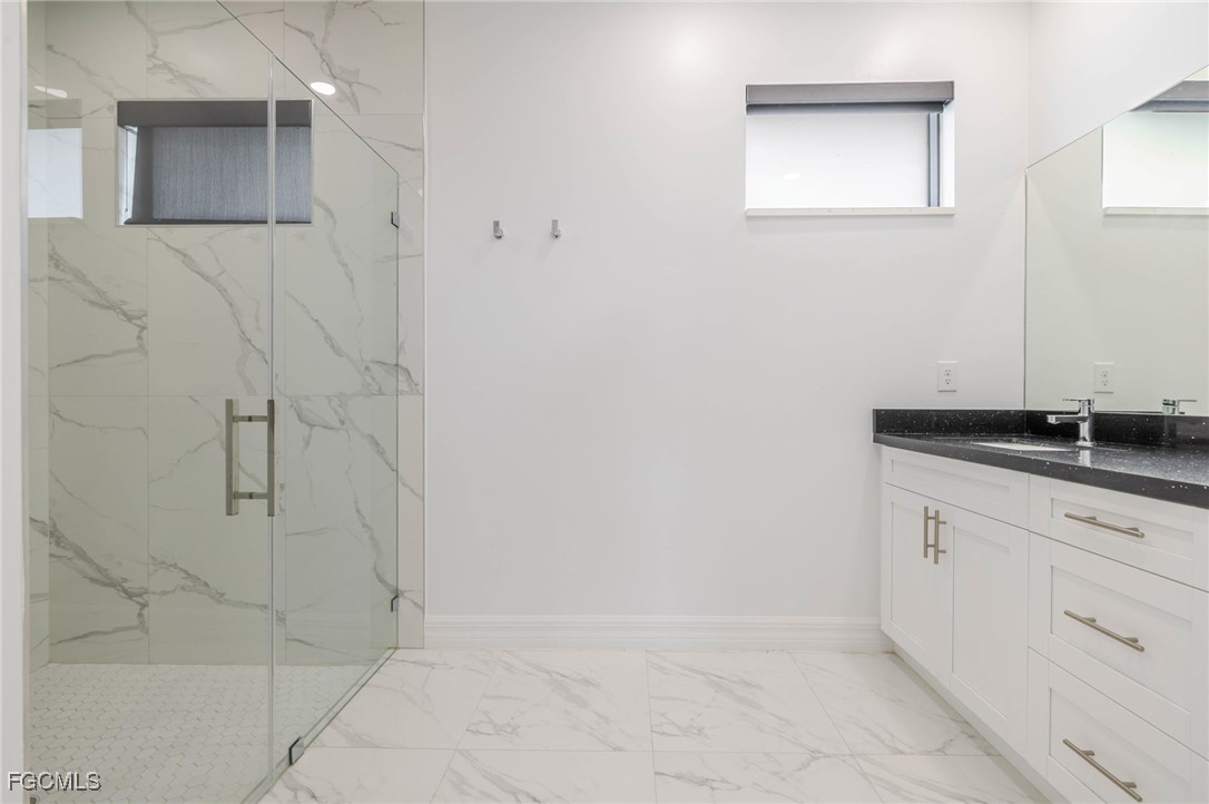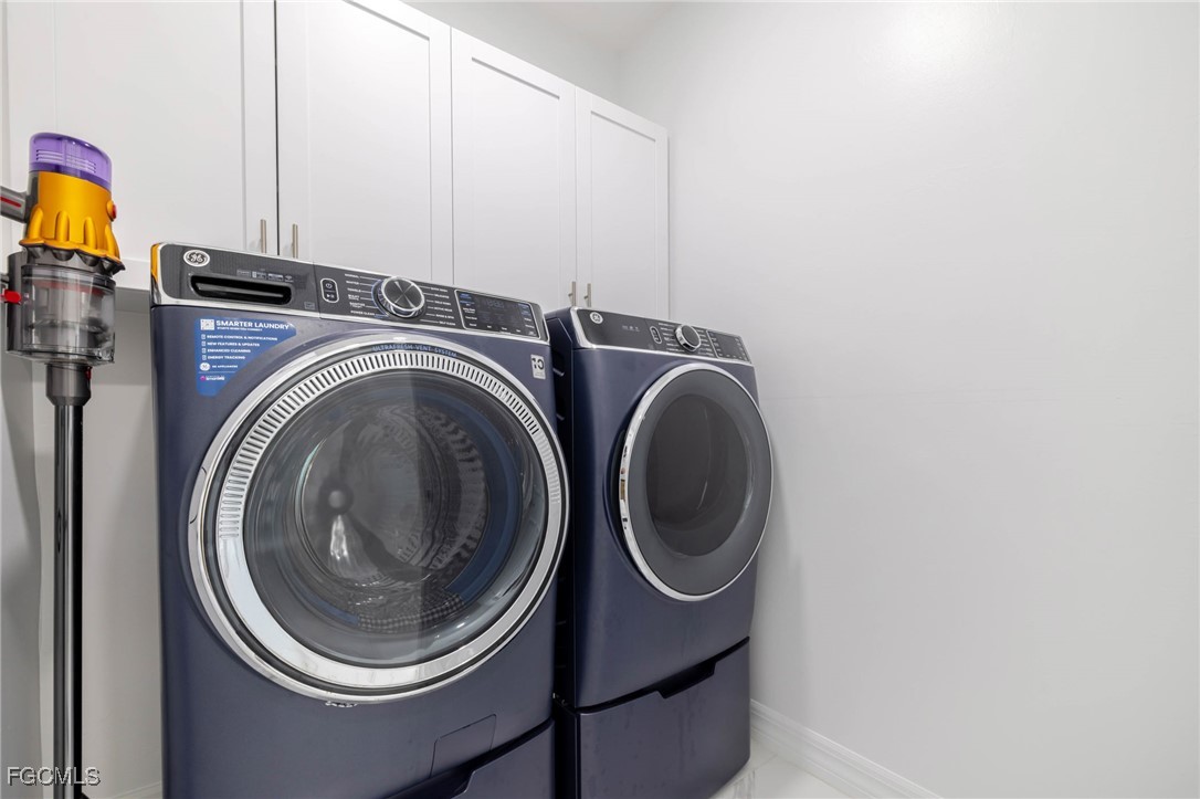 The primary suite feels expansive with two custom walk-in closets, a private bath featuring dual sinks, a large walk in glass-enclosed shower, and a separate water closet. Two guest bedrooms also include walk-in closets, and the guest bath doubles as a pool bath with a sleek glass shower. A well-equipped inside laundry room with cabinetry adds everyday convenience.