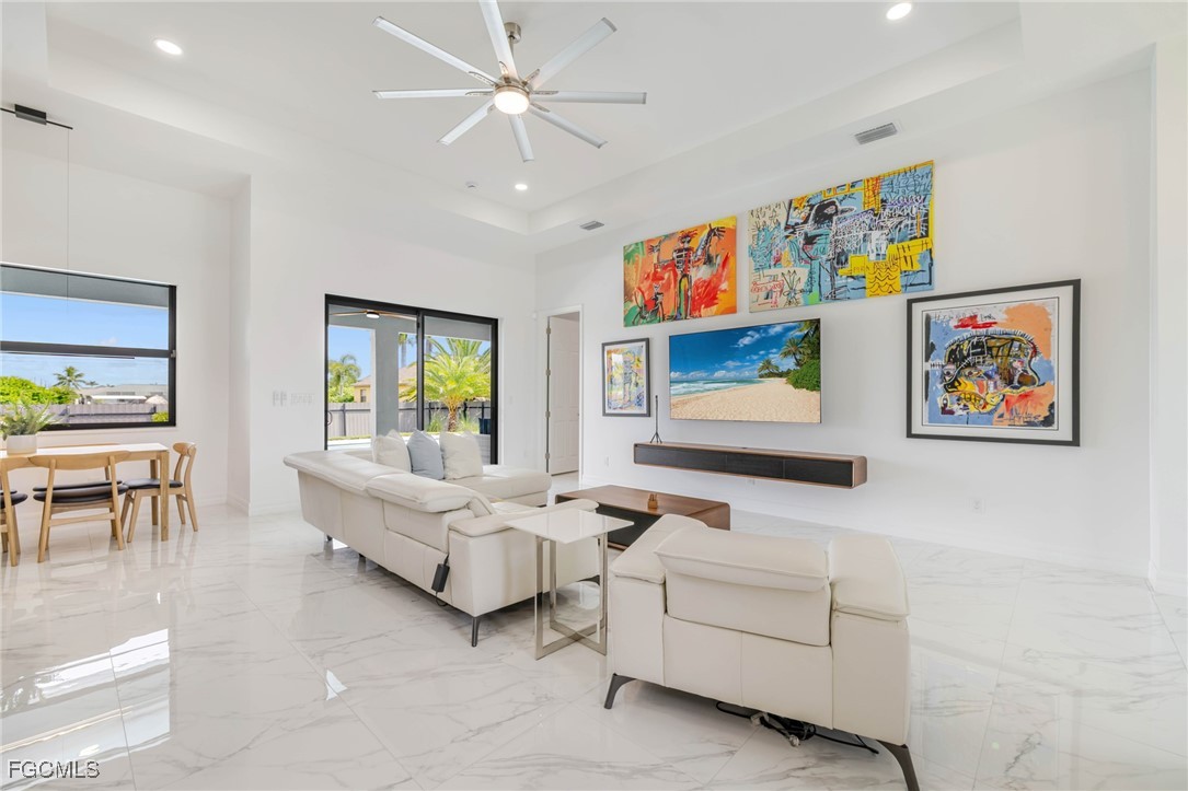 Step through the double-door entry into the light-filled great room where soaring 12-foot ceilings, polished large-format tile, and tray details set the tone. This home qualifies for a FEMA Letter of Map Revision, providing the option for the structure to be removed from the flood zone. Built in 2023 with CBS construction, this nearly 1,900 sqft 3-bedroom, 2-bath, den, 2-car garage heated pool home combines clean lines and modern finishes with an airy, open layout. Abundant windows and upgraded fixtures enhance the sense of space, creating a home designed equally for everyday comfort and effortless entertaining.