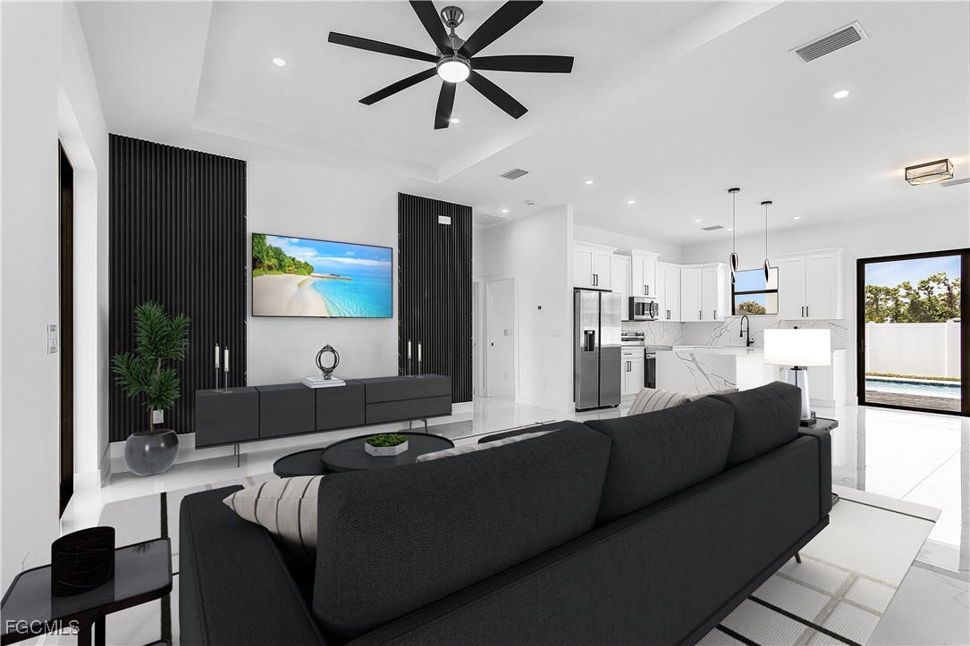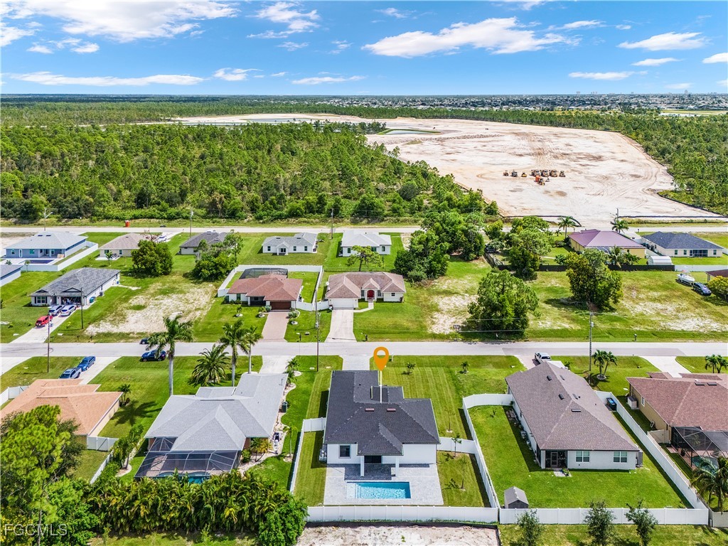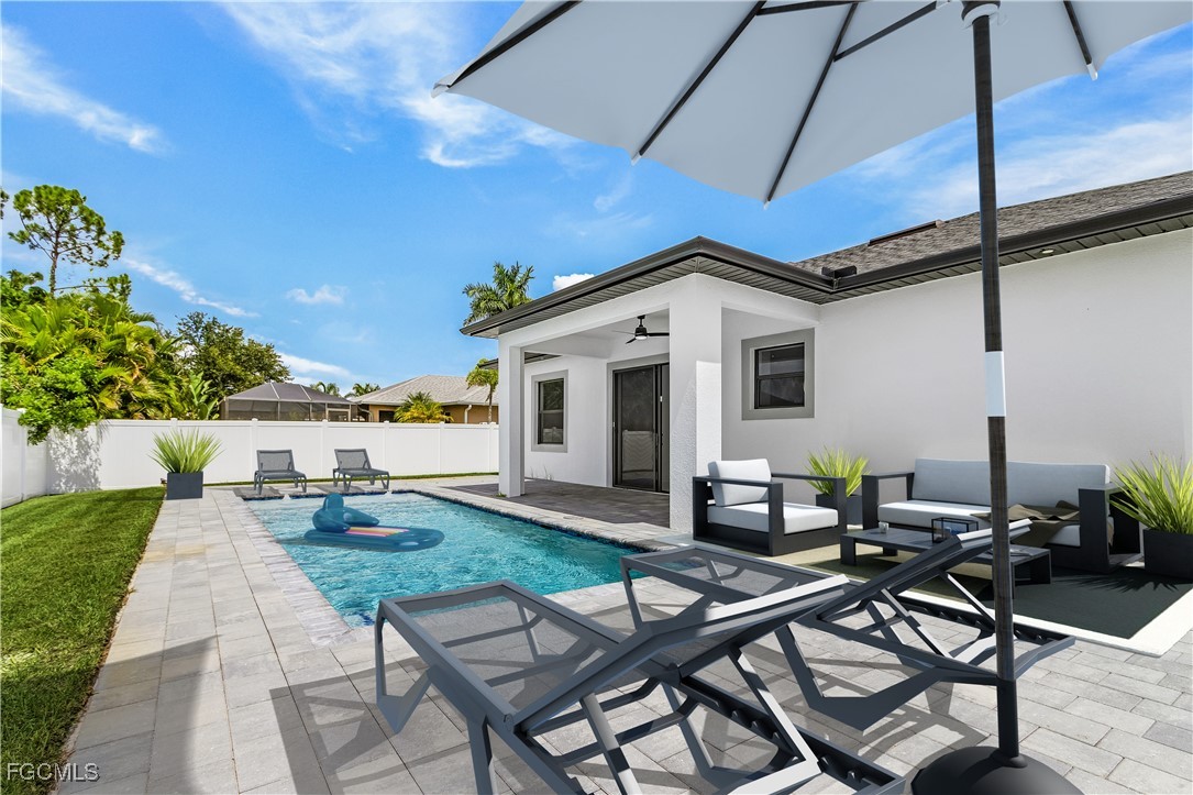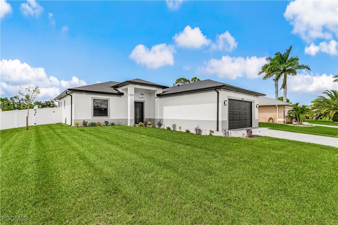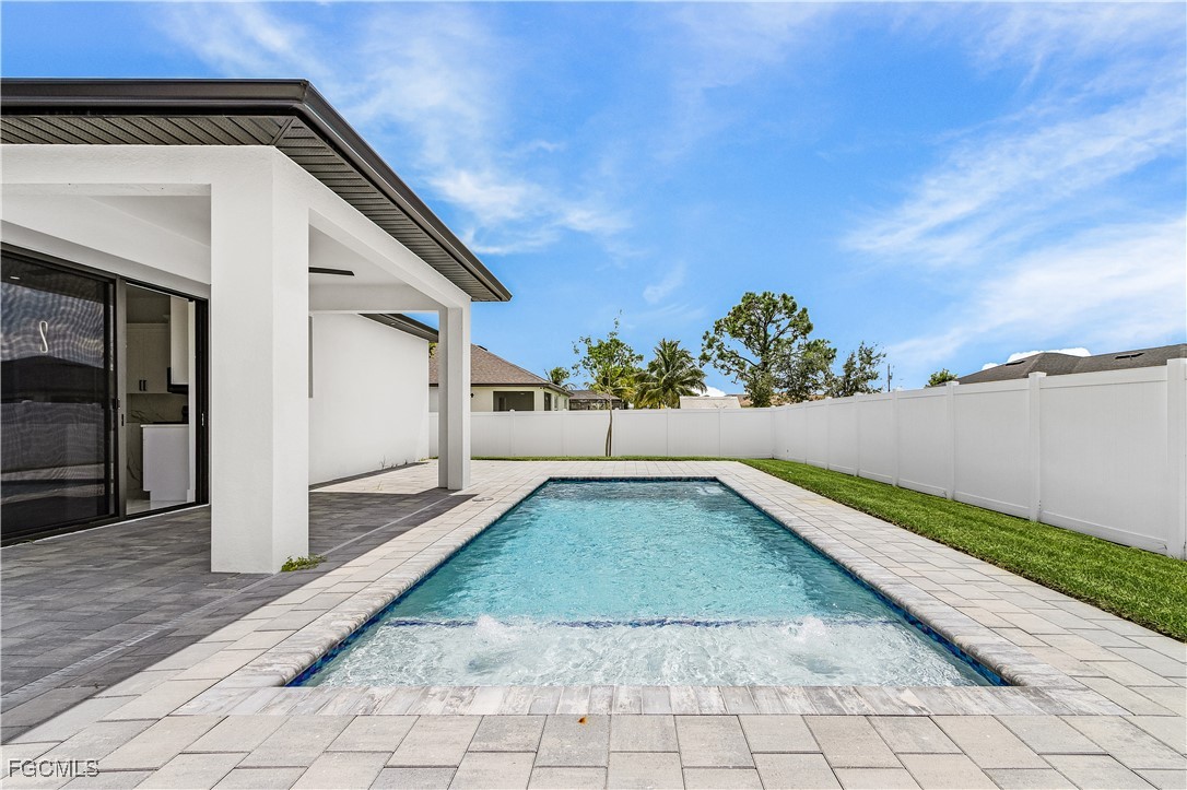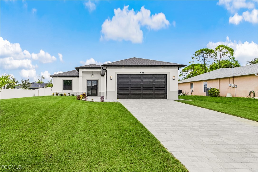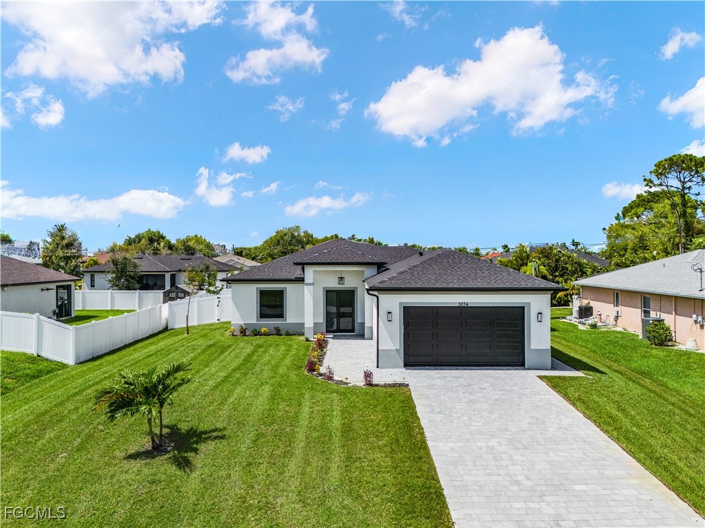 Welcome to 3034 NW 16th Place! Step into a home that balances bold design with everyday function in Cape Coral’s rapidly growing Northwest corridor, offering 4 bedrooms, 2 bathrooms, and a sparkling pool on a fully landscaped homesite. From the exterior you’ll notice clean architectural lines accented by pavered drive and lanai, fresh sod, 360-degree gutters, a full irrigation system, and custom LED lighting that makes the home glow after sunset, while the fenced backyard adds privacy and security. Inside, the layout is open yet defined, with ceilings climbing from 10 feet in the bedrooms to 12 and 13 feet in the living room, creating an airy volume rarely found in this price point. Impact windows and doors, R30 insulation, and epoxy-coated garage floors speak to durability and efficiency, while thoughtful finishes give the home a polished edge. The kitchen showcases quartz counters with a striking waterfall edge, stainless steel appliances, backsplash accents, soft-close cabinetry, custom closet-style storage, and a walk-in pantry that anchors the space, while the adjacent living room features a custom accent wall that elevates the feel from simple to standout. The primary suite delivers a private retreat with dual walk-in closets designed for organization, a glass-enclosed shower and dual vanity, while the remaining bedrooms are well-scaled, each with ceiling fans and natural light. Tile floors throughout make for seamless flow and easy upkeep. Outdoor living is effortless here: the pool and lanai invite year-round enjoyment, framed by pavers and designed for both gatherings and quiet relaxation. Every detail has been considered, from custom LED lighting inside and out, to closet shelving and storage systems, to the irrigation that keeps the landscape fresh and vibrant. Located near boat ramps, Pine Island Road, shopping, dining, and just a short drive to airports and Gulf access, this home offers both immediate comfort and future value in one of Cape Coral’s most active growth areas. 3034 NW 16th Place is not just another new build—it’s a property that combines practical upgrades with modern style, ready for its first chapter. Schedule your showing today.