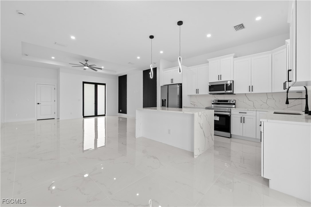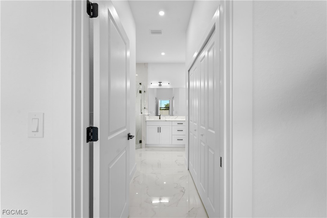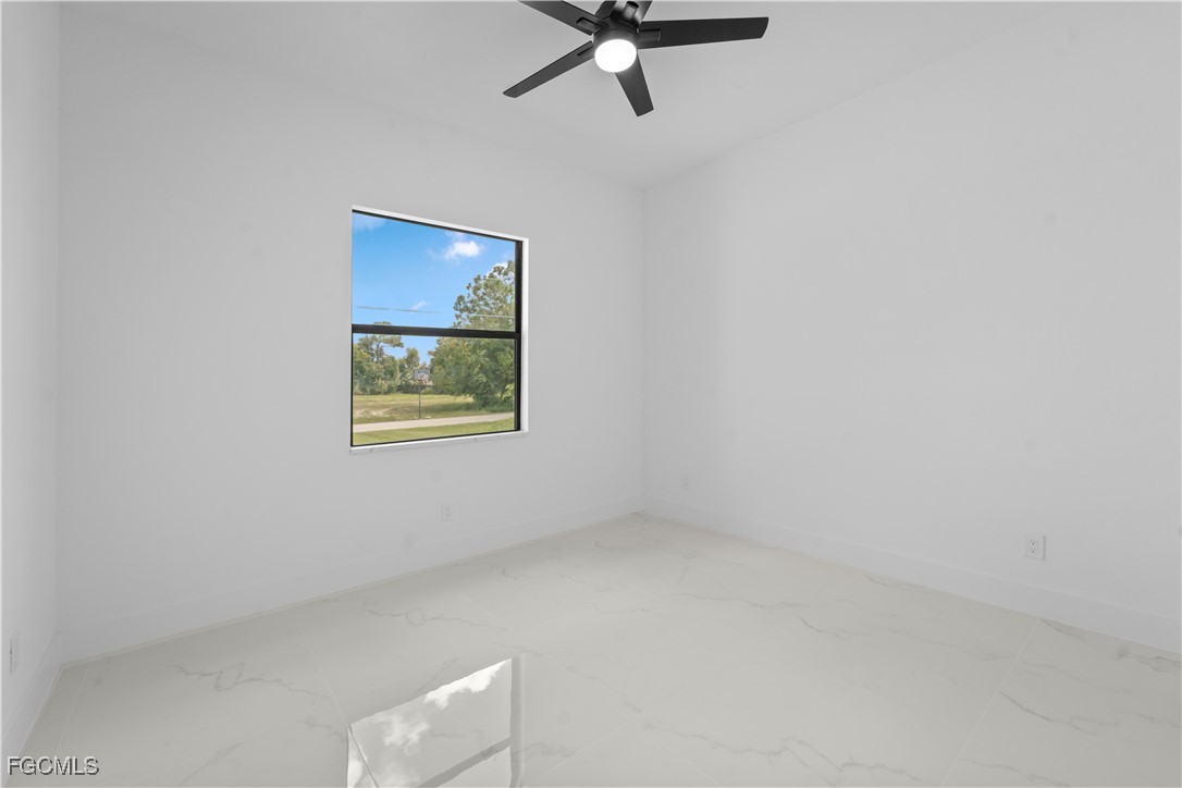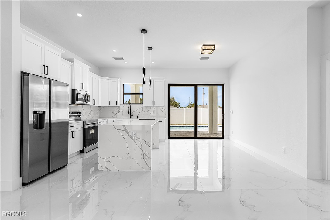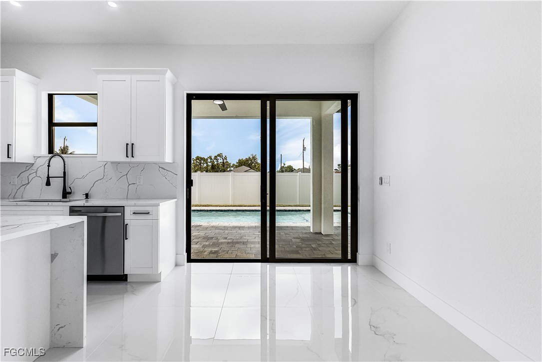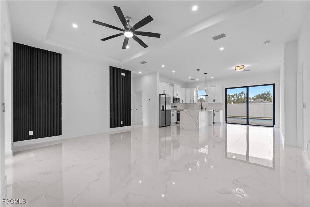 Welcome to 3034 NW 16th Place! Step into a home that balances bold design with everyday function in Cape Coral’s rapidly growing Northwest corridor, offering 4 bedrooms, 2 bathrooms, and a sparkling pool on a fully landscaped homesite. From the exterior you’ll notice clean architectural lines accented by pavered drive and lanai, fresh sod, 360-degree gutters, a full irrigation system, and custom LED lighting that makes the home glow after sunset, while the fenced backyard adds privacy and security. Inside, the layout is open yet defined, with ceilings climbing from 10 feet in the bedrooms to 12 and 13 feet in the living room, creating an airy volume rarely found in this price point. Impact windows and doors, R30 insulation, and epoxy-coated garage floors speak to durability and efficiency, while thoughtful finishes give the home a polished edge. The kitchen showcases quartz counters with a striking waterfall edge, stainless steel appliances, backsplash accents, soft-close cabinetry, custom closet-style storage, and a walk-in pantry that anchors the space, while the adjacent living room features a custom accent wall that elevates the feel from simple to standout. The primary suite delivers a private retreat with dual walk-in closets designed for organization, a glass-enclosed shower and dual vanity, while the remaining bedrooms are well-scaled, each with ceiling fans and natural light. Tile floors throughout make for seamless flow and easy upkeep. Outdoor living is effortless here: the pool and lanai invite year-round enjoyment, framed by pavers and designed for both gatherings and quiet relaxation. Every detail has been considered, from custom LED lighting inside and out, to closet shelving and storage systems, to the irrigation that keeps the landscape fresh and vibrant. Located near boat ramps, Pine Island Road, shopping, dining, and just a short drive to airports and Gulf access, this home offers both immediate comfort and future value in one of Cape Coral’s most active growth areas. 3034 NW 16th Place is not just another new build—it’s a property that combines practical upgrades with modern style, ready for its first chapter. Schedule your showing today.