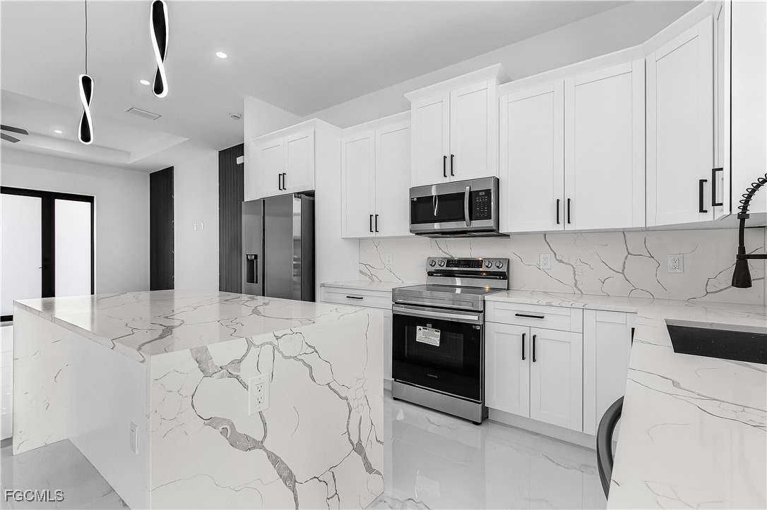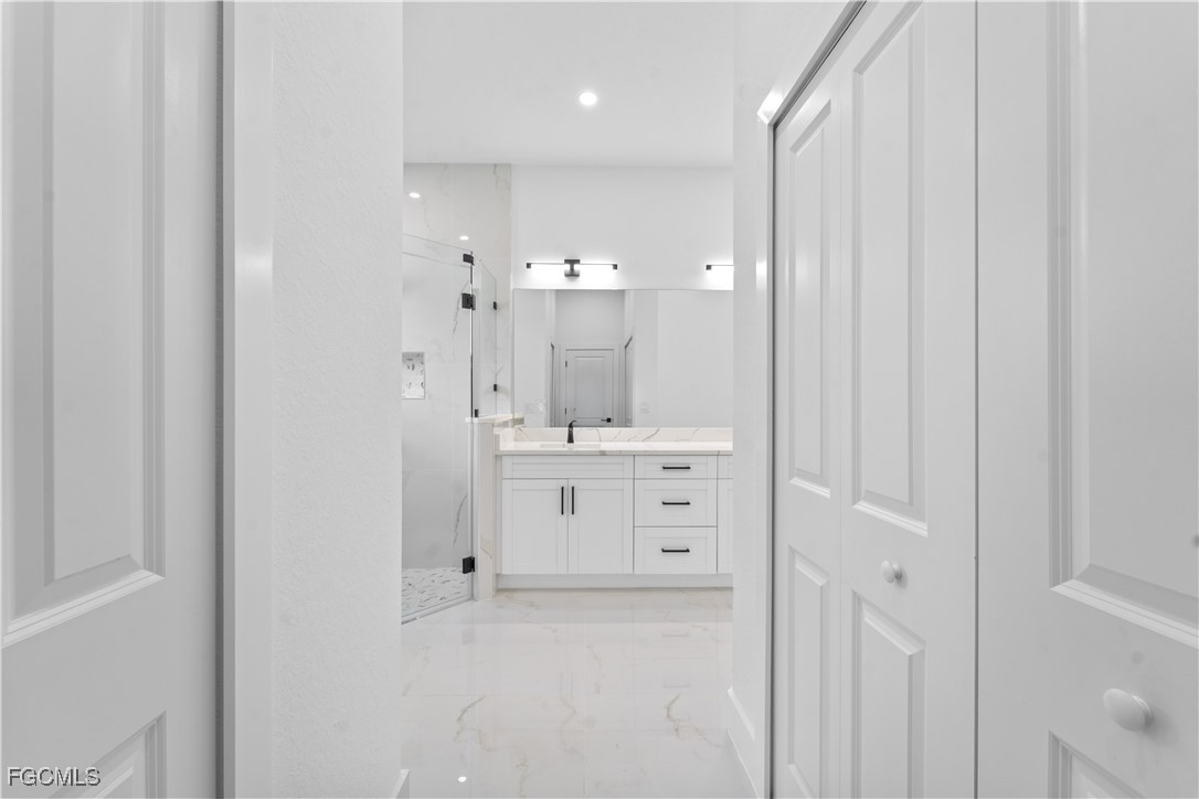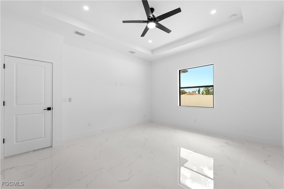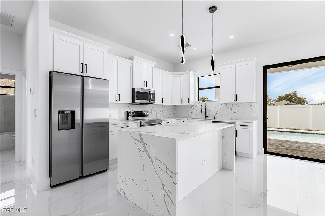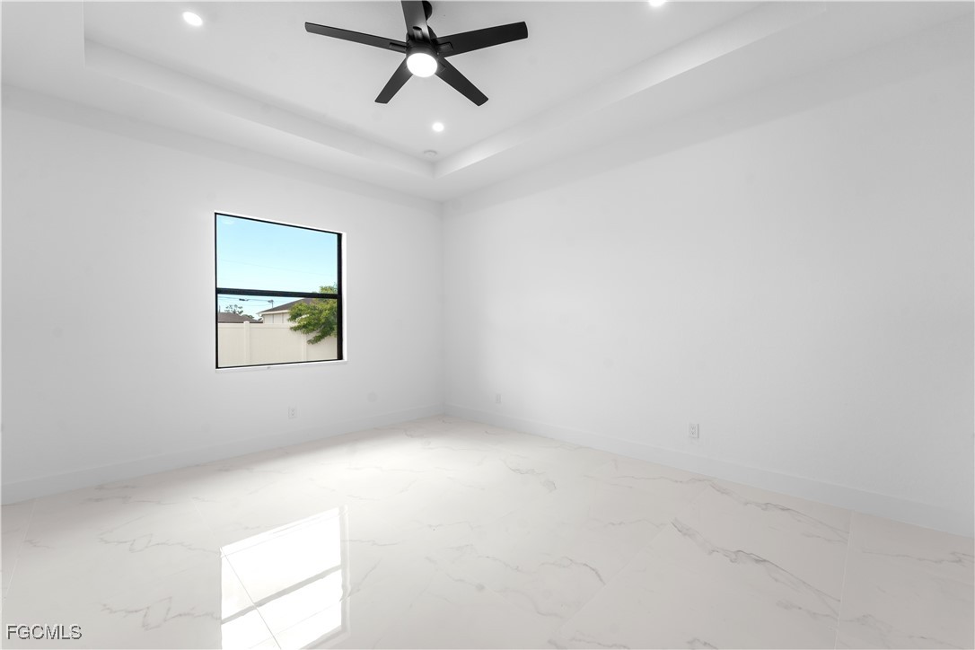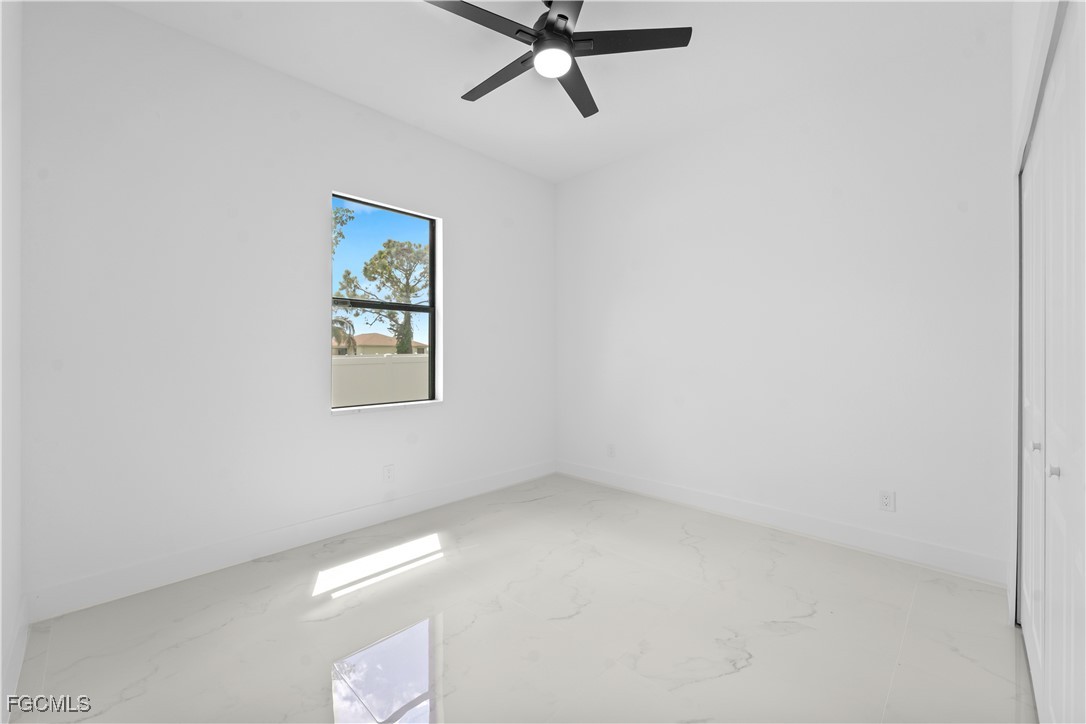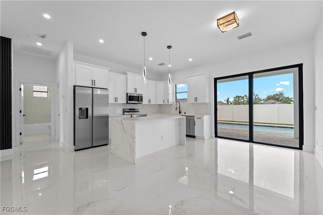 Welcome to 3034 NW 16th Place! Step into a home that balances bold design with everyday function in Cape Coral’s rapidly growing Northwest corridor, offering 4 bedrooms, 2 bathrooms, and a sparkling pool on a fully landscaped homesite. From the exterior you’ll notice clean architectural lines accented by pavered drive and lanai, fresh sod, 360-degree gutters, a full irrigation system, and custom LED lighting that makes the home glow after sunset, while the fenced backyard adds privacy and security. Inside, the layout is open yet defined, with ceilings climbing from 10 feet in the bedrooms to 12 and 13 feet in the living room, creating an airy volume rarely found in this price point. Impact windows and doors, R30 insulation, and epoxy-coated garage floors speak to durability and efficiency, while thoughtful finishes give the home a polished edge. The kitchen showcases quartz counters with a striking waterfall edge, stainless steel appliances, backsplash accents, soft-close cabinetry, custom closet-style storage, and a walk-in pantry that anchors the space, while the adjacent living room features a custom accent wall that elevates the feel from simple to standout. The primary suite delivers a private retreat with dual walk-in closets designed for organization, a glass-enclosed shower and dual vanity, while the remaining bedrooms are well-scaled, each with ceiling fans and natural light. Tile floors throughout make for seamless flow and easy upkeep. Outdoor living is effortless here: the pool and lanai invite year-round enjoyment, framed by pavers and designed for both gatherings and quiet relaxation. Every detail has been considered, from custom LED lighting inside and out, to closet shelving and storage systems, to the irrigation that keeps the landscape fresh and vibrant. Located near boat ramps, Pine Island Road, shopping, dining, and just a short drive to airports and Gulf access, this home offers both immediate comfort and future value in one of Cape Coral’s most active growth areas. 3034 NW 16th Place is not just another new build—it’s a property that combines practical upgrades with modern style, ready for its first chapter. Schedule your showing today.