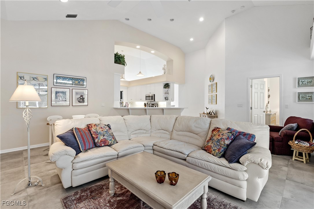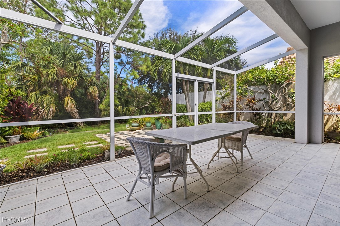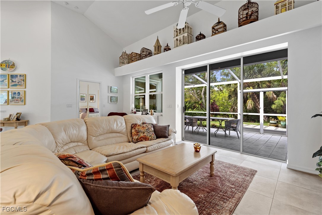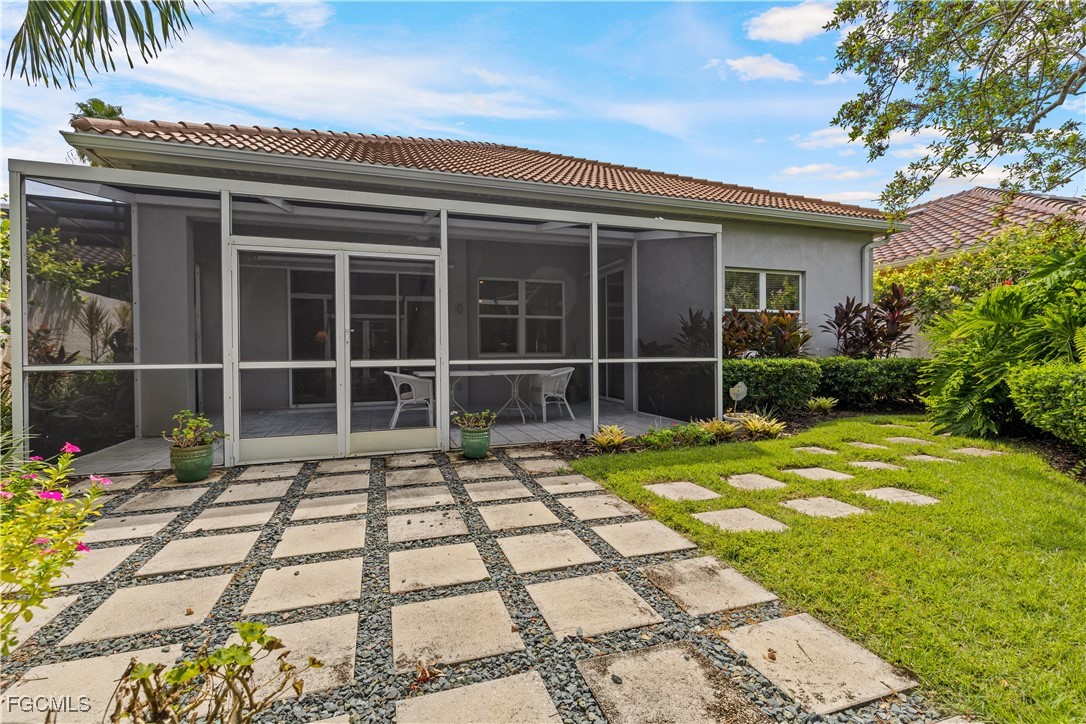 This remarkable residence offers three bedrooms and two bathrooms, complemented by a side-load two-car garage and soaring cathedral ceilings that enhance the sense of space. The property features a ***New tile ROOF installed in 2023, ***IMPACT-resistant windows, a newer air conditioning unit, and updated appliances, all constructed with insulated concrete forms for exceptional energy efficiency, resulting in an average electric bill of only $76. The heart of the home is the oversized kitchen. Cook, host, and gather with ease in a kitchen that truly delivers, endless cabinets , ample counter space and a large walk in pantry. There is more than enough storage in this kitchen. Expansive pocket sliders lead to an extended screened lanai and paver patio, providing a picturesque view of the private, gorgeously landscaped outdoor area, ideal for both entertaining and relaxation. The primary bedroom includes sliders to the lanai, an en suite bathroom with dual sinks, a soaking tub, a separate shower, and a walk-in closet. The spacious layout features two living areas, with the front room currently utilized as a large formal dining space, offering versatile options for use. Casa Del Lago amenities include gated access, a clubhouse, playground, tennis courts, pickle ball, basketball hoops, a community pool and spa, cable, internet, lawn care, irrigation, and an exercise room. Low HOA fees and no flood insurance required. Conveniently located on Six Mile Cypress, residents can enjoy nearby walking paths and a nature preserve with trails, as well as proximity to Whole Foods, The Twins Stadium, Cooper's Hawk restaurant, and a variety of shopping and dining options, with easy access to I-75, the airport, and beautiful beaches.