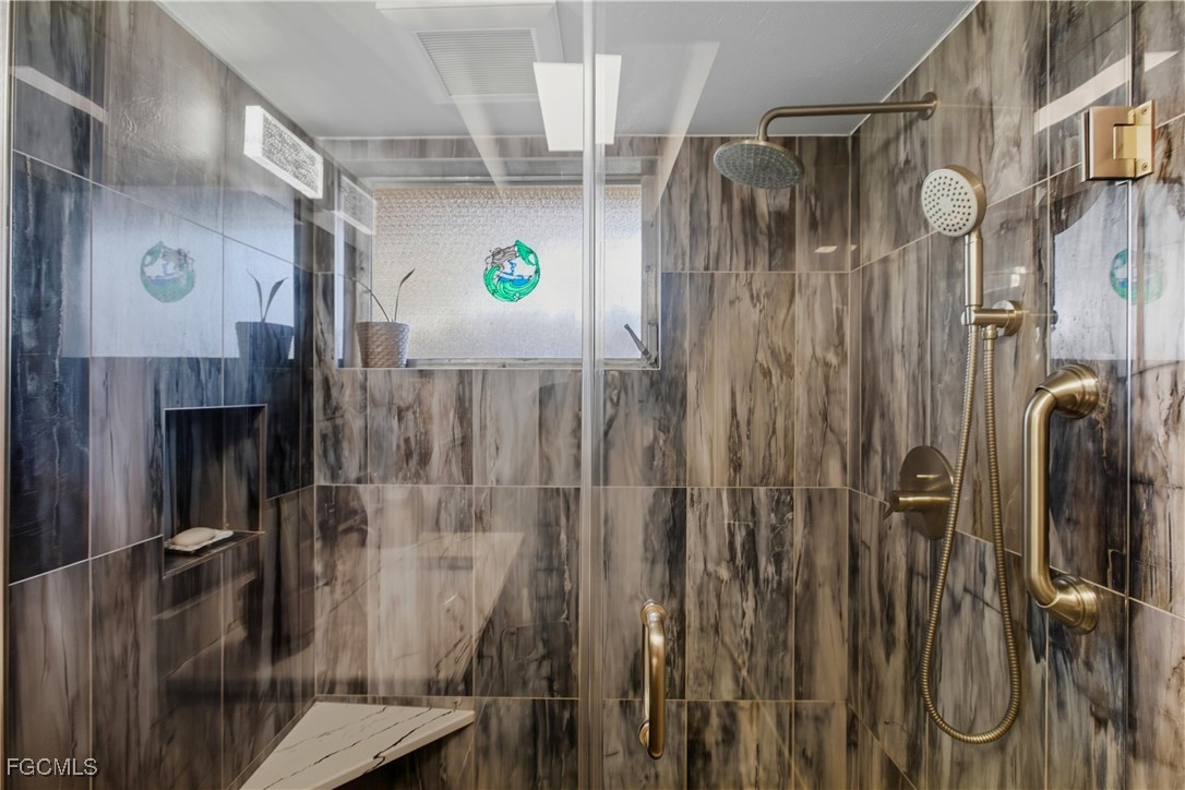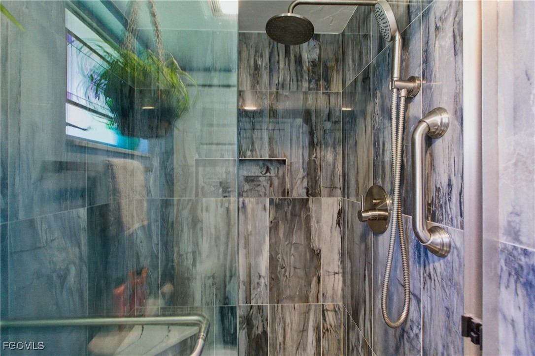 The primary suite offers direct lanai access, dual closets, and a spa-inspired bathroom with glass shower doors, multiple showerheads, and finishes that echo the kitchen’s modern style. A junior ensuite up front functions perfectly as a mother-in-law or guest studio suite, featuring its own private bath and wall-length closets. Bedrooms three and four share a luxurious pool bath with marble tile, glass enclosure, and convenient access to the lanai so guests can dry off before heading inside.