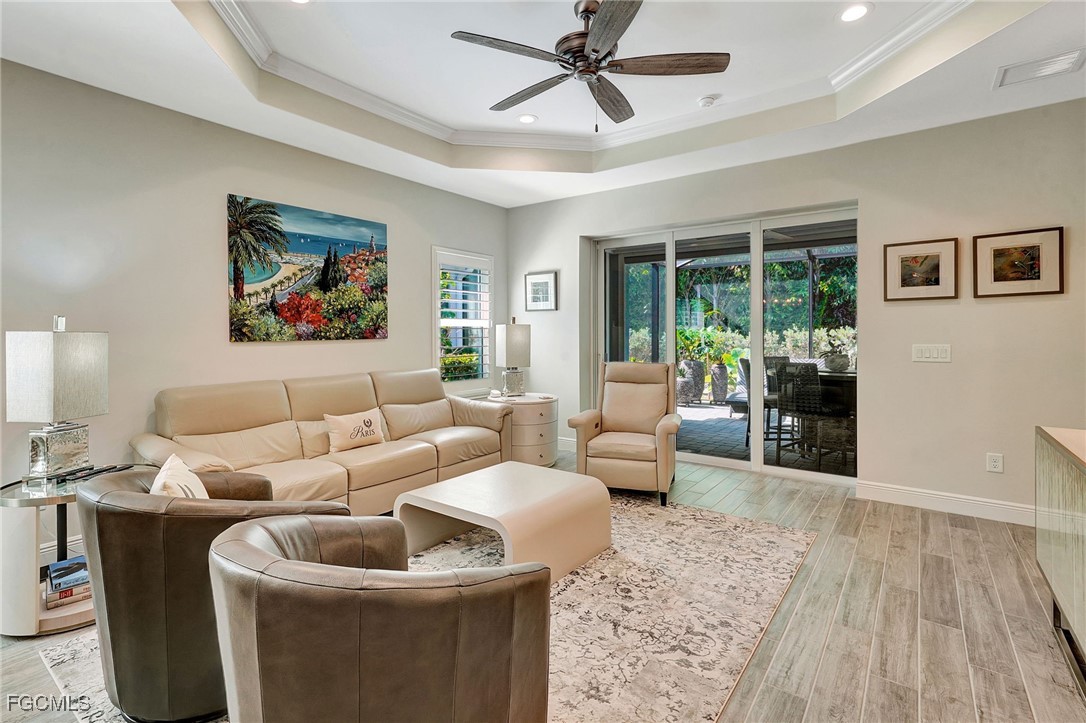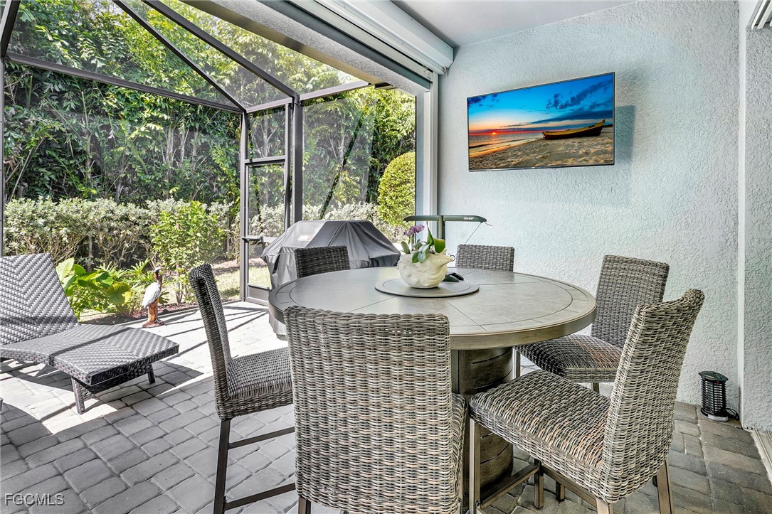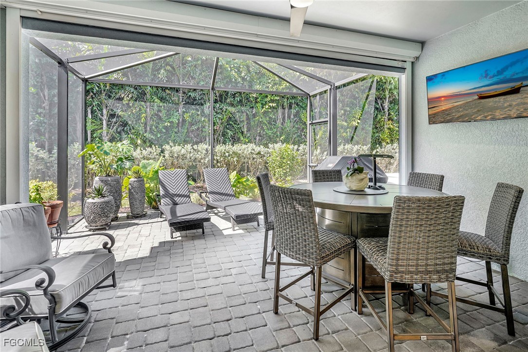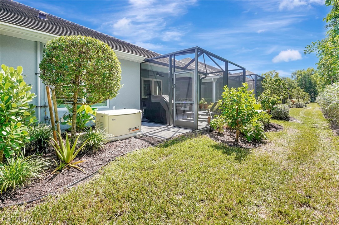 This beautifully maintained three-bedroom plus den, two-bath villa offers approximately 1,840 square feet under air and a total area of approximately 2,775 square feet, blending comfort, quality and peace of mind. Designed with efficiency and safety in mind, the home features a 22KW Generac natural gas whole-house generator, CAT 5 impact-rated windows and doors, Kevlar Storm Smart lanai screens, Ring doorbell security system with cameras and a whole-house surge protector in the electrical panel.