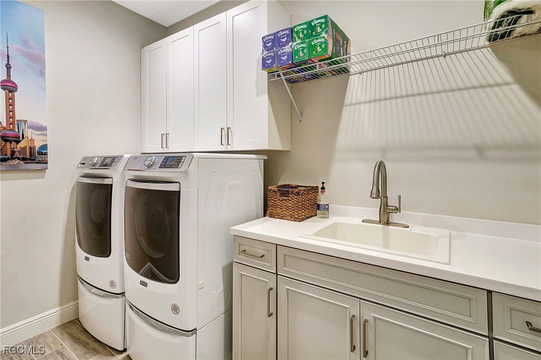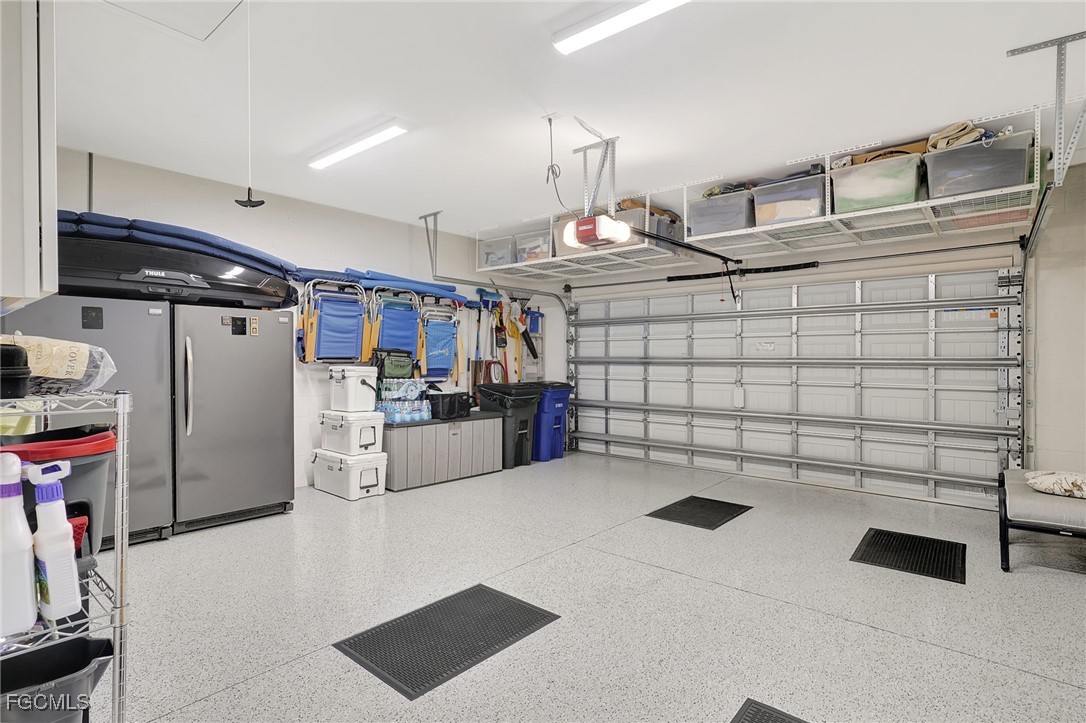 The laundry room features a newer Maytag washer and dryer (with 5-year warranty), cabinetry and a convenient utility sink, while every closet has been enhanced with additional shelving for extra storage. The garage offers exceptional functionality with epoxy flooring, 4x8 suspended shelving, built-in cabinets, drop-down attic stairs and attic flooring in the garage area only for added space.
