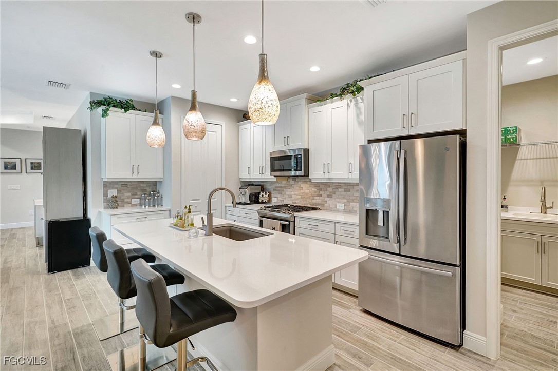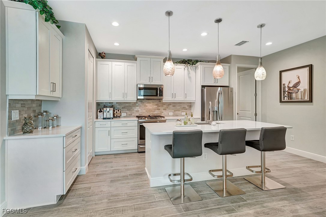 Inside, thoughtful upgrades include plantation shutters on every window, upgraded tile flooring throughout, recessed lighting in all rooms and on the lanai and a Nest Smart thermostat for energy efficiency. The kitchen is appointed with quartz countertops, under-cabinet lighting, a pantry, an upgraded composite sink, soft-close cabinetry and natural gas appliances.