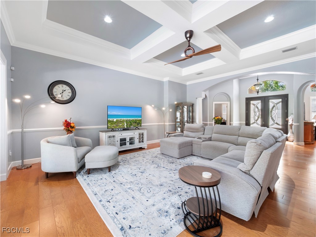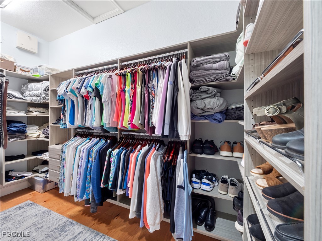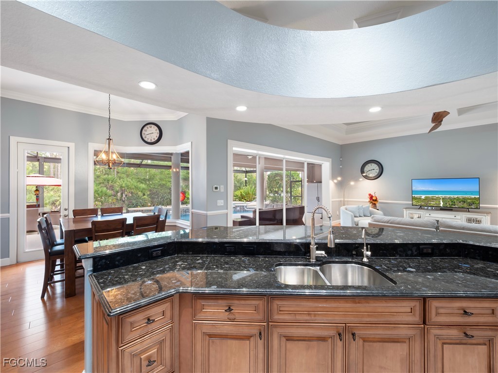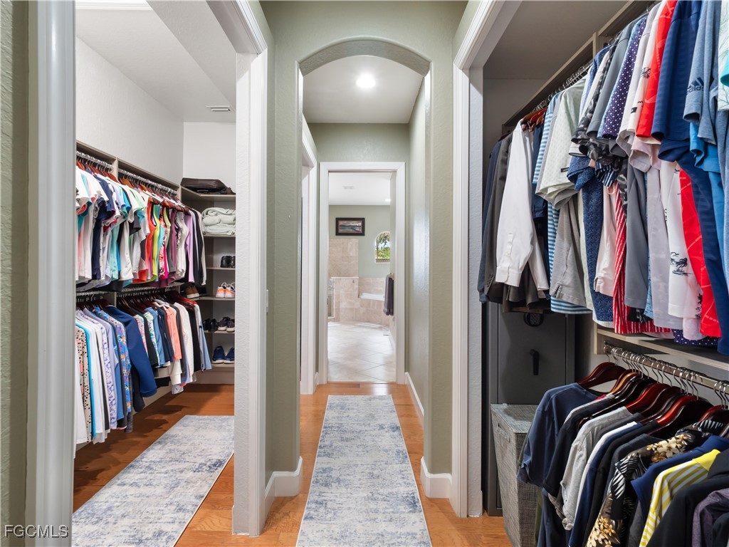 The heart of the home is the spacious main living area, seamlessly connected to the custom kitchen boasting a large center island, granite countertops, soft-close cabinetry, and new stainless-steel appliances, including a brand-new double oven and under-sink RO water system & a whole home water softener system. Durable tile and hardwood flooring flow throughout the home, offers a clean and cohesive look. The owner’s suite offers a true retreat with his-and-hers closets with custom built-in shelving, and a luxurious ensuite bath featuring dual sinks, a walk-in shower, and a separate soaking tub. The split floor plan ensures privacy for guests or family members with their own dedicated wing and baths.