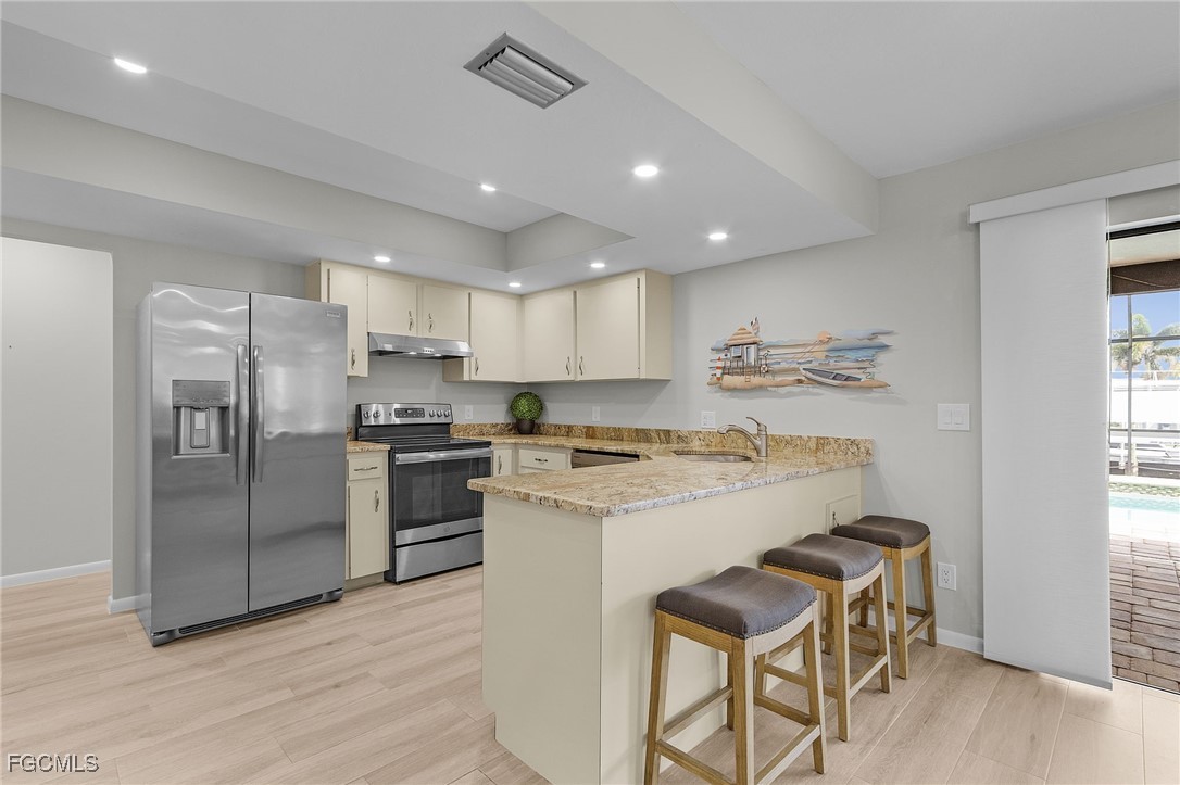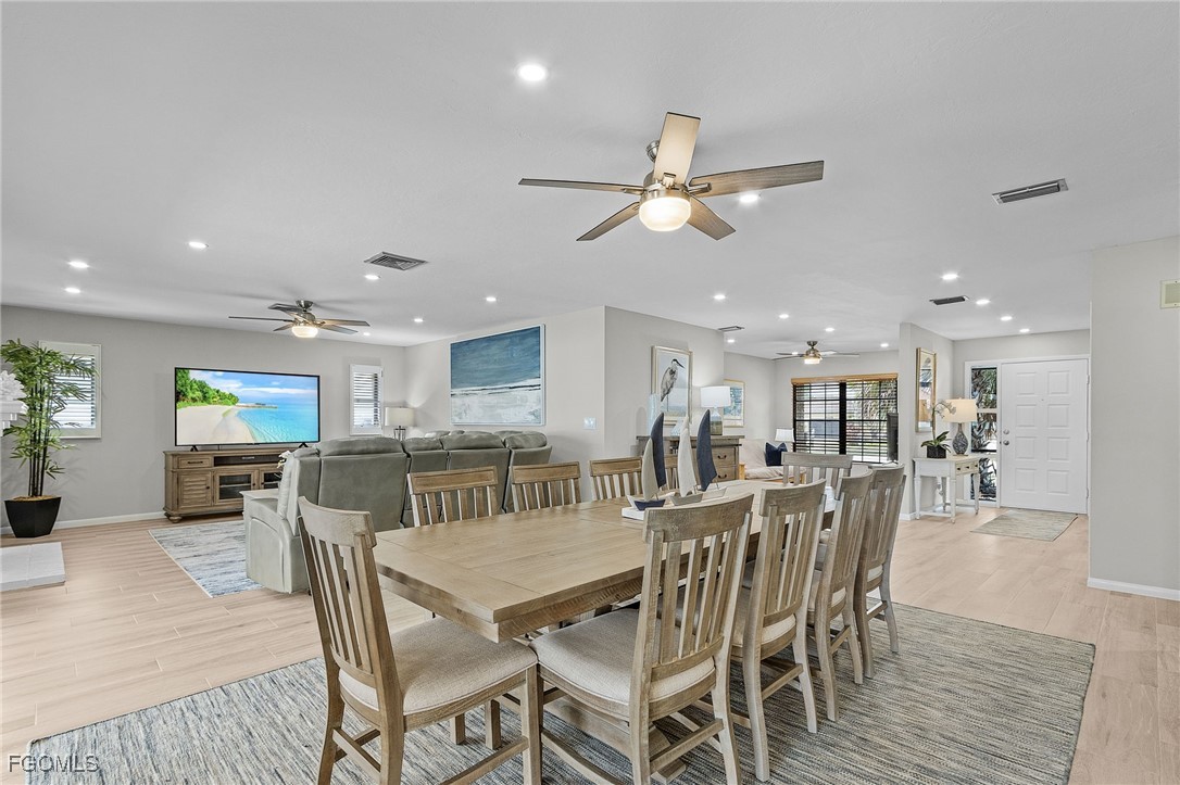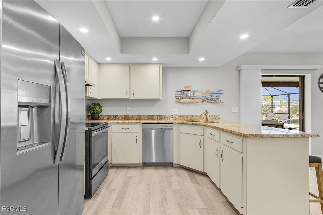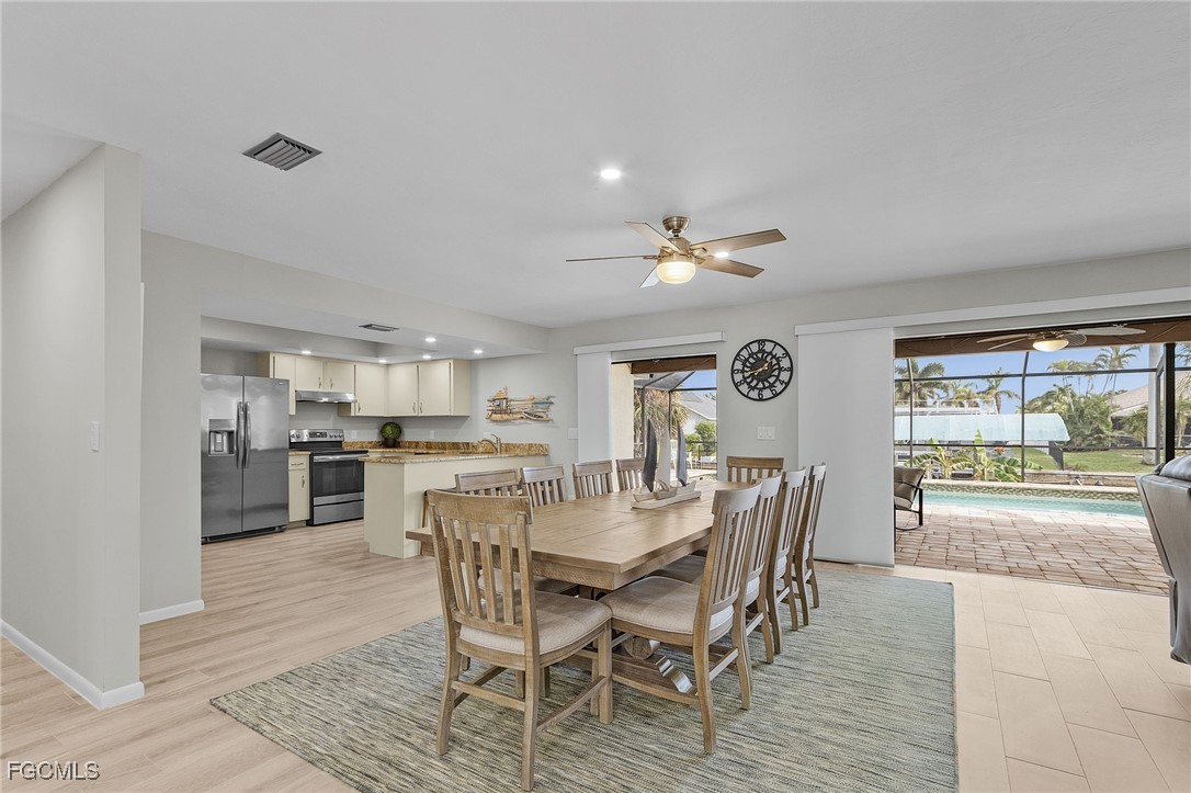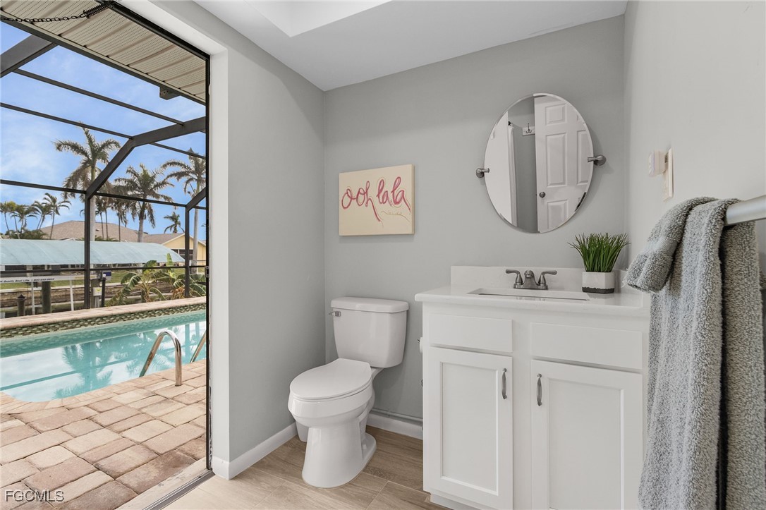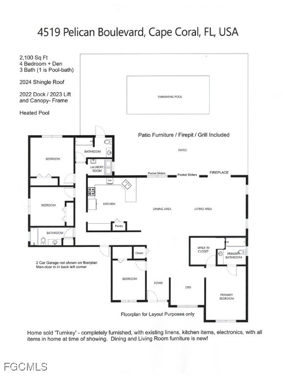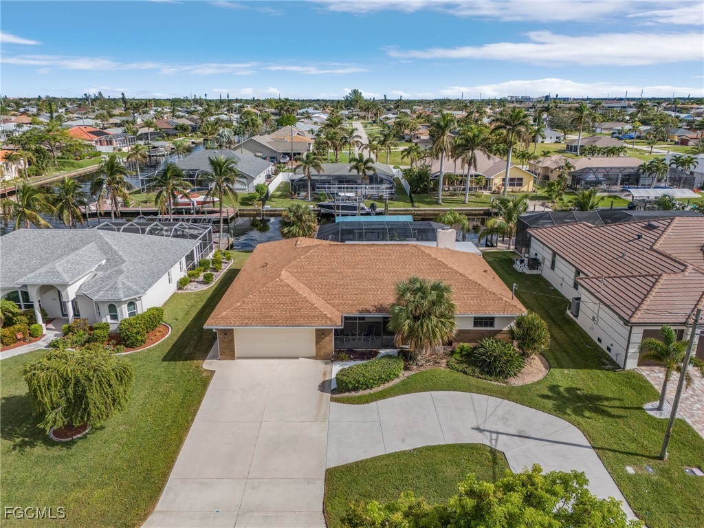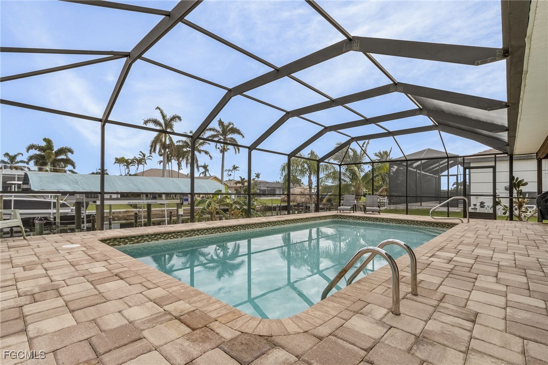 GULF ACCESS POOL home located in the highly desirable Southwest Cape Coral is a MUST see! This 4 bedroom +, 3 bath home has an 2,100 sq ft Spacious OPEN SPLIT floor plan. The home comes completely furnished – TURNKEY so all you need is your clothes and toothbrush. The kitchen has granite countertops, stainless-steel appliances, pantry, breakfast bar, coffee bar and direct entry from dining area and entry into hallway to guestrooms, guest bath and laundry room. The spacious formal dining is open to living room and kitchen with unobstructed view of SPACIOUS lanai, pool and canal. The spacious primary suite has walk-in closet, tub/shower and linen closet in the bathroom. The screened lanai has pavers throughout, heated pool, comes with all patio furniture, firepit, and grill. This outdoor living space is perfect for ENTERTAINING and soaking up the abundant Florida sunshine around the pool. The 2022 dock has a walk-around boat slip, 2023 10,000 lb lift, 2023 boat cover canopy system, and large seating area. Home is close to canal intersection and is only about a 35-minute casual boat ride to river and is conveniently located close to Cape Coral Parkway for easy access to dining, nightlife, and shopping. This is a non-smoking home, 2024 Roof, 11/2020 AC 2 car garage, screened front patio, circular driveway for plenty of guest parking, and ALL assessments are PAID, In Flood Zone but home has never had flood damage! This would make a GREAT investment seasonal rental property since it sleeps 10 as furnished!! The dining room and living room furniture is new, with oversize TV!! Please click the interactive 3D video and bouncing icons! Call today for your private tour!