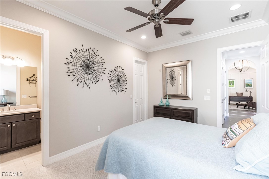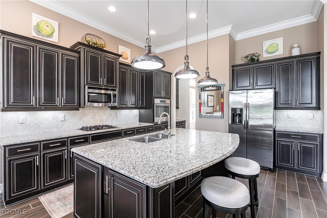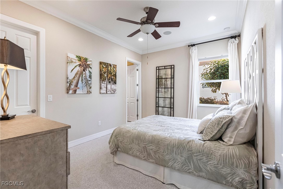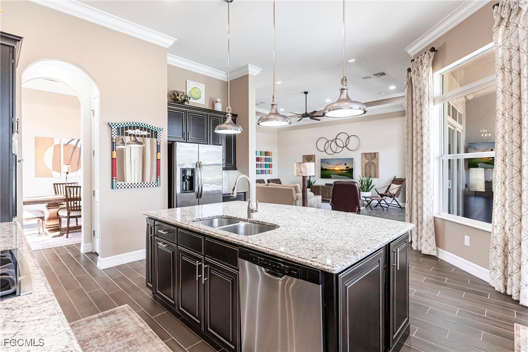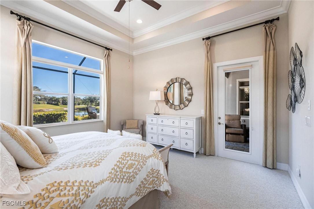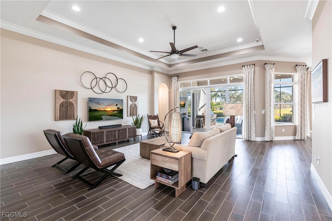 Why buy NEW when you can have this PREVIOUS MODEL home with 3 Bedrooms with EN-SUITE BATHROOMS, Den, CUSTOM POOL/SPA and upgrades throughout. Welcome to your dream home! This beautiful Buttonwood floor plan is loaded with features, making it move-in ready. This stunning single-family home boasts 2,662 sq. ft. of living space, 3 bedrooms plus a den, 3.5 bathrooms, and an outdoor space that will make you feel like you are at a resort paradise. Included with the home are the following upgrades: crown molding throughout, tray ceilings in the main living areas and primary bedroom, luxury tile floors throughout the home except for the bedrooms, granite countertops with an attractive backsplash in the kitchen, a large wet bar in the family room, a spacious laundry room with extra cabinet storage and a sink, upgraded lighting and window treatments, water softener, phantom door at the entry and a separate dining area adjacent to the kitchen, just to name a few. As you enter through the large foyer, you will find a spacious den to your right with a large attractive archway, and guest bedrooms to your left, providing split bedrooms from the master suite. All bedrooms are en-suite with ample closet space and privacy, providing plenty of space for you and your family. The family room is open and adjacent to the kitchen, dining area, and primary bedroom suite. A breakfast nook dining area offers a spectacular view of the lanai and lake. The outdoor lanai space is a main feature of the home, with all the bells and whistles you could want. It features an EXTENDED LANAI area under the roof for added shade, a full outdoor kitchen with a unique backsplash, a custom pool and luxury spa with attractive tile and coping, SMART TECHNOLOGY for pool and spa controlled by your phone, an electric heater and multiple seating areas for sunbathing and relaxing. The extended garage has epoxy flooring and can easily store two vehicles. This home has everything you need and is offered at an attractive price. Verandah offers many amenities, including 2 championship golf courses designed by Jack Nicklaus and Bob Cupp, tennis, pickleball, an updated fitness center with an attendant, bocce, kayaks, a dog park, a playground, 9 miles of jogging and walking paths, multiple restaurants, and a social calendar full of events, classes, and activities to meet everyone's interests. Your place in paradise awaits - come see this model home before it's gone! You will not be disappointed.