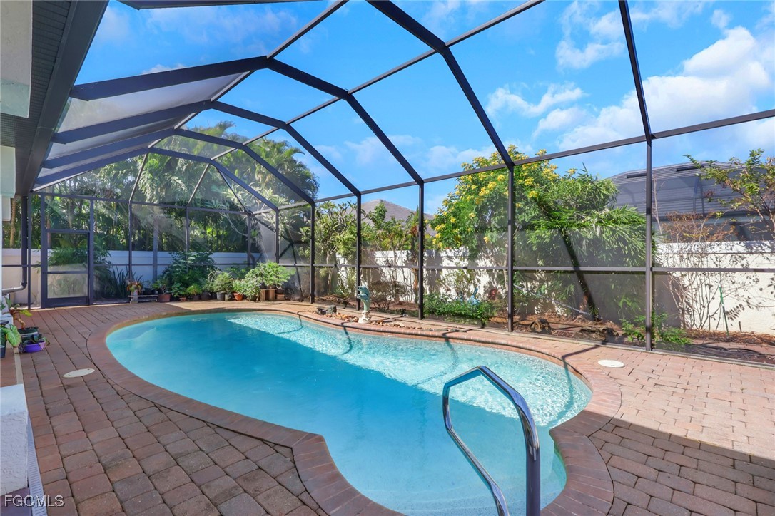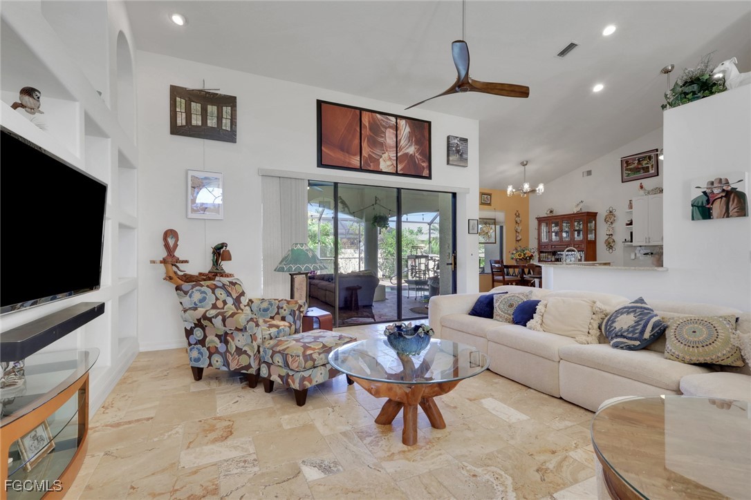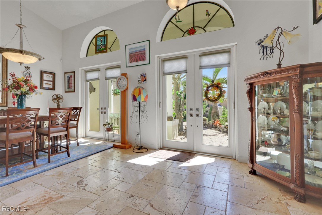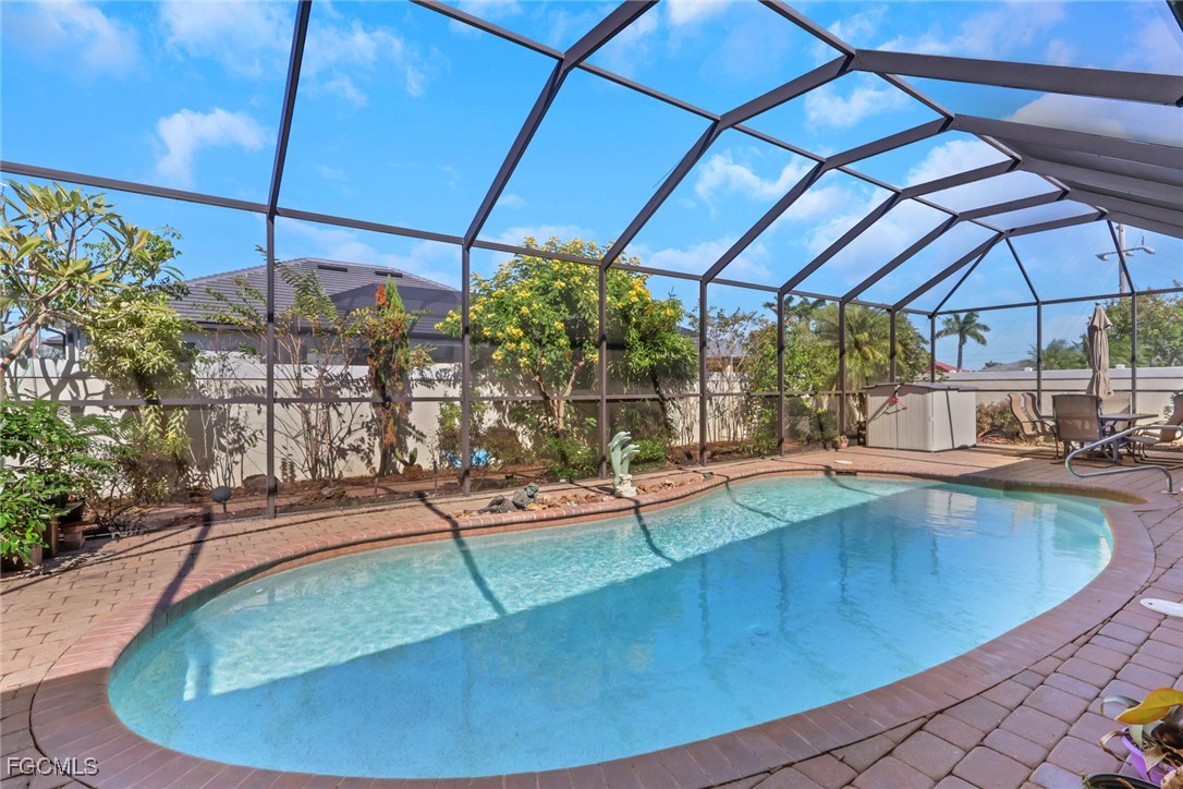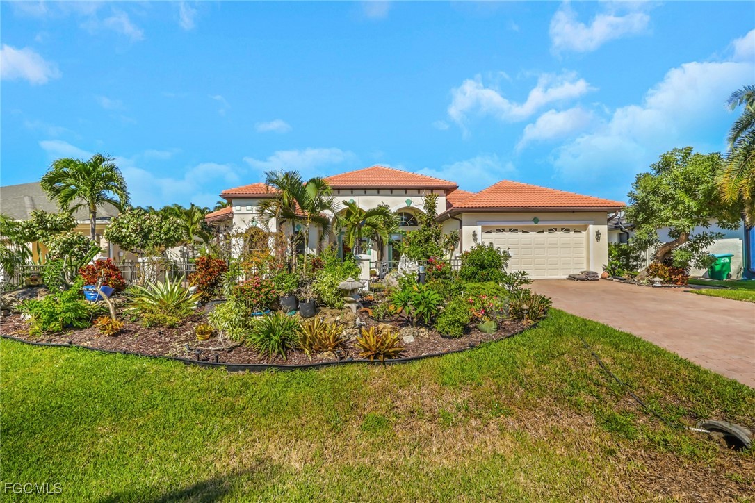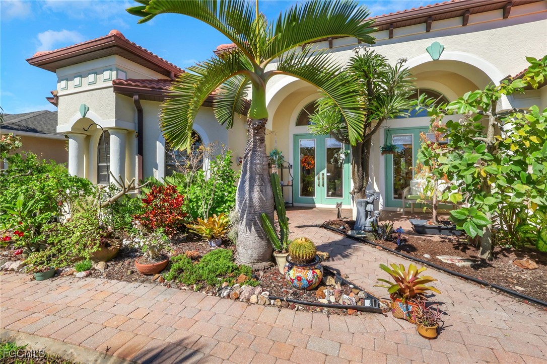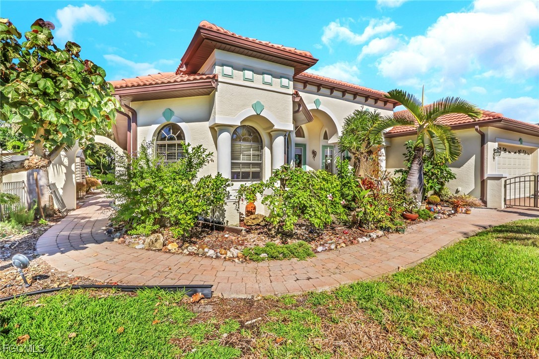 NEW TILE ROOF 2023 & NO FLOOD ZONE! Located in the prettiest part of SW Cape Coral, West of Sands and near Cape Coral Pkwy. This custom Starlight built home is a true Mediterranean Masterpiece, over 2,200 sq ft under air, with 3 bedrooms, 2 bathrooms and a great room with soaring ceilings. Featuring warm colors and classic detailing. Custom touches include custom built-ins (currently displaying an art collection), architectural details throughout the home, French doors that open to the front garden for more natural light and breezes, tray ceilings in every bedroom. The Pocket sliding glass doors open up to a large under truss lanai, overlooking the custom pool, making this the perfect place to entertain family and friends. Classic white kitchen with plenty of cabinets for storage and granite countertop that overlooks the family room and into the pool area through mitered glass window. Spacious pavered screened in lanai for sunning is surrounded by an actual concrete block wall for privacy. Matching paver walkways weave through the gardens and around the pool enclosure. The entire yard is beautifully landscaped with mature tropical landscaping, making this a true private paradise. The large Primary suite features large walk-in closets, dual vanities, a soaking tub and a walk-through shower. Tile floors throughout, with beautiful travertine tile in the French patten in the great room and kitchen areas (no carpet!). The Southwest is the prettiest part of Cape Coral, with it's million-dollar waterfront homes and close to dining, shopping and entertainment.