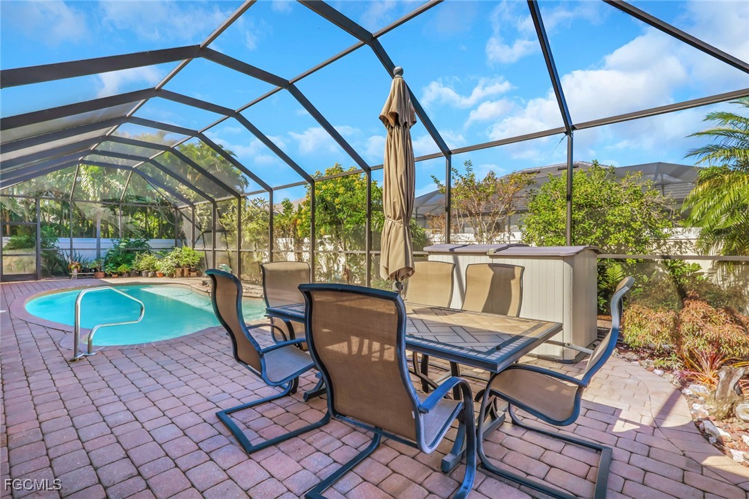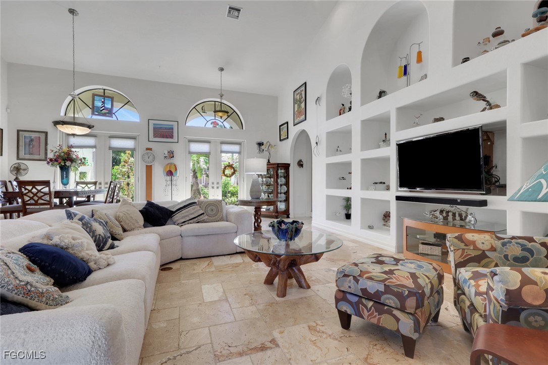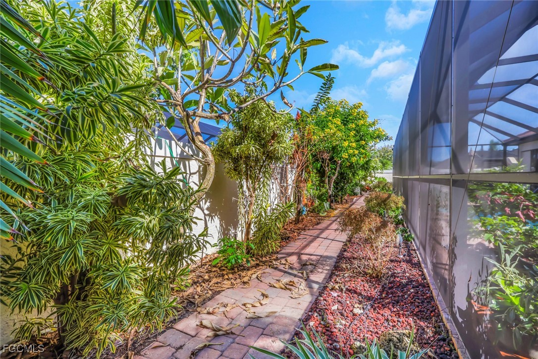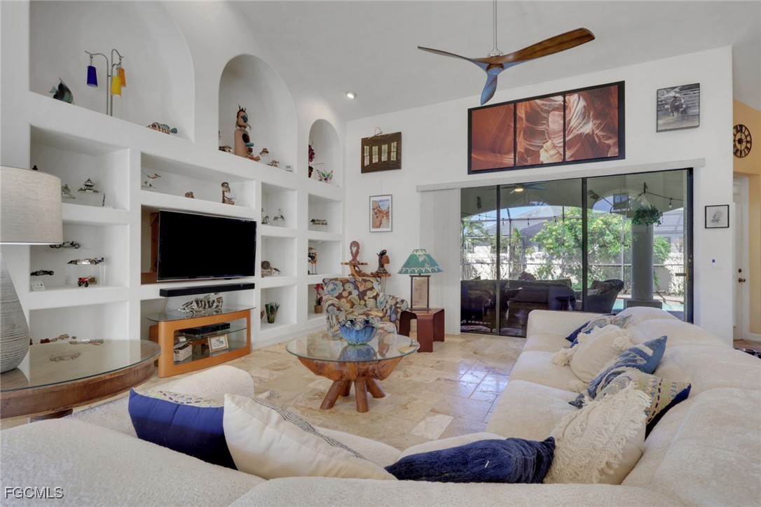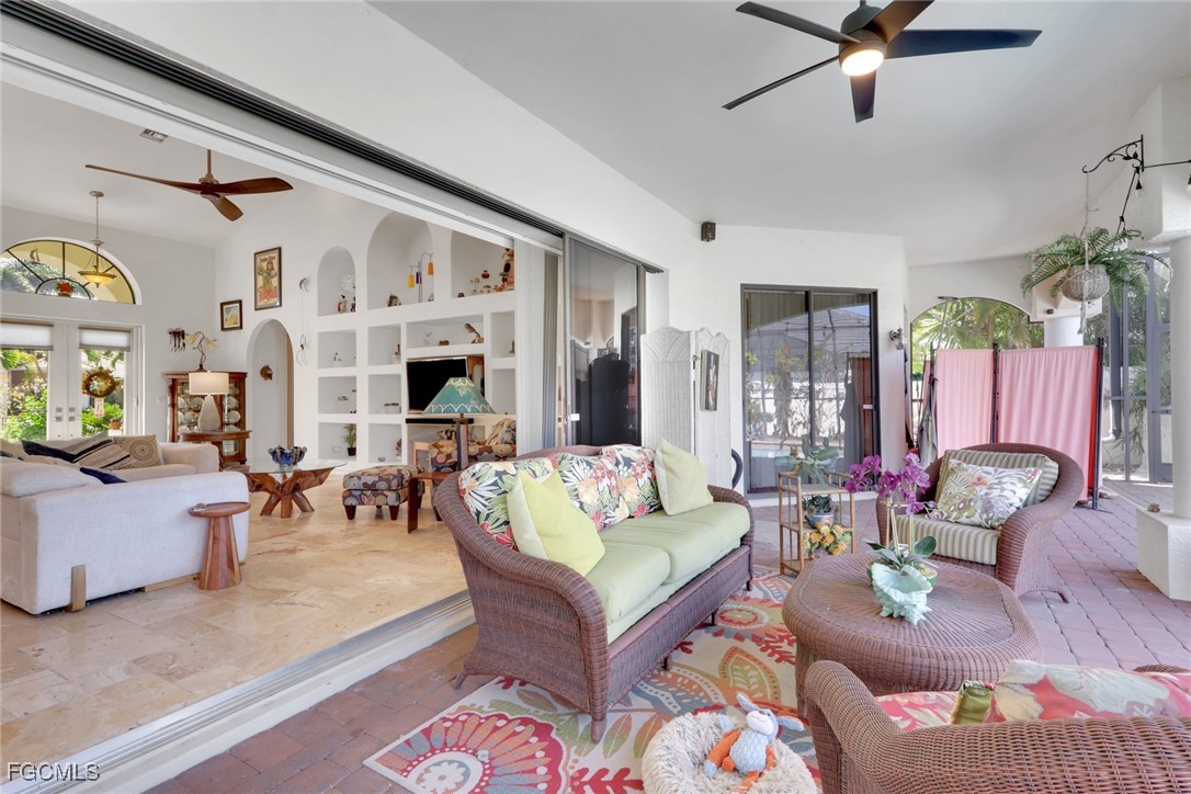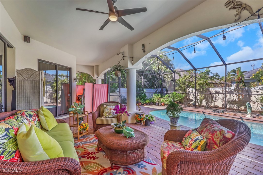 NEW TILE ROOF 2023 & NO FLOOD ZONE! Located in the prettiest part of SW Cape Coral, West of Sands and near Cape Coral Pkwy. This custom Starlight built home is a true Mediterranean Masterpiece, over 2,200 sq ft under air, with 3 bedrooms, 2 bathrooms and a great room with soaring ceilings. Featuring warm colors and classic detailing. Custom touches include custom built-ins (currently displaying an art collection), architectural details throughout the home, French doors that open to the front garden for more natural light and breezes, tray ceilings in every bedroom. The Pocket sliding glass doors open up to a large under truss lanai, overlooking the custom pool, making this the perfect place to entertain family and friends. Classic white kitchen with plenty of cabinets for storage and granite countertop that overlooks the family room and into the pool area through mitered glass window. Spacious pavered screened in lanai for sunning is surrounded by an actual concrete block wall for privacy. Matching paver walkways weave through the gardens and around the pool enclosure. The entire yard is beautifully landscaped with mature tropical landscaping, making this a true private paradise. The large Primary suite features large walk-in closets, dual vanities, a soaking tub and a walk-through shower. Tile floors throughout, with beautiful travertine tile in the French patten in the great room and kitchen areas (no carpet!). The Southwest is the prettiest part of Cape Coral, with it's million-dollar waterfront homes and close to dining, shopping and entertainment.