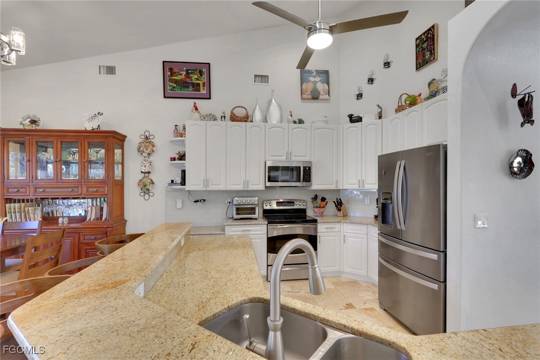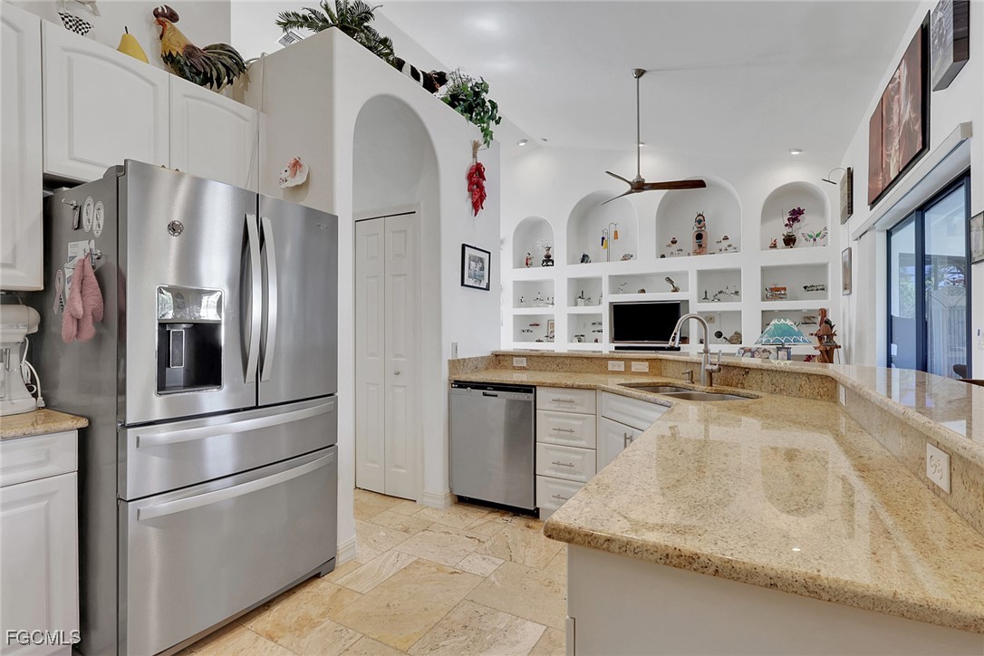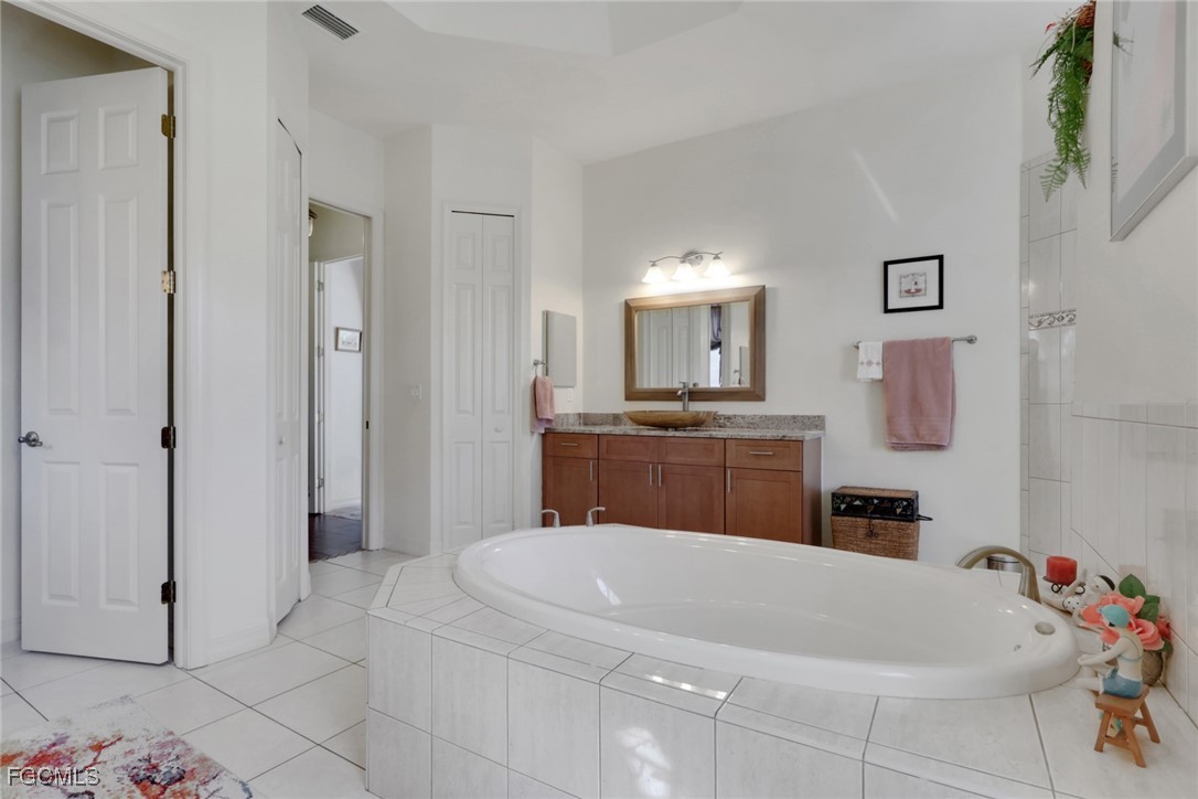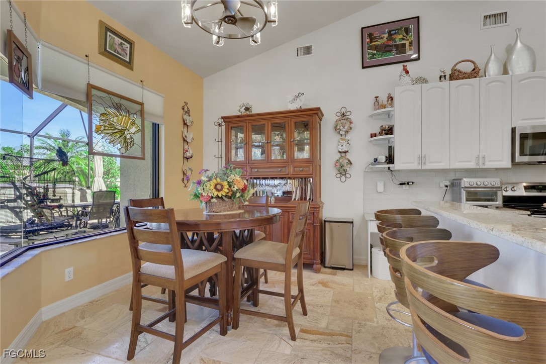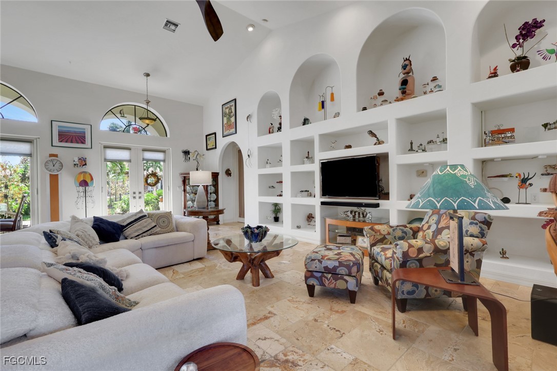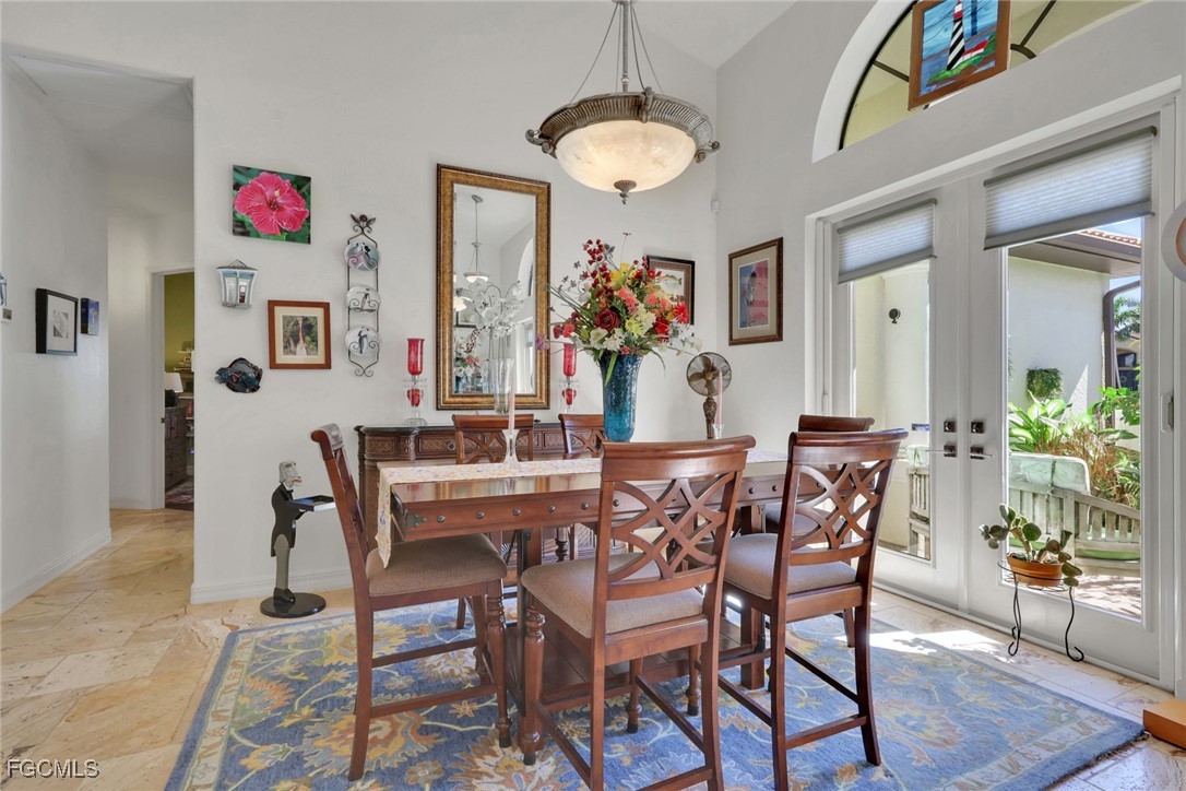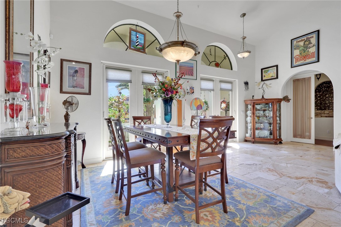 NEW TILE ROOF 2023 & NO FLOOD ZONE! Located in the prettiest part of SW Cape Coral, West of Sands and near Cape Coral Pkwy. This custom Starlight built home is a true Mediterranean Masterpiece, over 2,200 sq ft under air, with 3 bedrooms, 2 bathrooms and a great room with soaring ceilings. Featuring warm colors and classic detailing. Custom touches include custom built-ins (currently displaying an art collection), architectural details throughout the home, French doors that open to the front garden for more natural light and breezes, tray ceilings in every bedroom. The Pocket sliding glass doors open up to a large under truss lanai, overlooking the custom pool, making this the perfect place to entertain family and friends. Classic white kitchen with plenty of cabinets for storage and granite countertop that overlooks the family room and into the pool area through mitered glass window. Spacious pavered screened in lanai for sunning is surrounded by an actual concrete block wall for privacy. Matching paver walkways weave through the gardens and around the pool enclosure. The entire yard is beautifully landscaped with mature tropical landscaping, making this a true private paradise. The large Primary suite features large walk-in closets, dual vanities, a soaking tub and a walk-through shower. Tile floors throughout, with beautiful travertine tile in the French patten in the great room and kitchen areas (no carpet!). The Southwest is the prettiest part of Cape Coral, with it's million-dollar waterfront homes and close to dining, shopping and entertainment.