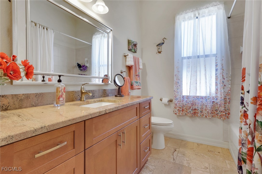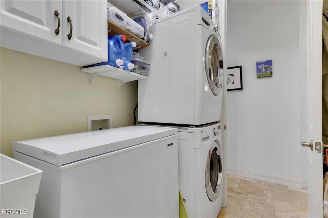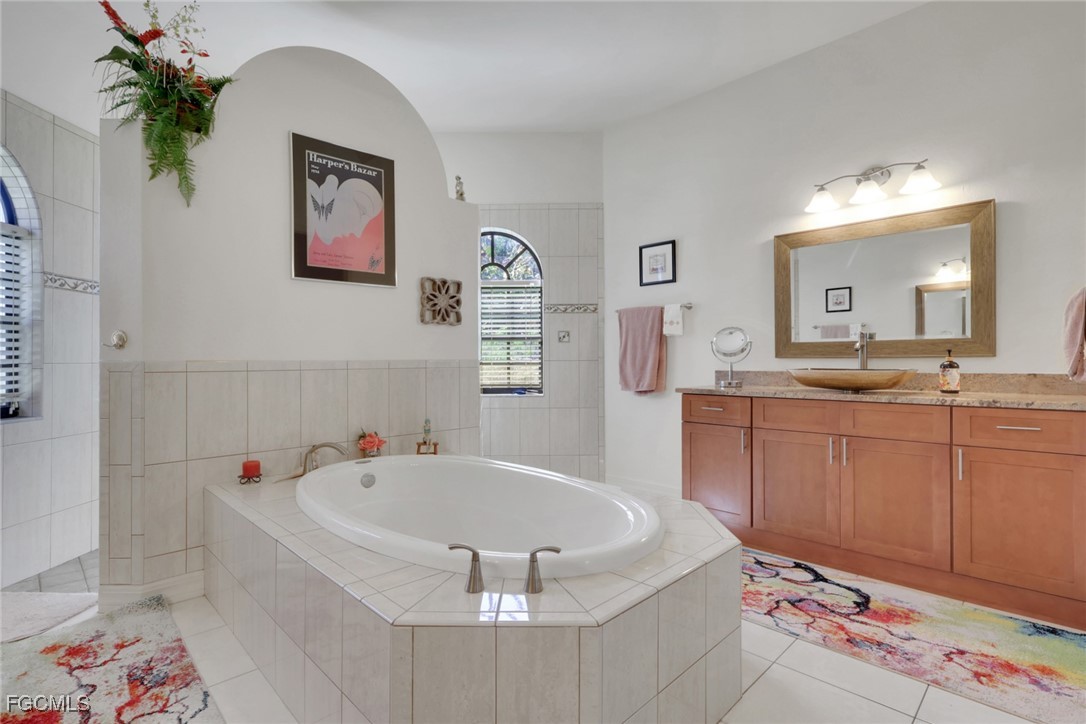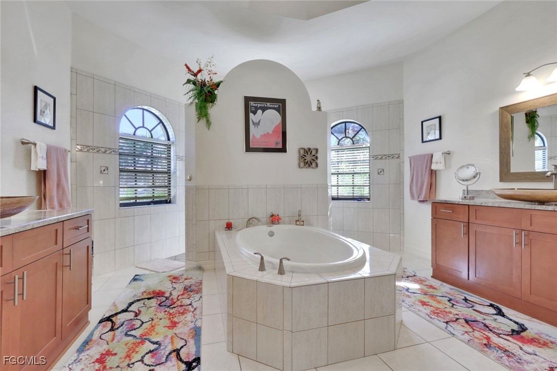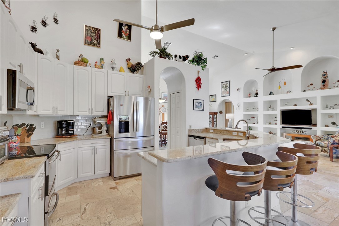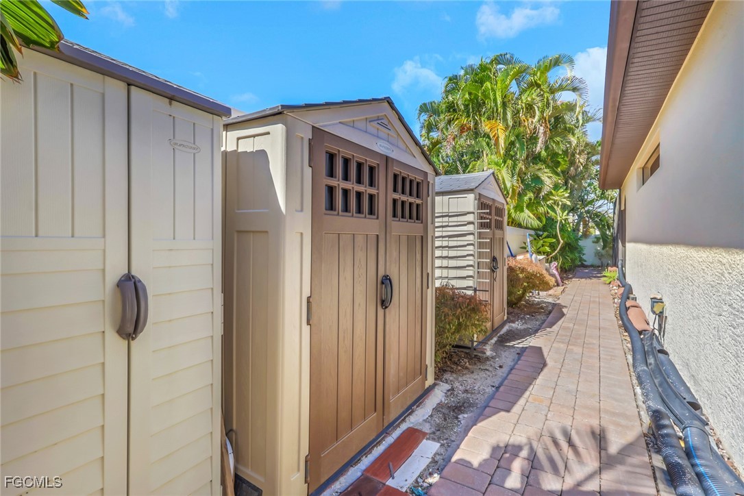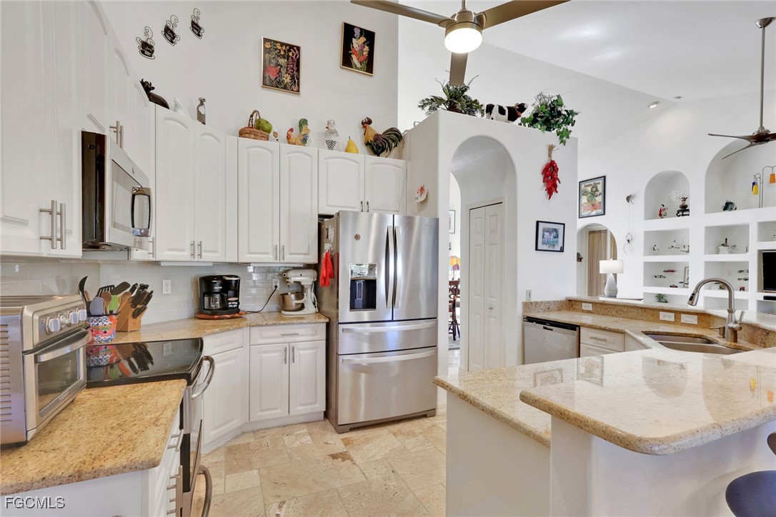 NEW TILE ROOF 2023 & NO FLOOD ZONE! Located in the prettiest part of SW Cape Coral, West of Sands and near Cape Coral Pkwy. This custom Starlight built home is a true Mediterranean Masterpiece, over 2,200 sq ft under air, with 3 bedrooms, 2 bathrooms and a great room with soaring ceilings. Featuring warm colors and classic detailing. Custom touches include custom built-ins (currently displaying an art collection), architectural details throughout the home, French doors that open to the front garden for more natural light and breezes, tray ceilings in every bedroom. The Pocket sliding glass doors open up to a large under truss lanai, overlooking the custom pool, making this the perfect place to entertain family and friends. Classic white kitchen with plenty of cabinets for storage and granite countertop that overlooks the family room and into the pool area through mitered glass window. Spacious pavered screened in lanai for sunning is surrounded by an actual concrete block wall for privacy. Matching paver walkways weave through the gardens and around the pool enclosure. The entire yard is beautifully landscaped with mature tropical landscaping, making this a true private paradise. The large Primary suite features large walk-in closets, dual vanities, a soaking tub and a walk-through shower. Tile floors throughout, with beautiful travertine tile in the French patten in the great room and kitchen areas (no carpet!). The Southwest is the prettiest part of Cape Coral, with it's million-dollar waterfront homes and close to dining, shopping and entertainment.