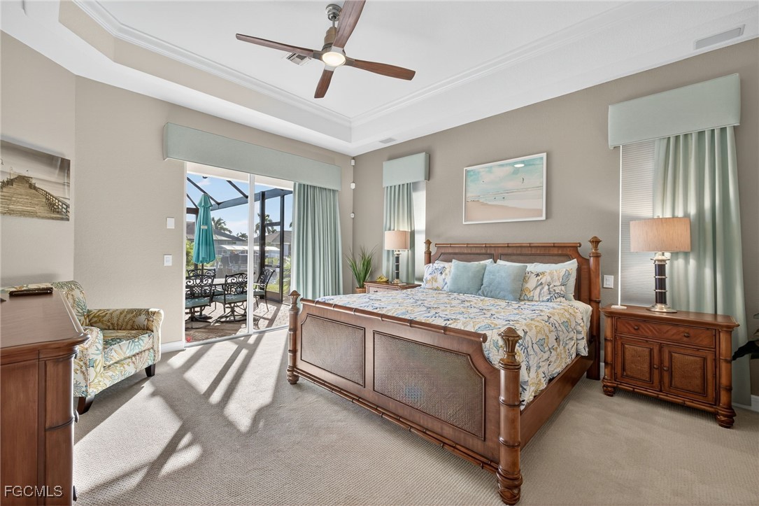 The kitchen features wood cabinetry, quartz countertops, stainless steel appliances, and a breakfast nook with a mitered glass window overlooking the pool and canal. The primary suite includes two walk-in closets and a bathroom with dual vanities, a soaking tub, and a separate shower.