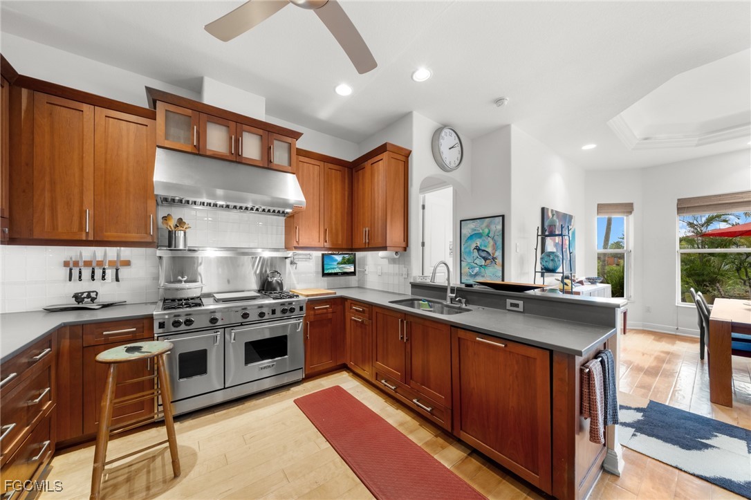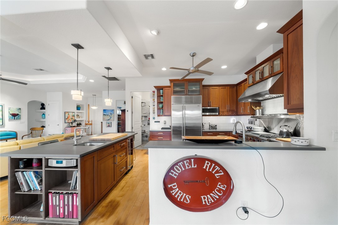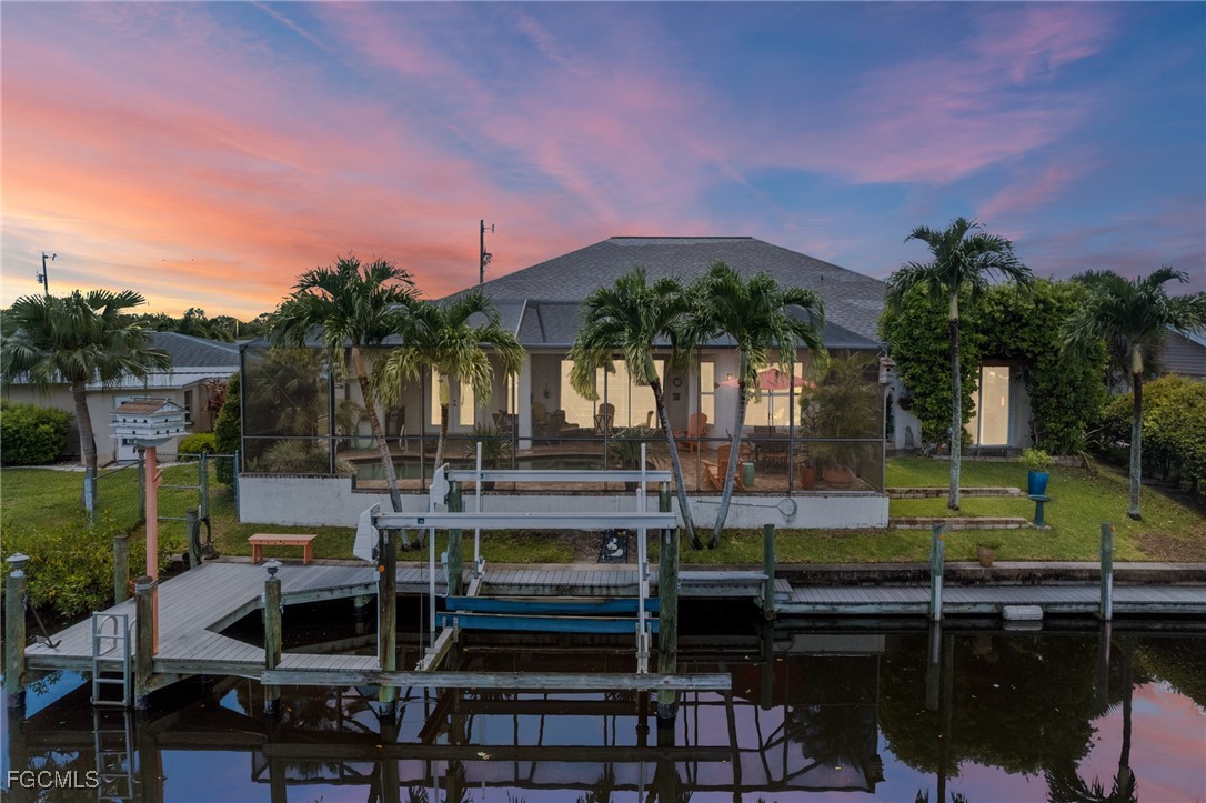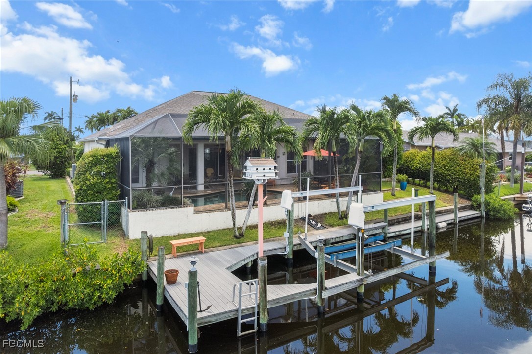 Tucked away on a quiet cul-de-sac, this custom-built, direct Gulf access pool home offers the ultimate in Southwest Florida waterfront living—with no bridges to open water and no compromises on quality or design. Spanning 2,257 square feet of living space, the four-bedroom, two-bath home features a spacious great room layout with rich wood flooring, 10-foot ceilings, and elegant tray accents. The home also includes impact-rated windows and doors. At the heart of the open great room layout, the island kitchen is outfitted for serious cooking and entertaining, featuring a built-in Sub-Zero refrigerator, Wolf gas range, wine refrigerator, walk-in pantry, and high-end finishes. Sliders and French doors open to the screen-enclosed pool area, where you’ll find a heated saltwater pool, outdoor kitchen, and a large under-truss lanai—perfect for shaded lounging and outdoor dining. The primary suite offers a private retreat with a spacious bath, including dual vanities, a walk-in shower, and a separate soaking tub. It is connected to public water and sewer, while the irrigation system runs on a separate well to keep the tropical landscaping lush and green. Additional upgrades include a 10,000-pound boat lift, a fenced backyard. Best of all, this home has never flooded—not even during recent hurricanes.