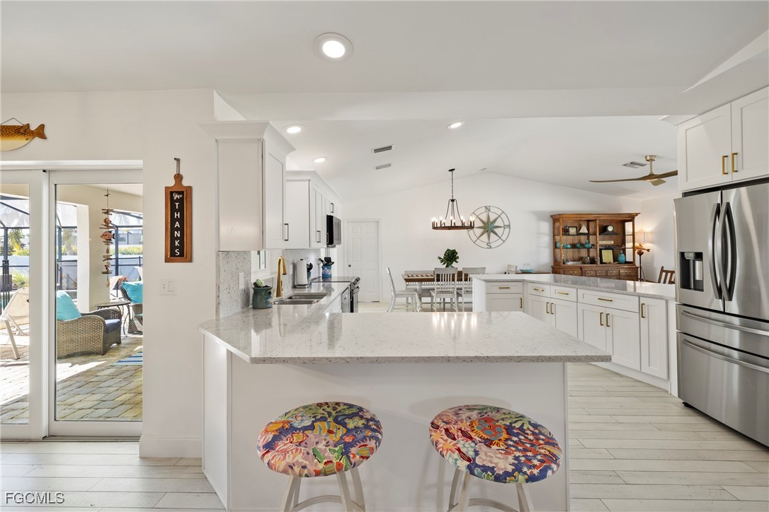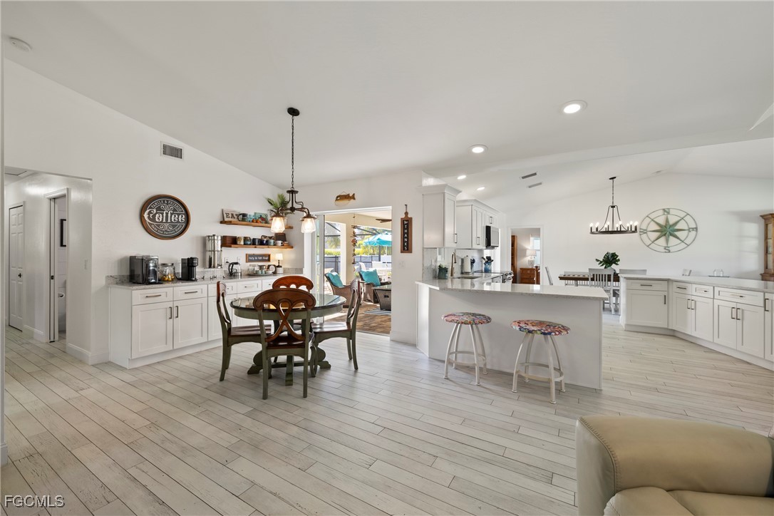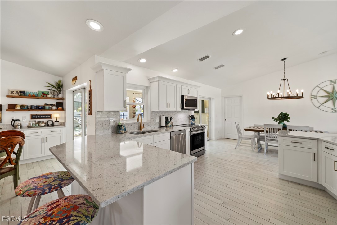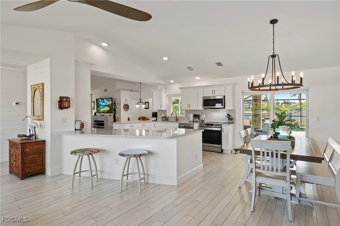 Immaculate Coastal Farmhouse in Cape Lacha – FULLY RENOVATED Pool Home! Welcome to your private tropical oasis in one of Cape Coral's most desirable neighborhoods. This meticulously updated home is truly a rare find. This stunning 3-bed + den pool home offers 2,200+ sq ft of COMPLETELY renovated living space & southern exposure. Split-bedroom open floor plan with living room, family room, and separate dining area. Updated kitchen features marble countertops & stainless appliances (2024), and porcelain wood plank flooring throughout the home. Master en-suite bathroom has been completely updated!