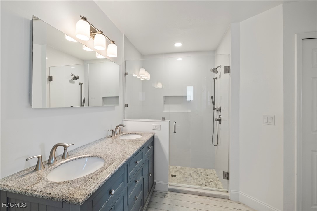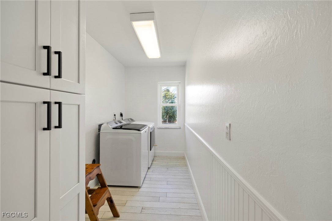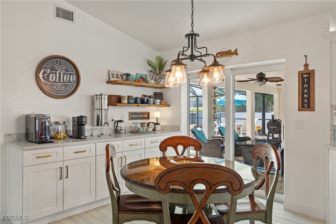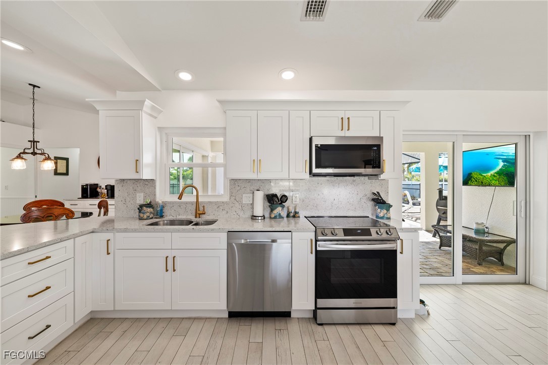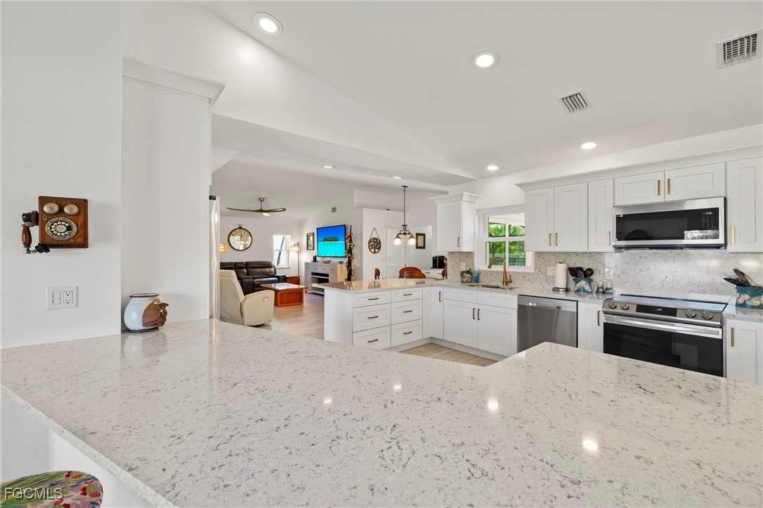 Immaculate Coastal Farmhouse in Cape Lacha – FULLY RENOVATED Pool Home! Welcome to your private tropical oasis in one of Cape Coral's most desirable neighborhoods. This meticulously updated home is truly a rare find. This stunning 3-bed + den pool home offers 2,200+ sq ft of COMPLETELY renovated living space & southern exposure. Split-bedroom open floor plan with living room, family room, and separate dining area. Updated kitchen features marble countertops & stainless appliances (2024), and porcelain wood plank flooring throughout the home. Master en-suite bathroom has been completely updated!