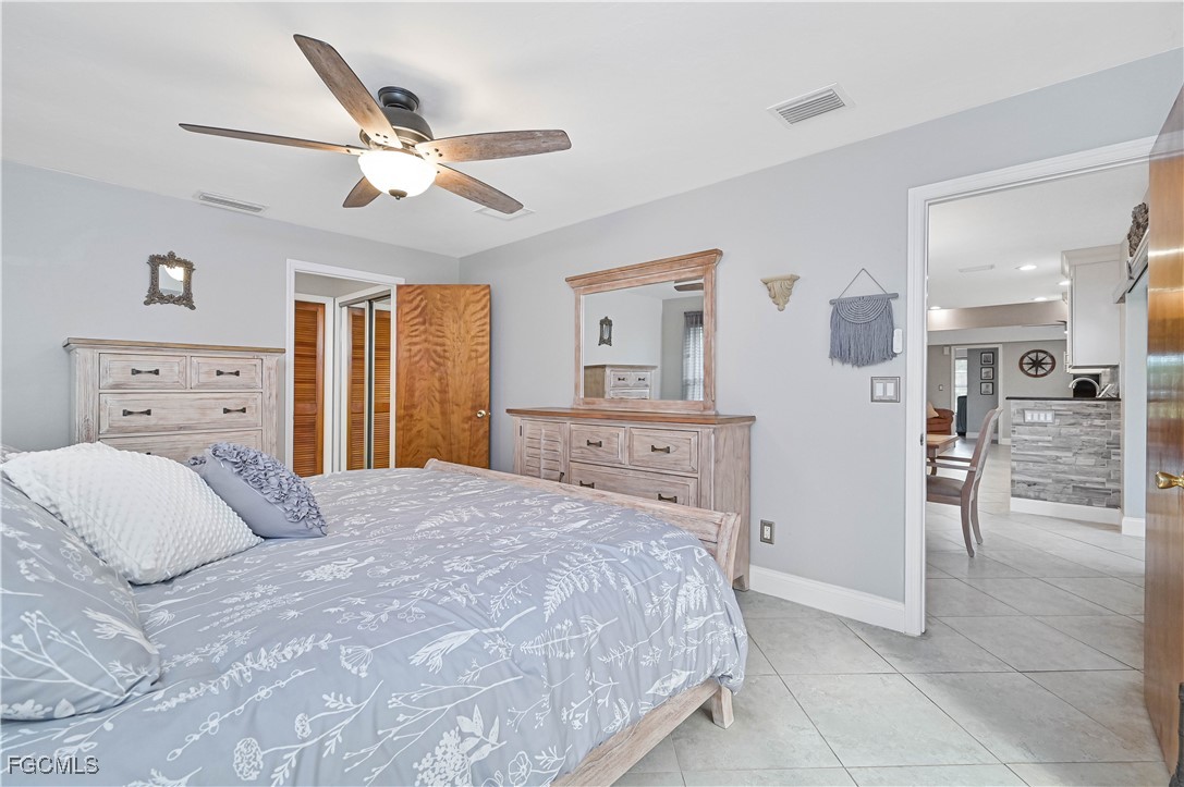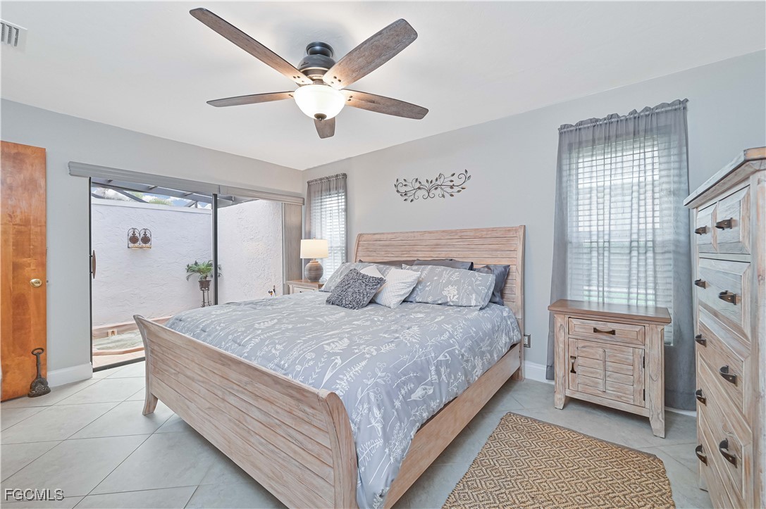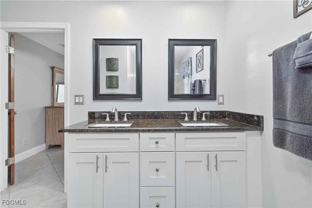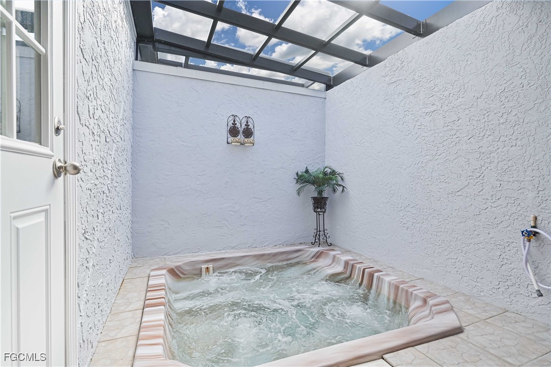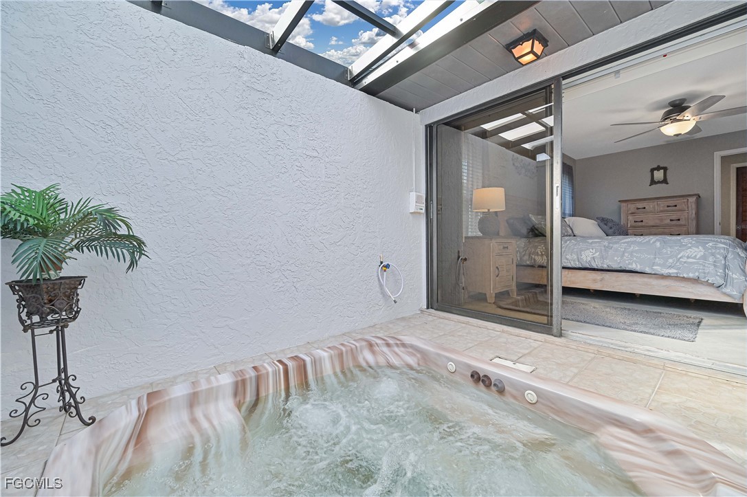 Beautifully tiled throughout, the home features a spacious primary suite with walk-in shower, dual sinks, and large walk-in closet. The primary bedroom offers private access to the lanai and outdoor spa, while the guest bath also opens to the lanai for poolside convenience. Bedroom 3 includes a generous walk-in closet for extra storage.