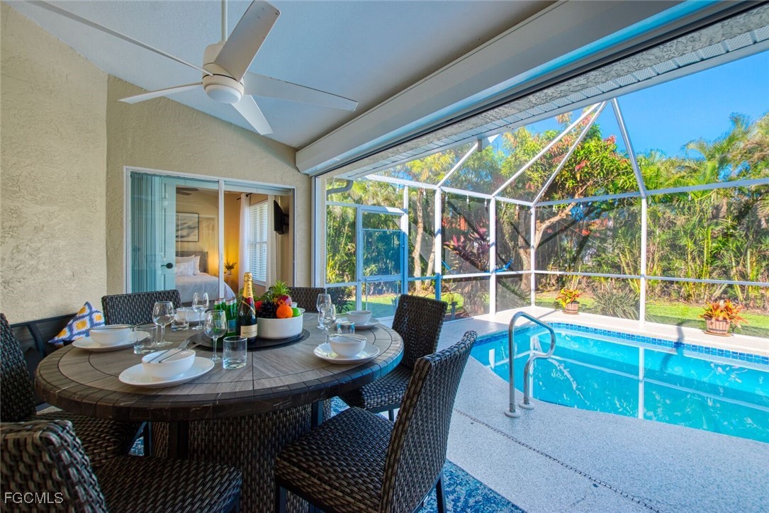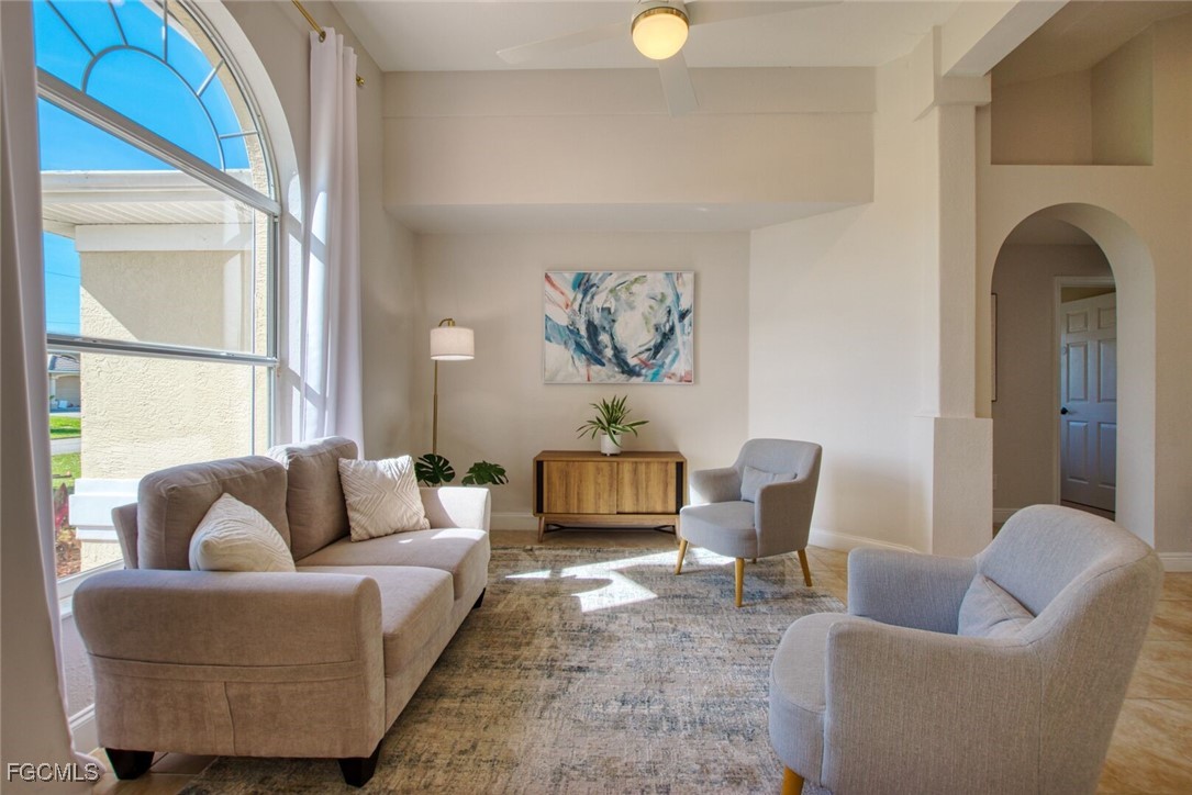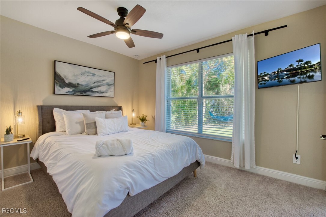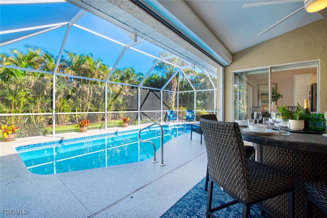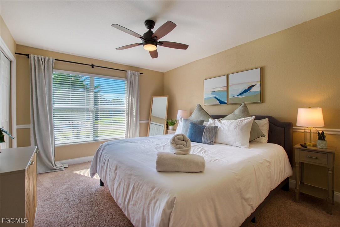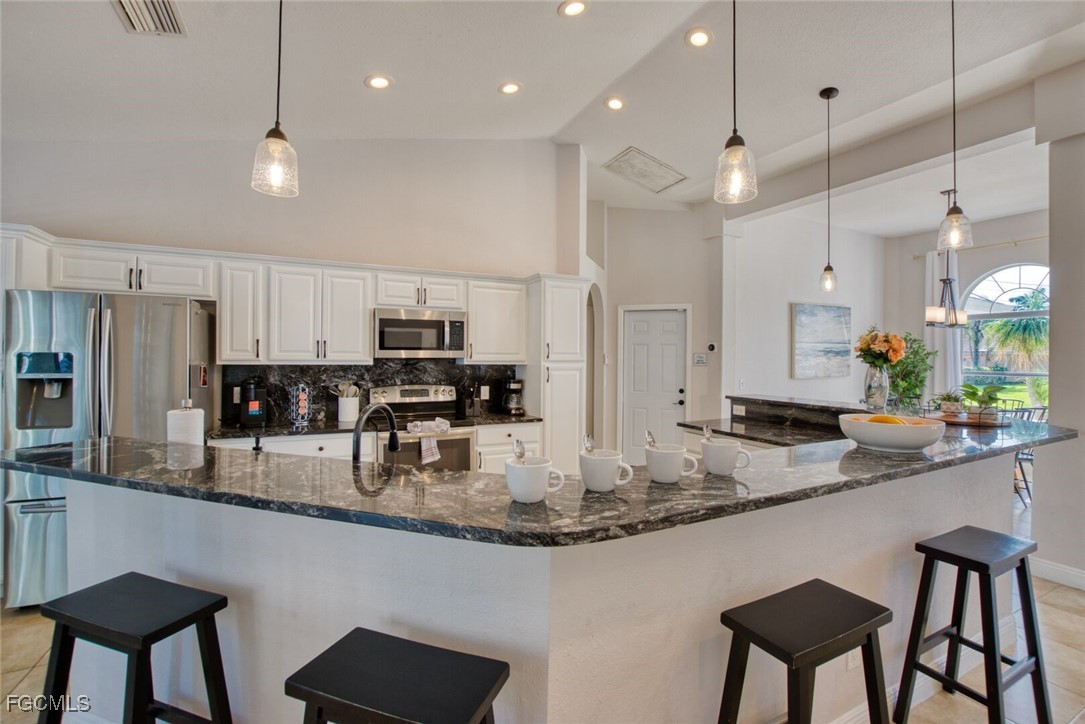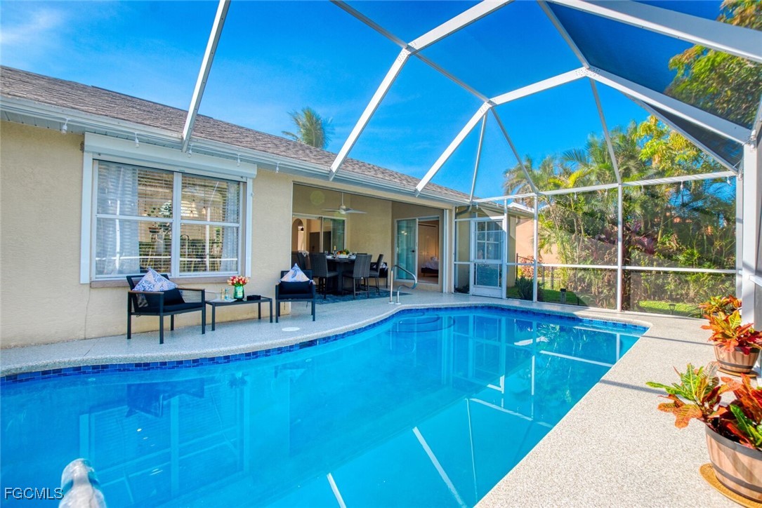 Welcome to your beautifully updated and fully furnished 4-bedroom, 2-bath retreat with 2,036 sq ft under air (3,399 total), offering modern comfort, style, and immediate income potential. Currently leased for $4,500 per month from November through June, you can choose to continue the rentals or begin enjoying it yourself right away. The seller’s transferrable flood insurance policy at $1,353 per year adds peace of mind and long-term value. This turnkey home comes completely furnished, ready for effortless living or hosting. Inside, soaring vaulted ceilings and beautiful natural light highlight a modern open floor plan that seamlessly connects the living, dining, and kitchen areas for easy entertaining. The chef’s kitchen showcases granite countertops and backsplash, stainless steel appliances, a five-burner stove, double sink, and an oversized refrigerator with ice and water dispenser. The luxury primary suite offers a king bed, 65-inch TV, dual vanities, private toilet room, walk-in shower, soaking tub, linen closet, and spacious walk-in closet. Every guest bedroom includes a queen or king bed and flat-screen TV, creating comfort and privacy for all. Recent updates include a 2023 AC, new pool heater, water heater, washer/dryer, light fixtures, epoxy garage floor, upgraded deck lighting, and a resurfaced pool deck with new lanai screening. You’ll also find a 2023 electrical panel with whole-home surge protection, portable generator hookup, new automatic garage door opener, electric shutters on the front and lanai, automatic sprinklers, and flat-screen TVs throughout, including the lanai. Outside, your fenced backyard is surrounded by tall palms and two mature mango trees, creating a private tropical escape around the heated pool and screened lanai. Ideally located in one of Cape Coral’s most desirable no-HOA neighborhoods, you’re minutes from shopping, dining, and Southwest Florida’s best beaches. Whether you’re seeking a primary home, vacation getaway, or income-producing investment, this property is the total package. Schedule your private showing today and discover turnkey living at its finest.