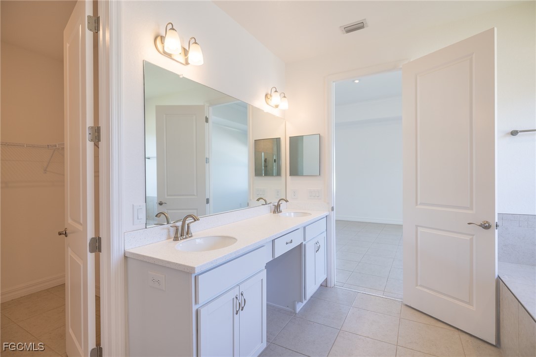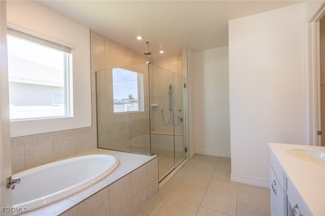 Luxurious master suite with dual sinks, separate soaking tub, and walk-in shower