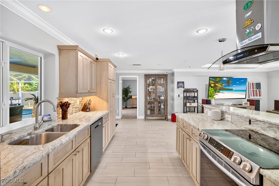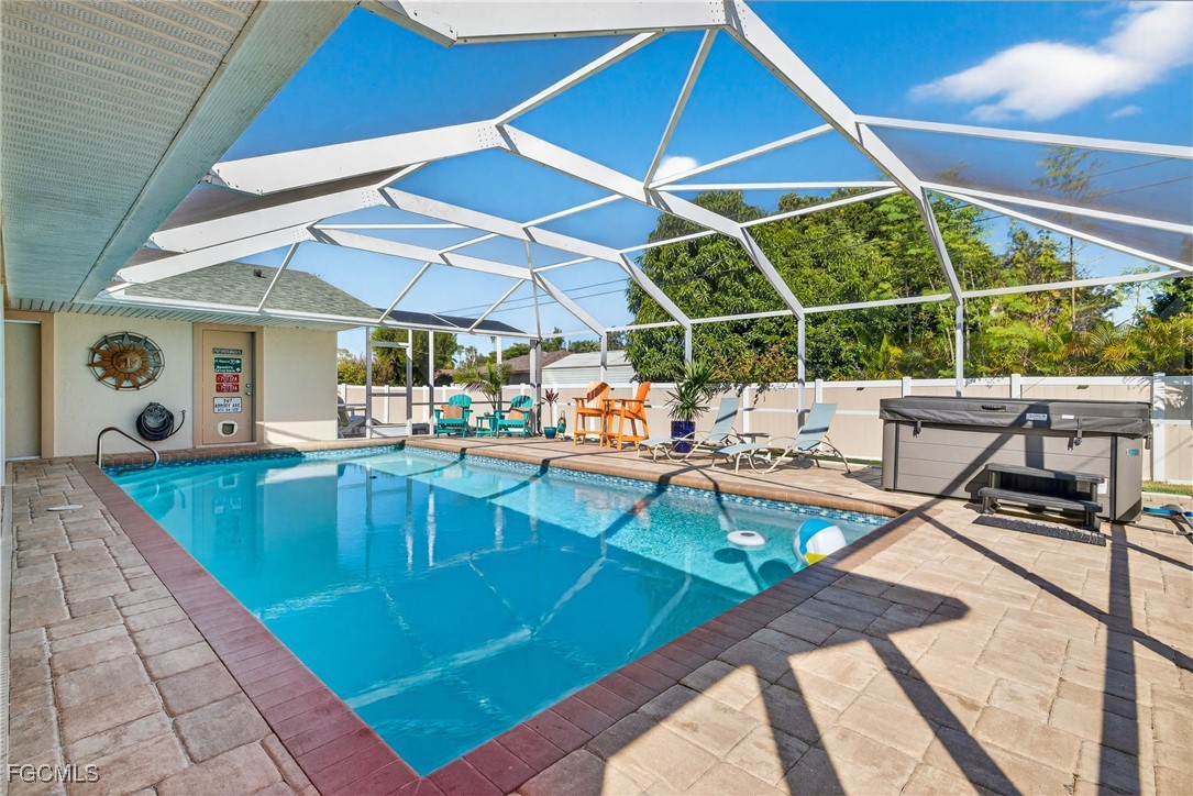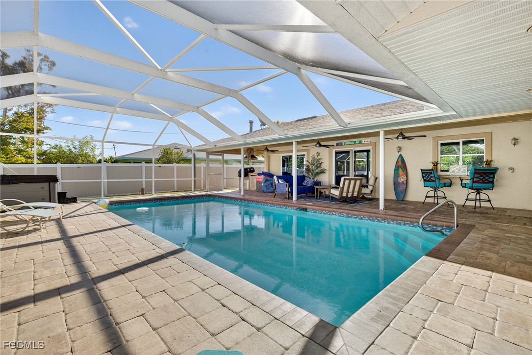 Inside, you'll find an open, modern layout with porcelain plank flooring, tray ceilings, granite counters, Samsung appliances, custom wood cabinetry, and a smart-home system controlling lights, fans, shades, locks, and thermostat. The outdoor living area impresses with a 40’x40’ paver patio, Bull BBQ island, and a 22,000-gallon heated/cooled pool with newer equipment. Impact windows/doors, PEX plumbing, updated electrical, roof, gutters, pool cage, and HVAC with UV and ionizer were all completed in 2017. Additional perks include a 2-car garage, hybrid water heater, 10’x15’ permitted pad for a shed/office, 4-zone irrigation, and generator back-feed. A rare, like-new home in a highly desirable Fort Myers neighborhood.