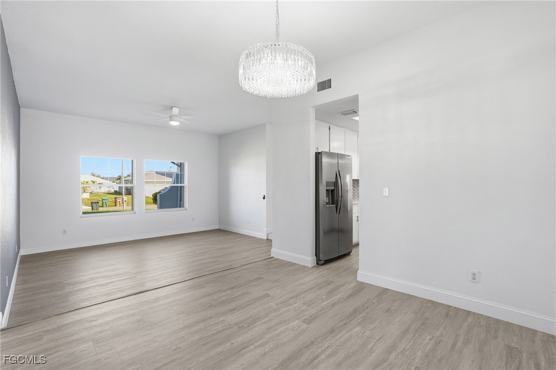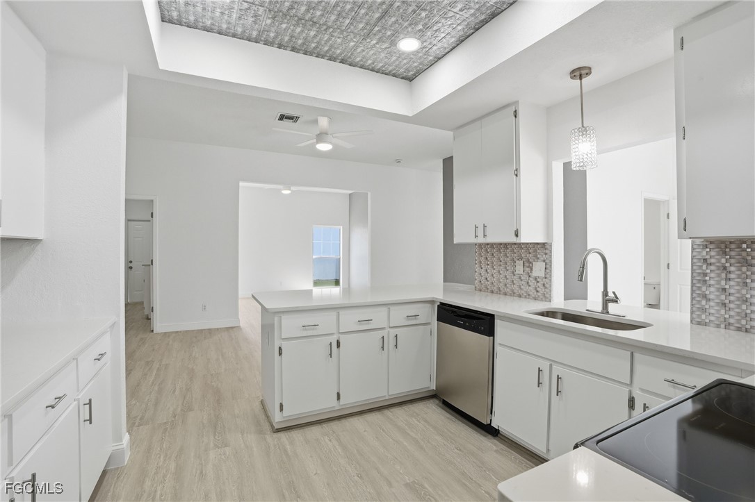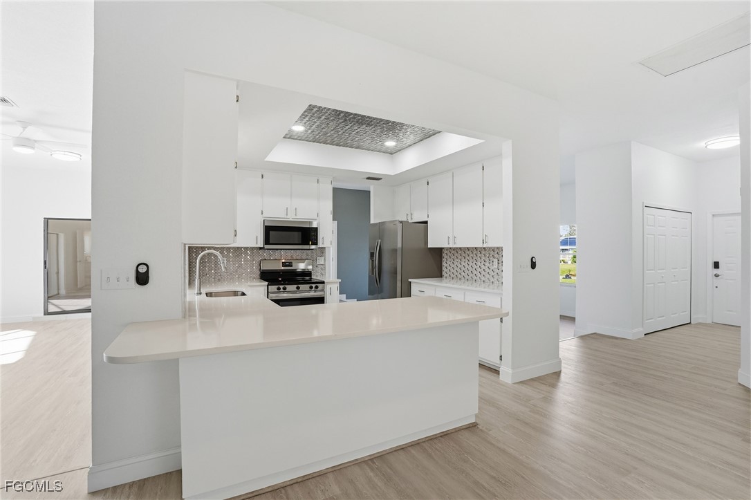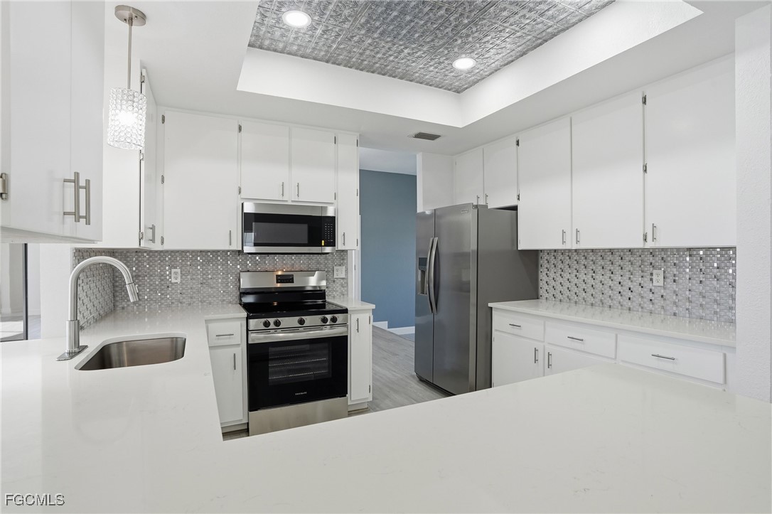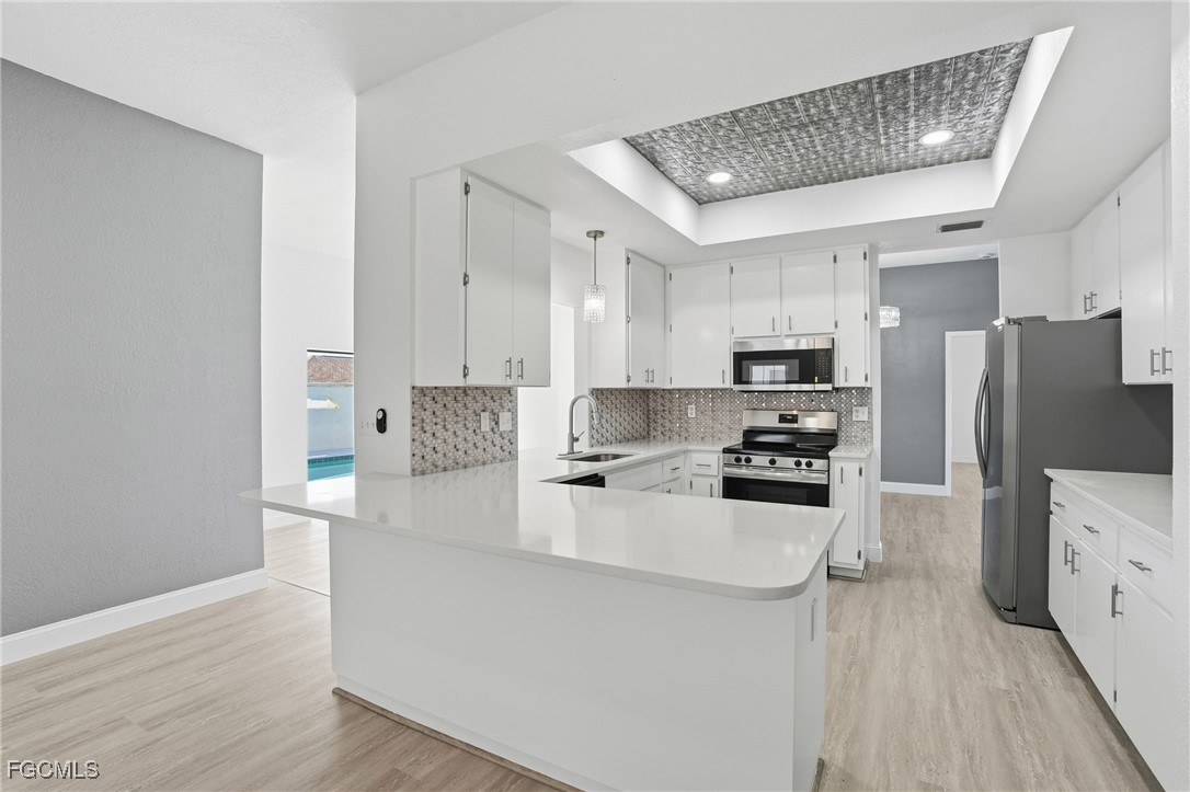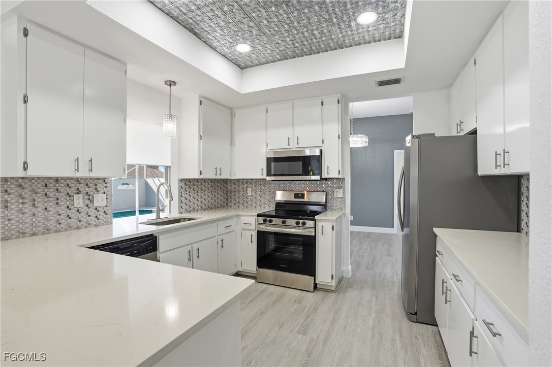 The kitchen is more than a remodel — it’s a statement. It gleams from every angle: crisp white cabinetry, thick quartz counters with a polished finish, high-end stainless appliances, and a woven glass backsplash that sparkles under the glow of crystal pendant lighting. A silver tin-inlayed ceiling adds an unexpected layer of texture and shine, giving the entire space a showstopping, designer-quality look. This is a kitchen meant to be seen — elegant, glamorous, and bold — yet thoughtfully functional with a walk-in pantry, abundant counter space, and a layout that makes even simple weeknight meals feel special.