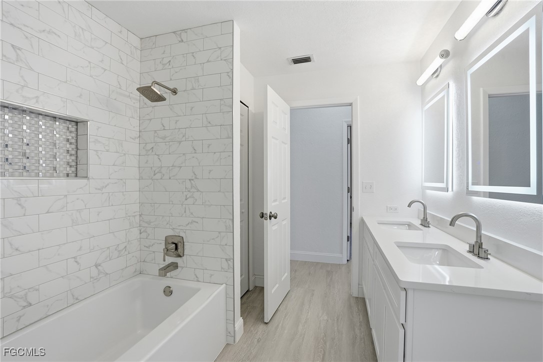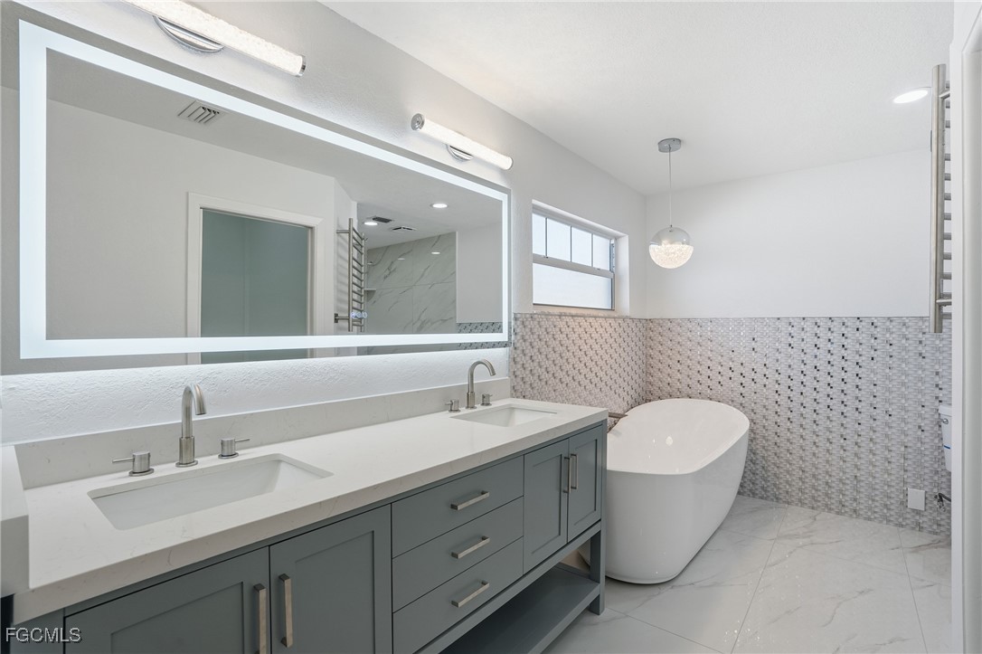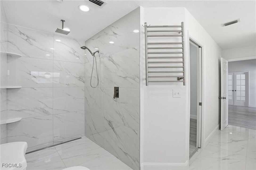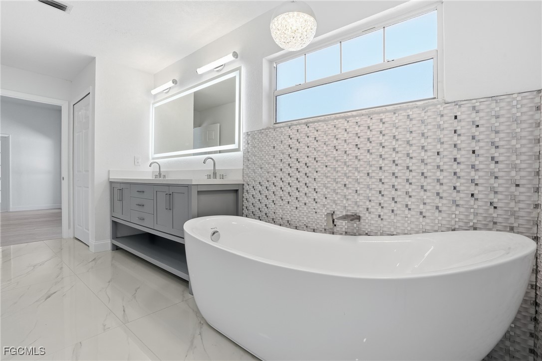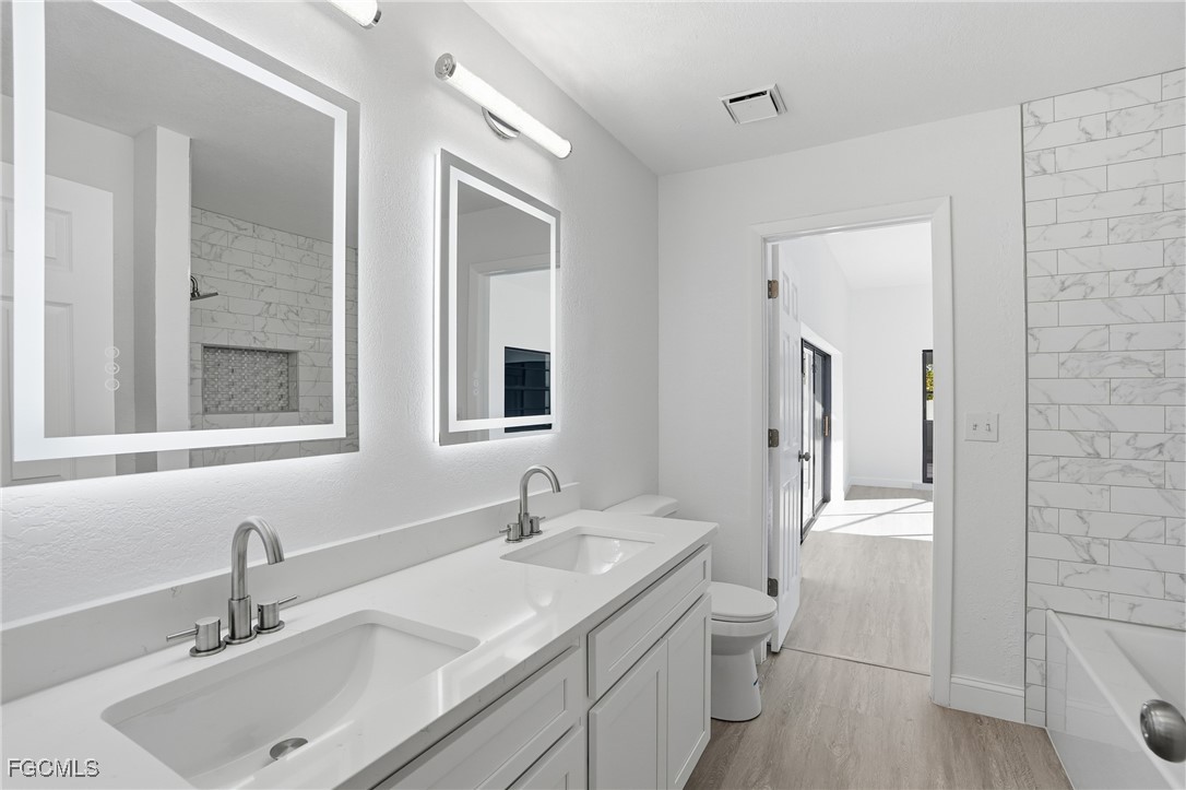 This home features TWO master suites, but the primary is truly a retreat. Sleek, spa-inspired, and indulgent, it blends luxury with modern edge. The ensuite bath is a full sensory experience: dual sinks set in quartz, a deep soaking tub that invites relaxation, a mounted towel warmer, a walk-in shower with a ceiling-mounted rainhead, and designer finishes that feel upscale and intentional. The walk-in closet is more boutique than storage — oversized, glamorous, and able to showcase your wardrobe with room to spare. Both guest bedrooms are generously sized with large walk-in closets; one features its own private bath for added comfort and privacy.