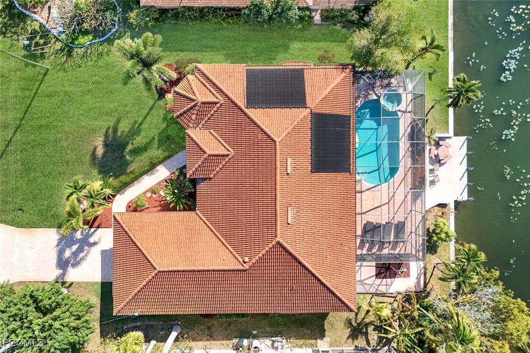 Seawall with concrete dock. Perfect spot for fishing. Tile roof. Accordion shutters along the sitting area on the lanai and on some windows.