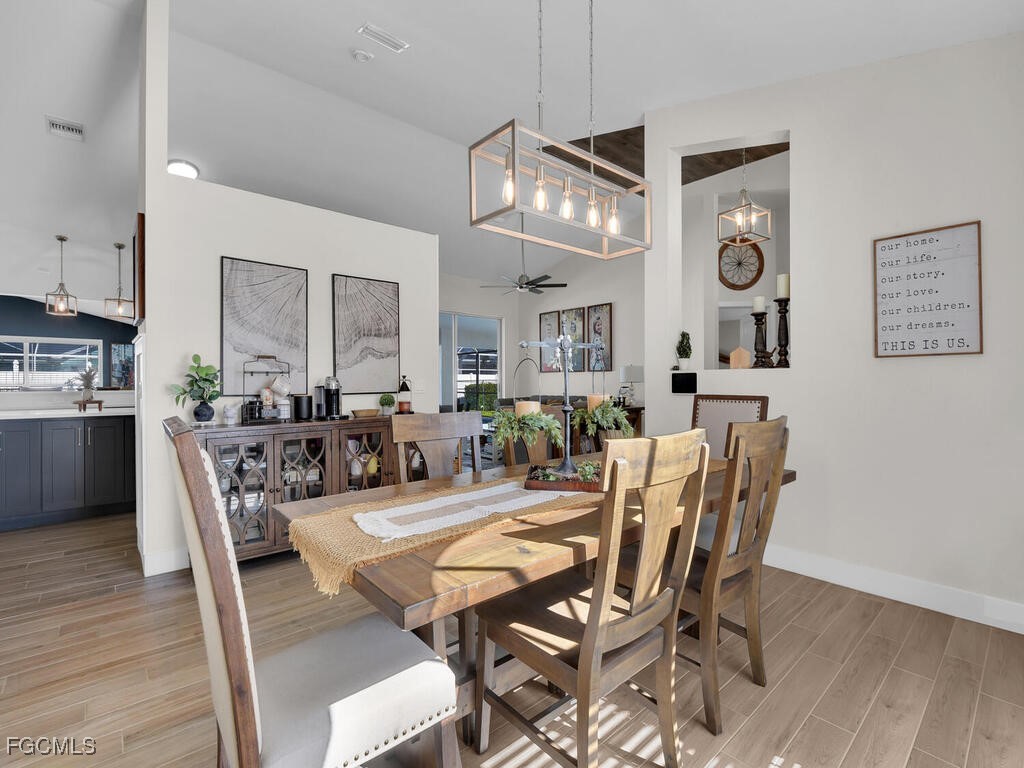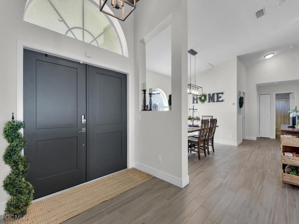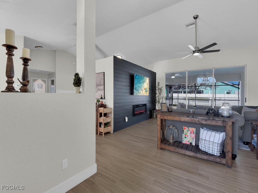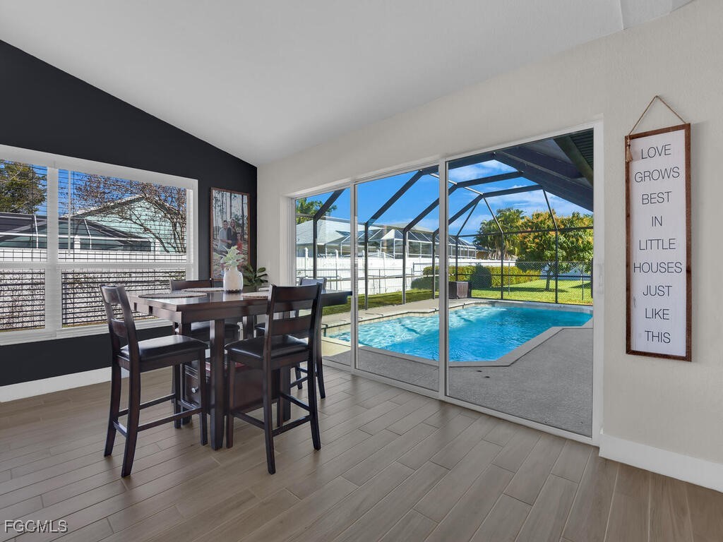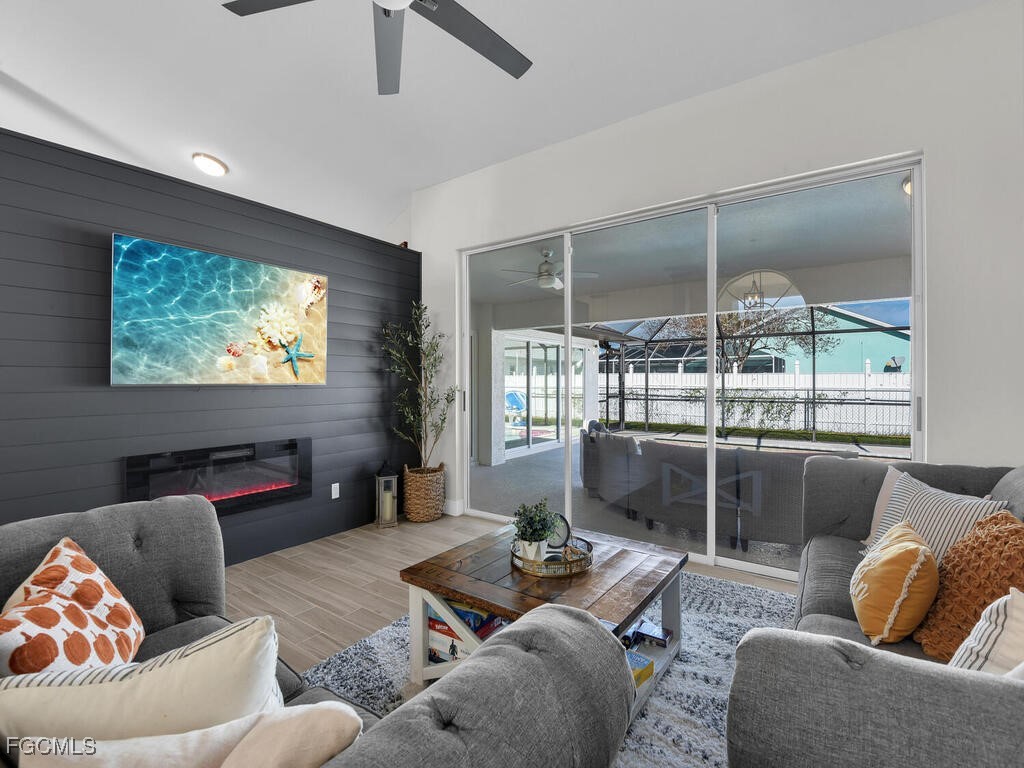UPGRADES & LUXURY FEATURES THROUGHOUT! Stunning pool home that has a classic living & family room layout giving you a fantastic place for your family to relax as well as entertain. Custom features have been added giving the main living areas a true Estate Living feel- entertainment wall w/ tv & electric fireplace, custom woodwork, designer grade light fixtures & fans, high-end contemporary hardware, cottage-chic French door front entry, custom shelving in laundry room, beautiful updated master bath, & so much more! Single family design w/ spacious pool lanai, fenced-in backyard giving you a dog-run area & lots of privacy, split bedroom floor plan w/ master suite having private access to pool lanai, cathedral ceiling in family room, breakfast nook & breakfast bar, formal dining area, and gorgeous remodelled kitchen. You will love the outdoor living space that offers a large covered sitting area, service window from kitchen, half bath, and a custom built pool. The SE corridor of Cape Coral is highly sought out due to the easy access to the bridge leading into Fort Myers, close proximity to lots of shopping/dining options, and being just a short drive to the amazing beaches of SWFL!