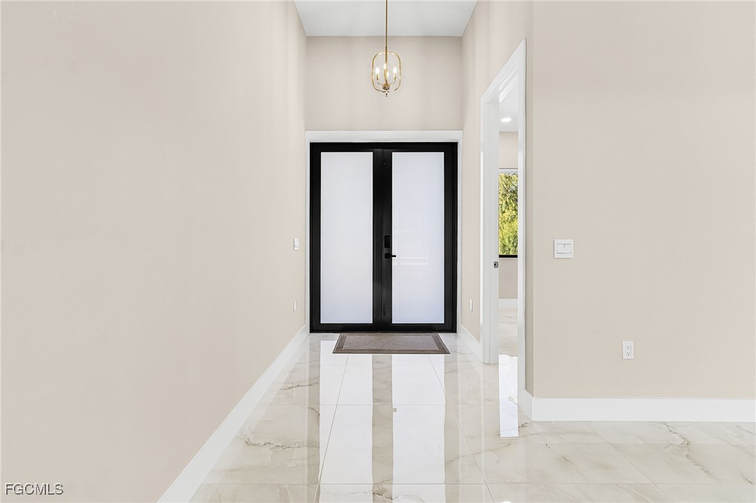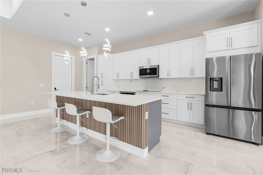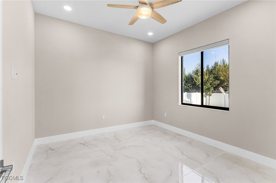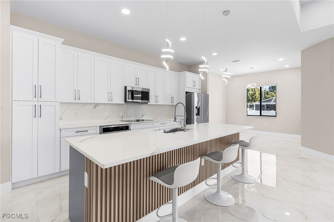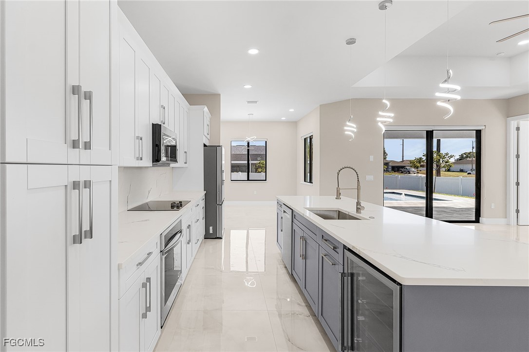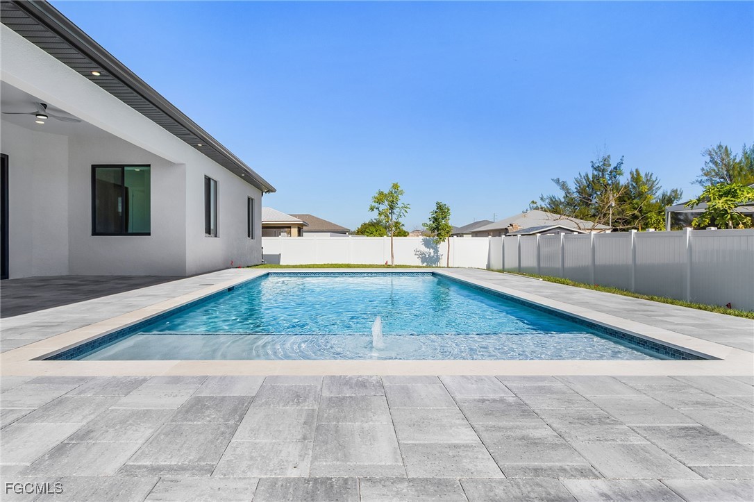 Stunning new-construction pool home with thoughtful, high-end finishes throughout, situated in a quiet neighborhood on an oversized corner lot close to all amenities. This premium residence offers 2,000 sq. ft. of living space under air with 3 bedrooms plus a den/office, 2 bathrooms, and a 3-car garage. Enjoy Florida living with an in-ground 14' x 28' upgraded saltwater/chlorine pool featuring natural stone travertine coping, a large paver deck, gorgeous waterline tile, a spacious tanning ledge with bubbler, and pool lighting. Premium Pentair equipment includes a 2.2 HP SuperFlo Variable Speed Pump. The property also includes a vinyl fenced yard and an outdoor kitchen with a matching granite countertop. Enter through double front doors into a bright, open living area anchored by 8-foot-tall sliding doors leading to the lanai. The home showcases extra-tall ceilings complemented by 8-foot interior shaker-style doors. All exterior doors and windows are upgraded hurricane-impact rated. Flooring is 32" x 32" porcelain tile throughout. The living room is enhanced with decorative wall paneling and includes an 86" LG 4K Smart TV. The kitchen is beautifully appointed with premium cabinetry featuring soft-close solid wood doors, a tall pantry, and a large island with matching decorative paneling and seating. Upgraded stainless steel appliances include a built-in cooktop, oven, Bosch premium dishwasher with a third rack, a separate beverage refrigerator, and premium quartz countertops and backsplash. A separate dining area overlooks the pool, adding to the home’s open and airy feel. Upgraded fixtures, ceiling fans, and lighting are featured throughout. The primary suite offers two walk-in closets with custom organizers, dual sinks, lighted mirrors, and a large glass-enclosed shower alongside an oversized freestanding tub and a large rain shower head that fits comfortably inside and delivers a truly premium feel. Sliding doors provide lanai access from both the living room and the primary bedroom. The two additional bedrooms also include custom closet organizers. Custom zebra blinds are included throughout the home.