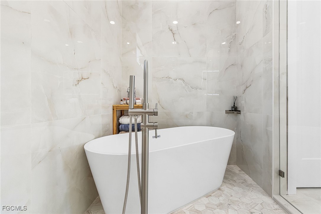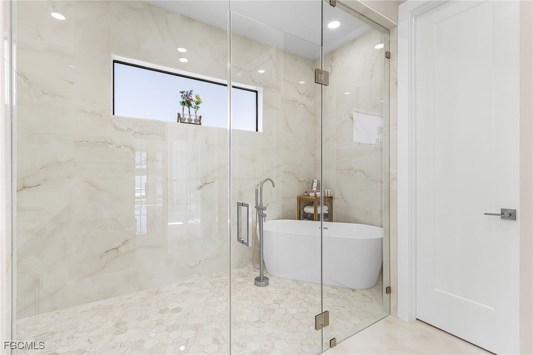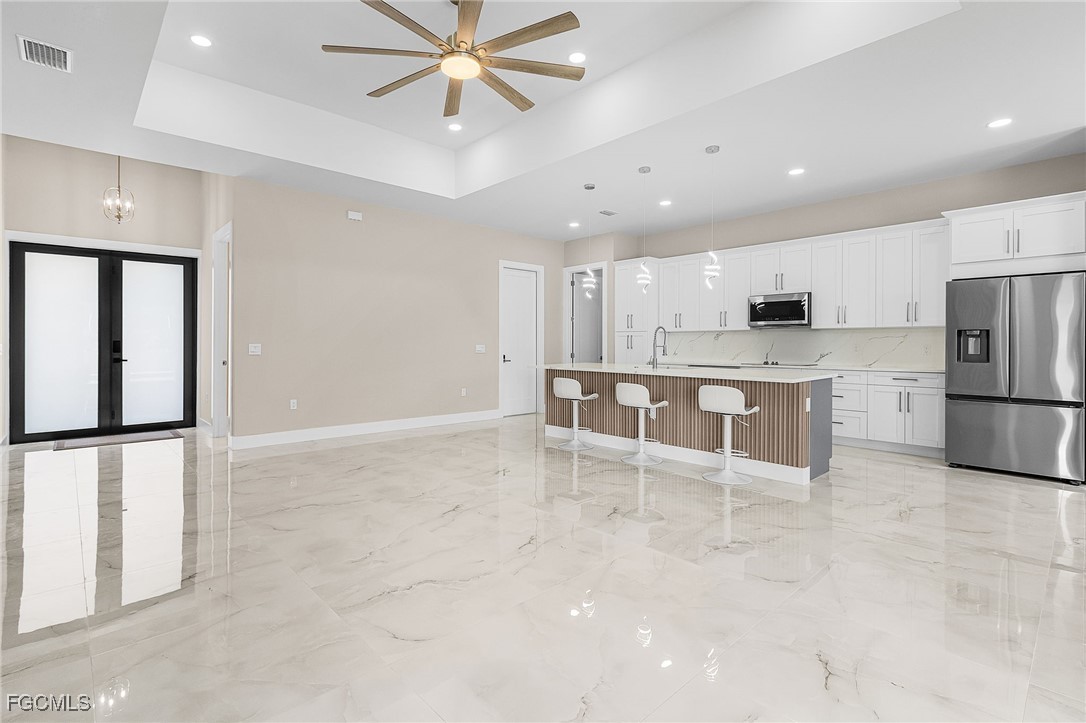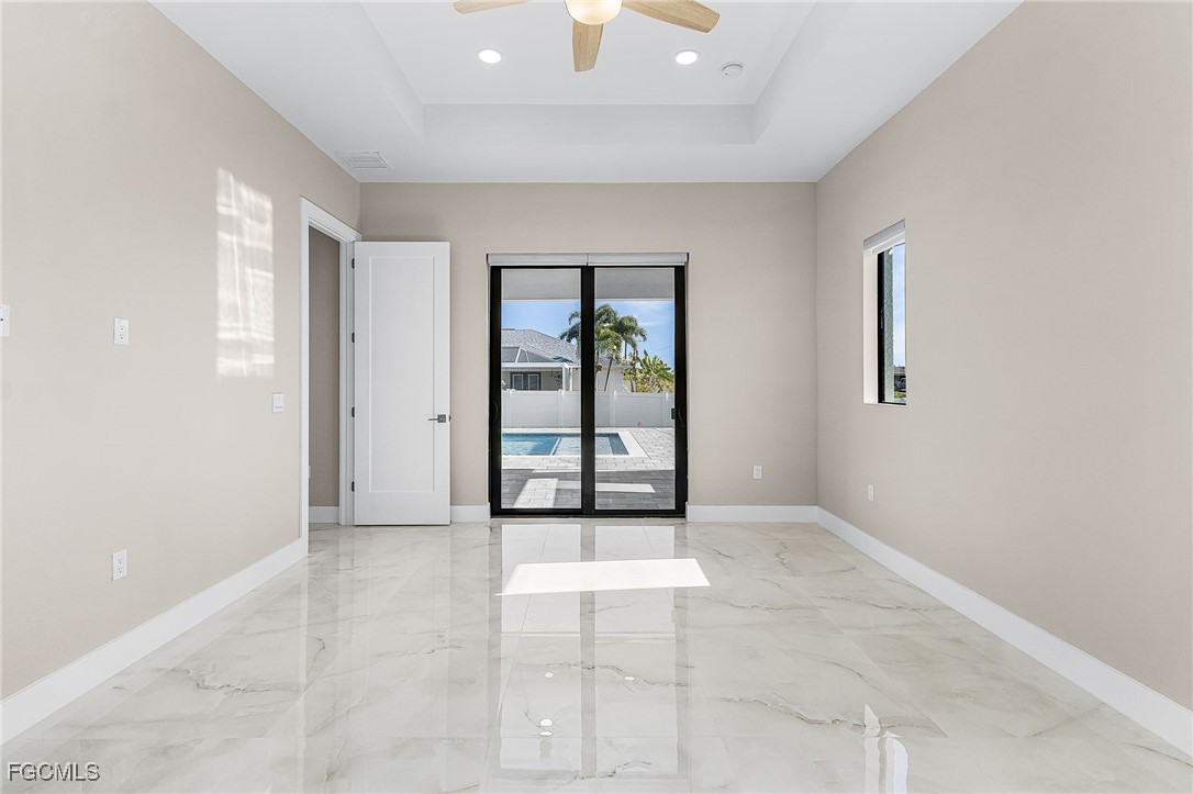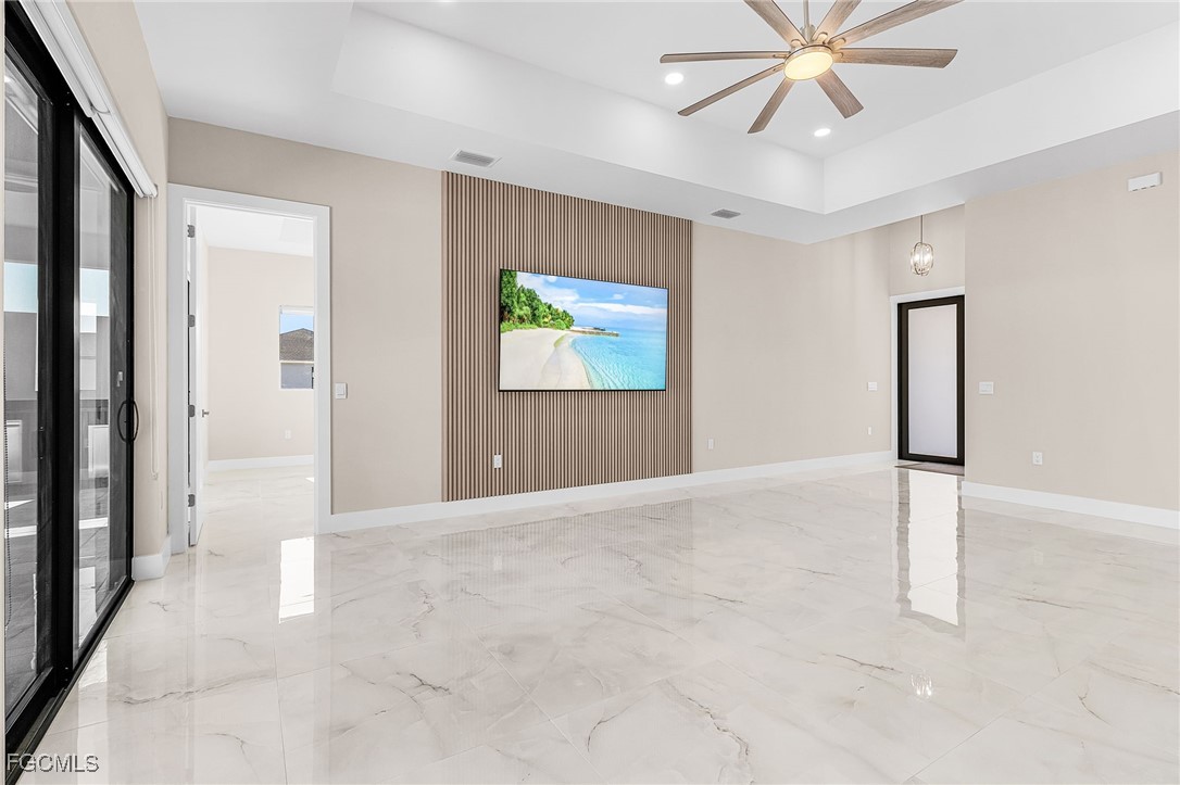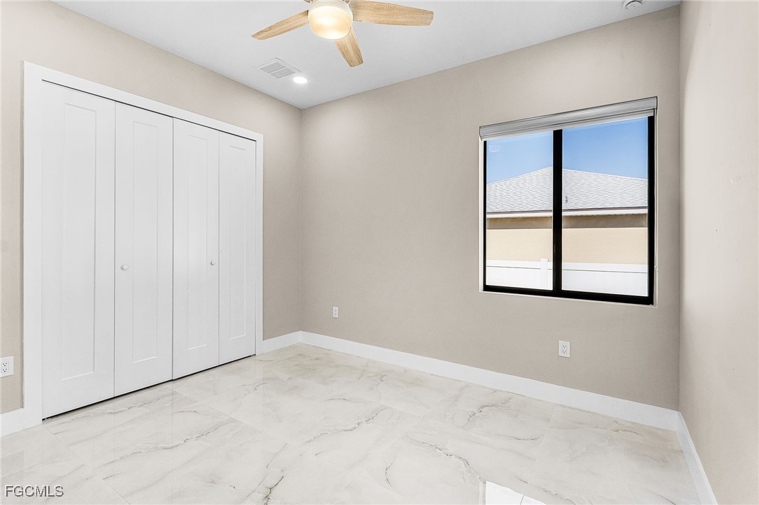 Stunning new-construction pool home with thoughtful, high-end finishes throughout, situated in a quiet neighborhood on an oversized corner lot close to all amenities. This premium residence offers 2,000 sq. ft. of living space under air with 3 bedrooms plus a den/office, 2 bathrooms, and a 3-car garage. Enjoy Florida living with an in-ground 14' x 28' upgraded saltwater/chlorine pool featuring natural stone travertine coping, a large paver deck, gorgeous waterline tile, a spacious tanning ledge with bubbler, and pool lighting. Premium Pentair equipment includes a 2.2 HP SuperFlo Variable Speed Pump. The property also includes a vinyl fenced yard and an outdoor kitchen with a matching granite countertop. Enter through double front doors into a bright, open living area anchored by 8-foot-tall sliding doors leading to the lanai. The home showcases extra-tall ceilings complemented by 8-foot interior shaker-style doors. All exterior doors and windows are upgraded hurricane-impact rated. Flooring is 32" x 32" porcelain tile throughout. The living room is enhanced with decorative wall paneling and includes an 86" LG 4K Smart TV. The kitchen is beautifully appointed with premium cabinetry featuring soft-close solid wood doors, a tall pantry, and a large island with matching decorative paneling and seating. Upgraded stainless steel appliances include a built-in cooktop, oven, Bosch premium dishwasher with a third rack, a separate beverage refrigerator, and premium quartz countertops and backsplash. A separate dining area overlooks the pool, adding to the home’s open and airy feel. Upgraded fixtures, ceiling fans, and lighting are featured throughout. The primary suite offers two walk-in closets with custom organizers, dual sinks, lighted mirrors, and a large glass-enclosed shower alongside an oversized freestanding tub and a large rain shower head that fits comfortably inside and delivers a truly premium feel. Sliding doors provide lanai access from both the living room and the primary bedroom. The two additional bedrooms also include custom closet organizers. Custom zebra blinds are included throughout the home.