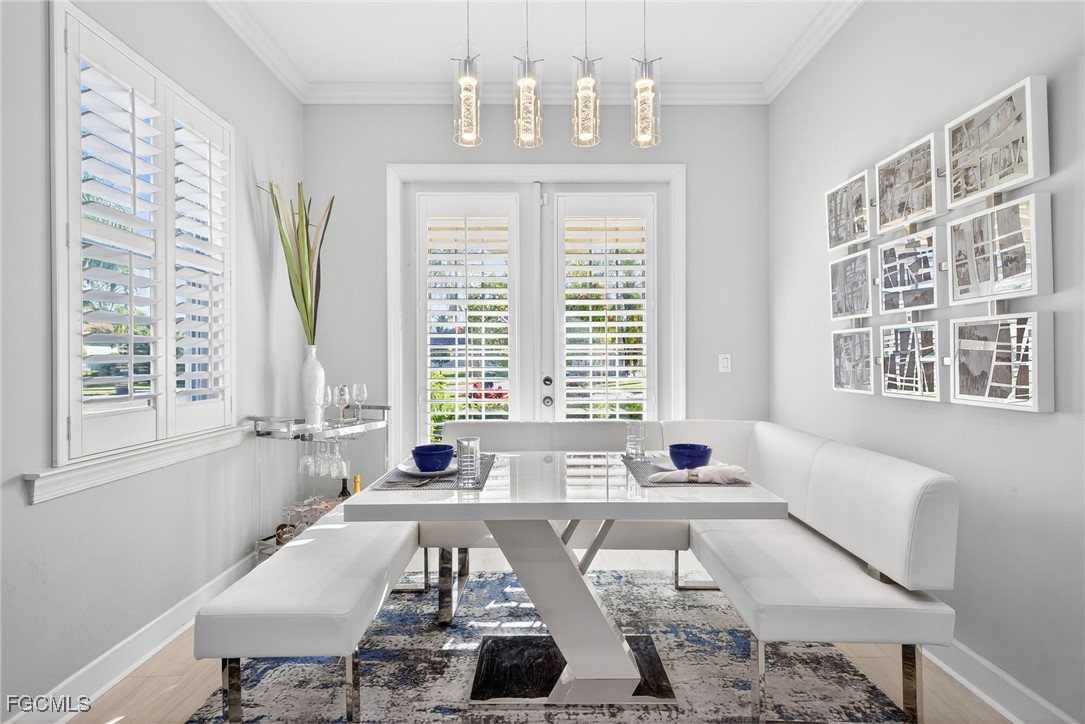 Welcome to this beautifully appointed 3-bedroom, 2-bath residence located in the highly desirable, gated community of Bridgetown. From the moment you arrive, you are greeted by a light-filled foyer featuring a sidelight and transom window, complemented by soaring 12-foot ceilings that create a bright and inviting first impression. The home showcases an updated kitchen designed for both style and functionality, offering 42-inch upper cabinets with quartz countertops, a tile backsplash, and premium finishes throughout. Luxury vinyl plank flooring flows seamlessly through the kitchen and living room, enhancing the open-concept layout and providing durability with a modern aesthetic. Eight-foot interior doors and crown molding add to the home’s upscale feel.