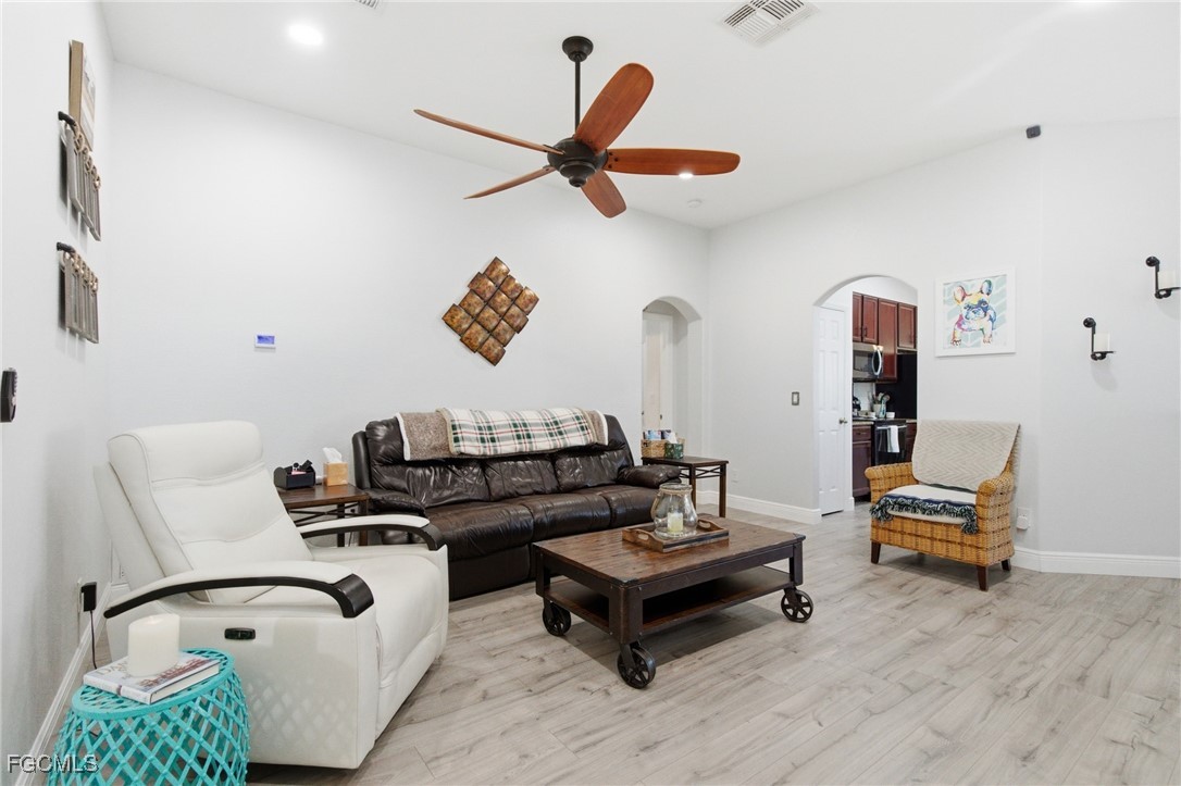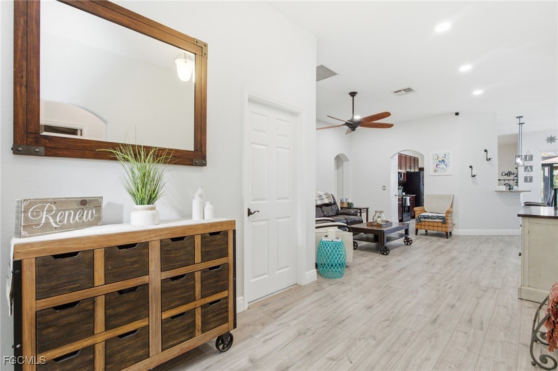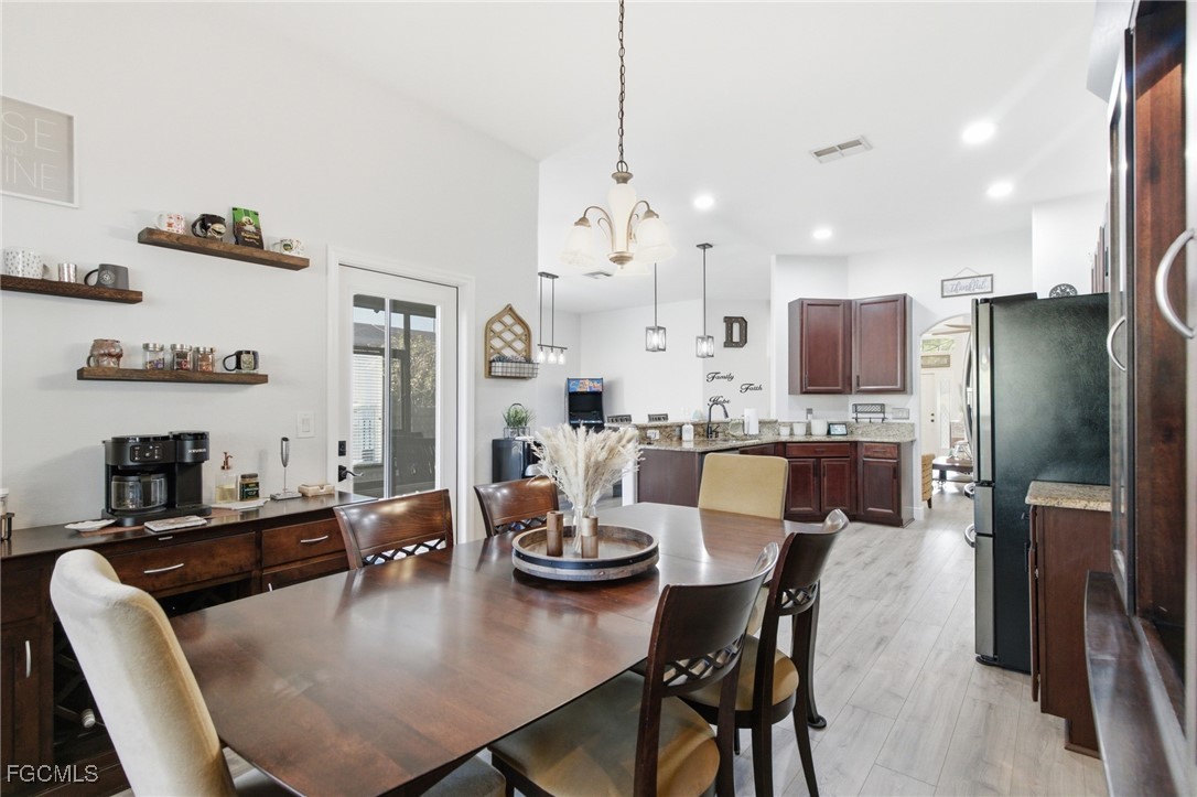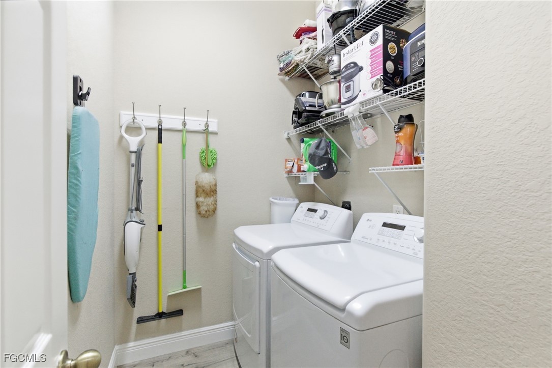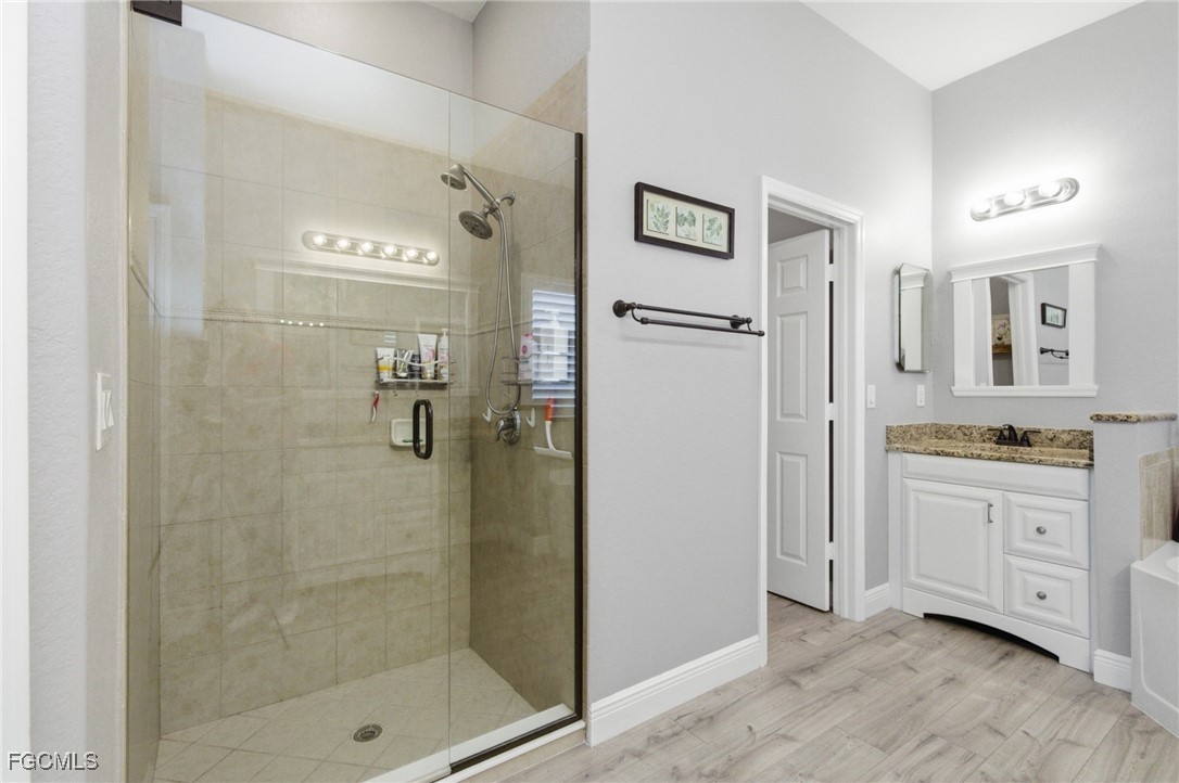 Upgraded and designed for everyday comfort and entertaining, this beautifully maintained home in the highly desirable Magnolia Lakes of Gateway offers standout indoor-outdoor living and true move-in readiness. The open-concept kitchen features granite countertops, rich dark wood cabinetry, and stainless steel appliances, flowing into a spacious living area ideal for gatherings or quiet nights at home. Alexa-Controlled lights in Living and Dining Rooms. Commercial-grade AC5 LifeProof flooring provides water- and scratch-resistant durability throughout, complemented by a fresh interior repaint with Sherwin-Williams Diamond. Major improvements include Hybrid Energy Efficient AO Smith Water Heater, Roof (2019), Spa (2018), A/C (2021) and Fence (2014), reflecting pride of ownership. The primary suite offers a relaxing retreat with a separate soaking tub, walk-in shower, and ample granite counter space. Outdoors, enjoy a private backyard oasis with a screened lanai featuring Bose speakers, a custom pergola, and a six-person hot tub, plus a custom outdoor bar with LED lighting, an epoxy river live edge bar top and separate built-in grill area with butcher block countertop, and mature fruit trees including dragon fruit, pineapple, lime, lemon, and calamondin. A hurricane-rated lanai cage designed to withstand winds up to 129 mph with picture-window screens adds peace of mind and unobstructed views.
