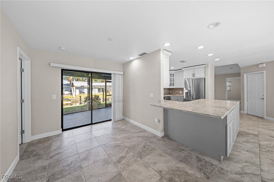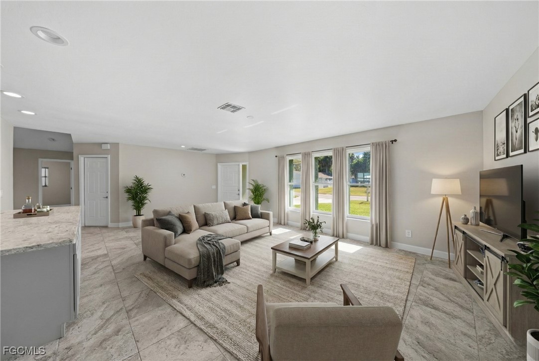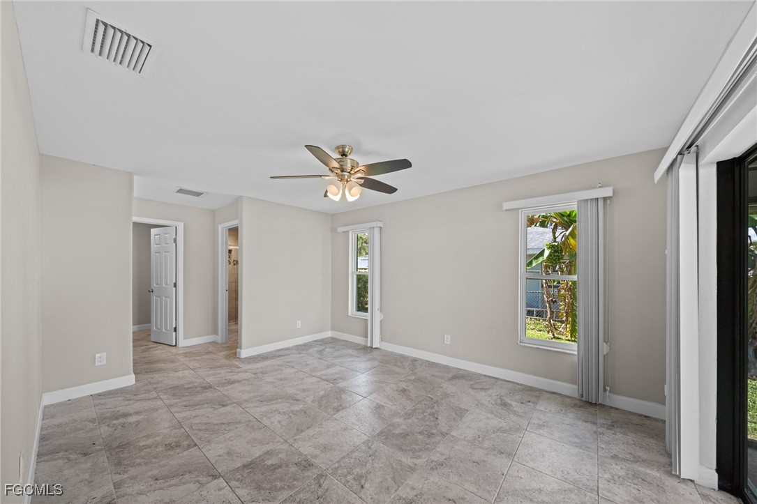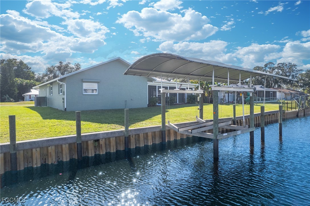 Boater’s Paradise. This remodeled and move in ready waterfront home offers stunning water views, quick open water access, and a premium boating setup just minutes from the river. Located in the quiet and desirable Olga boating community, this property delivers an authentic Old Florida feel with mature oak trees. Straight down the canal and fewer than 10 homes from the river, this 3 bedroom, 2 bathroom residence with a 2 car garage provides fast access to the Caloosahatchee River, making trips to fishing grounds, waterfront dining, and open water quick and effortless. The 14,000 pound boat lift features a 12 by 40 foot canopy installed in 2018 with full remote functionality and auto stop. Lift cables, rollers, and the canvas roof were replaced in 2023. Inside, the home features a clean, updated design with an open layout, soaring cathedral ceilings, neutral finishes, and abundant natural light. Sliding glass doors and large windows frame peaceful water views throughout the living spaces. Separate living and family rooms provide flexibility for relaxing, entertaining, or watching TV. The kitchen showcases stylish two-tone cabinetry with gray lowers & white uppers, stainless appliances, matching backsplash, and a pass through window to the lanai. Bedrooms are generously sized. The oversized screened lanai is huge! And includes storm shutters and 3 sets of pocketing sliders that fully open the interior to the outdoors. The backyard is larger than typically found in the area and offers ample space to add a pool if desired.