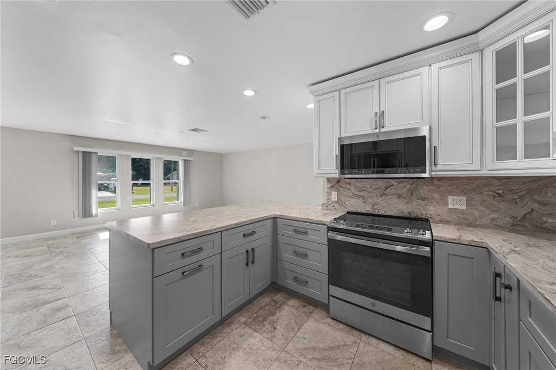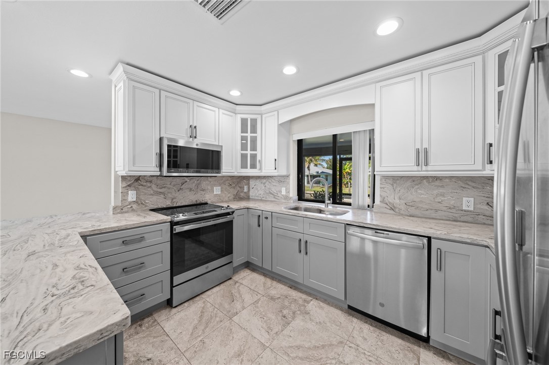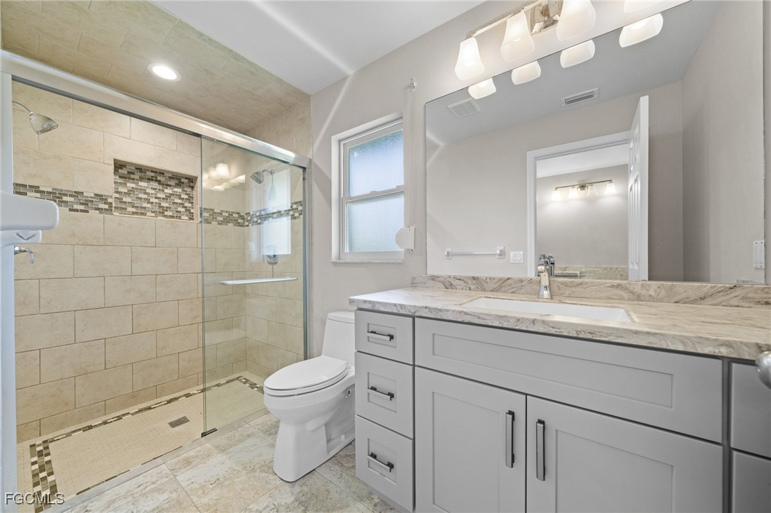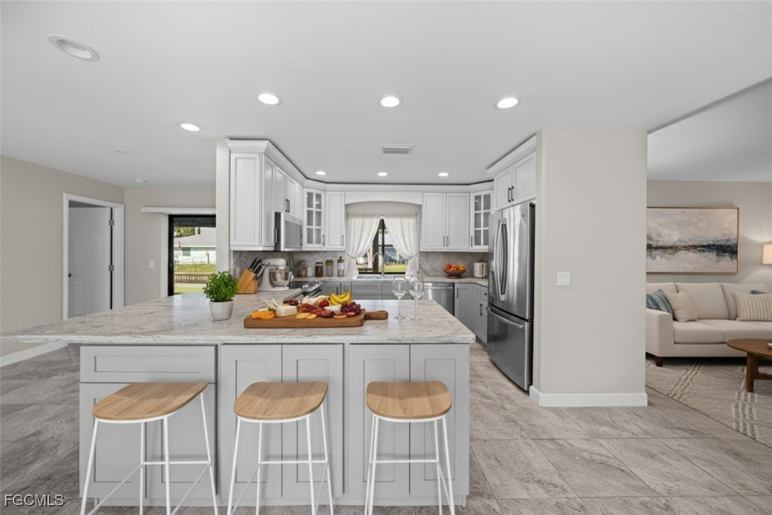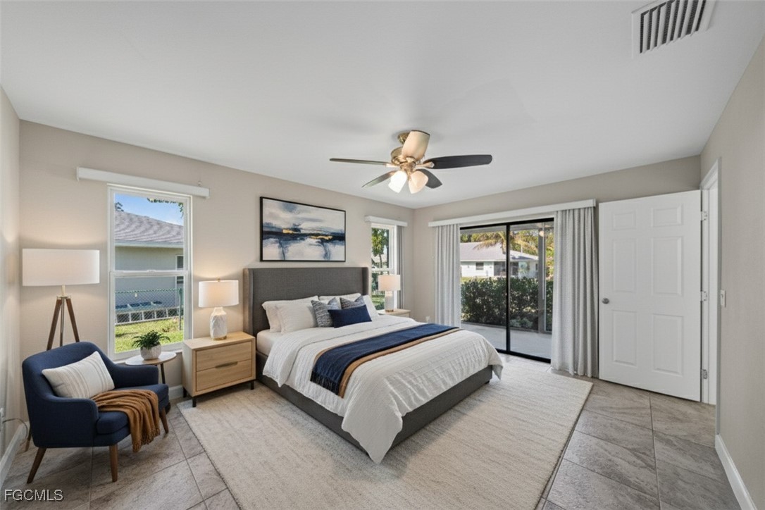 Boater’s Paradise. This remodeled and move in ready waterfront home offers stunning water views, quick open water access, and a premium boating setup just minutes from the river. Located in the quiet and desirable Olga boating community, this property delivers an authentic Old Florida feel with mature oak trees. Straight down the canal and fewer than 10 homes from the river, this 3 bedroom, 2 bathroom residence with a 2 car garage provides fast access to the Caloosahatchee River, making trips to fishing grounds, waterfront dining, and open water quick and effortless. The 14,000 pound boat lift features a 12 by 40 foot canopy installed in 2018 with full remote functionality and auto stop. Lift cables, rollers, and the canvas roof were replaced in 2023. Inside, the home features a clean, updated design with an open layout, soaring cathedral ceilings, neutral finishes, and abundant natural light. Sliding glass doors and large windows frame peaceful water views throughout the living spaces. Separate living and family rooms provide flexibility for relaxing, entertaining, or watching TV. The kitchen showcases stylish two-tone cabinetry with gray lowers & white uppers, stainless appliances, matching backsplash, and a pass through window to the lanai. Bedrooms are generously sized. The oversized screened lanai is huge! And includes storm shutters and 3 sets of pocketing sliders that fully open the interior to the outdoors. The backyard is larger than typically found in the area and offers ample space to add a pool if desired.
