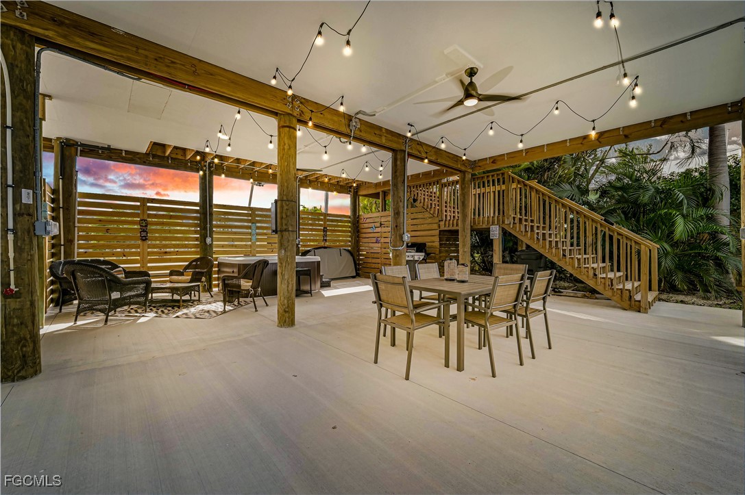 Downstairs, the covered area provides flexible space currently set up with a spa and seating—ideal for post-fishing relaxation, evening cocktails, or just enjoying the fact that you don’t live in a snowstorm. Parking is conveniently located in front of the home, and the stilt design makes excellent use of space while enhancing the coastal lifestyle.