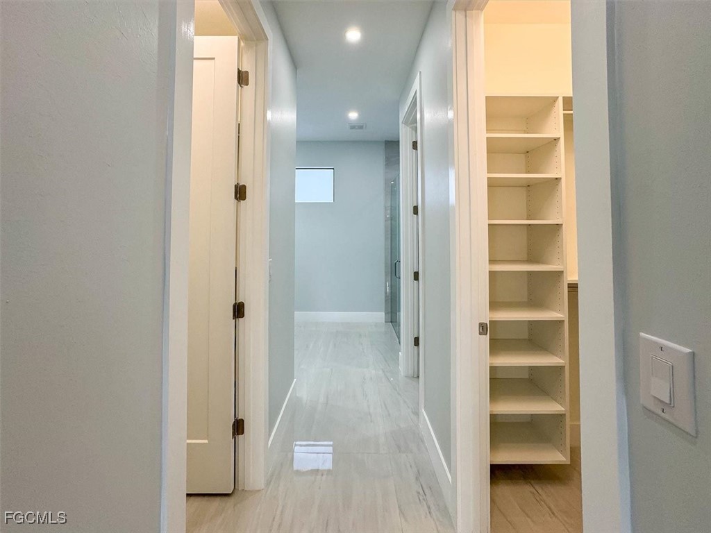 Large-format tile flooring flows throughout the home, complemented by 5¼" baseboards, custom bath selections, and a complete light and ceiling-fan package. Impact-rated windows, doors, and sliders provide storm protection, energy efficiency, and lower insurance costs while allowing abundant natural light.