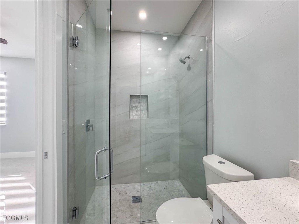 This thoughtfully designed home main suite is a private sanctuary with space for a king-size bed and seating area, direct lanai and pool access, and a spa-inspired ensuite showcasing a walk-in shower, frameless glass enclosure, and custom closet cabinetry.