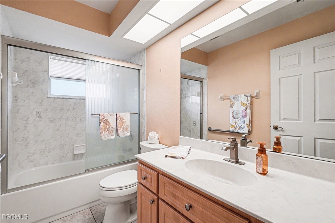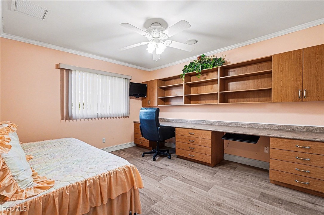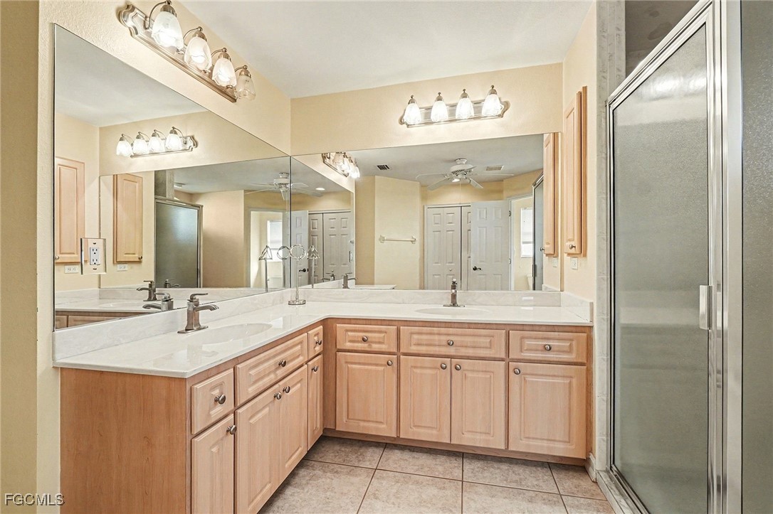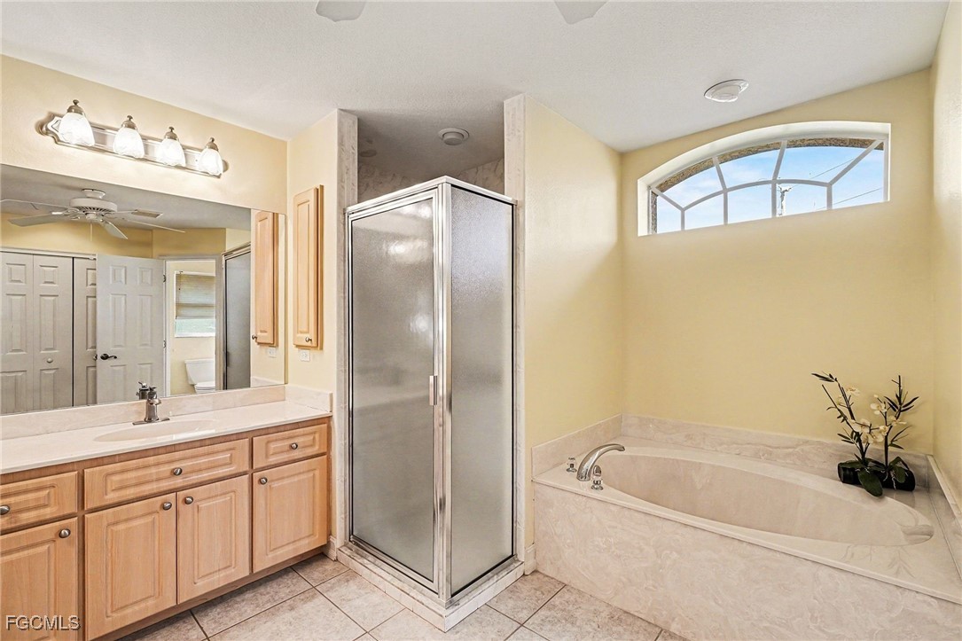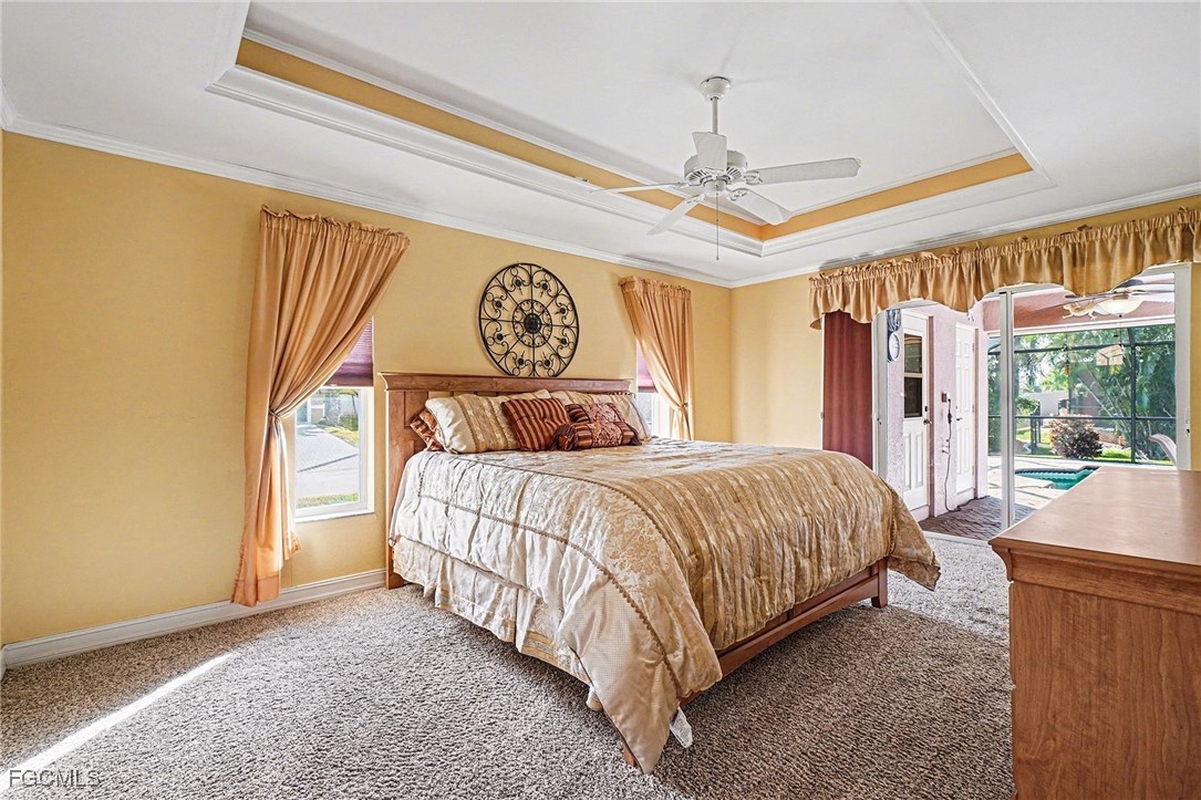 The primary suite is generously sized, giving room for a sitting area if desired, lit tray ceiling with crown molding, and sliders to the lanai. Master also includes two large walk-in closets, dual sinks, a soaking tub, a separate shower with safety grab bars, and a private water closet. Of the three bedrooms, one offers built-in cabinetry and desk space suitable for a home office. The guest bath has a tub/shower combo with glass doors. A half bath is conveniently located off the pool area. Outdoor features include an oversized lanai, caged in pool with a waterfall, electric roll-down shutters, and plumbing in place for a future outdoor sink/kitchen, and additional storage for all your pool equipment.