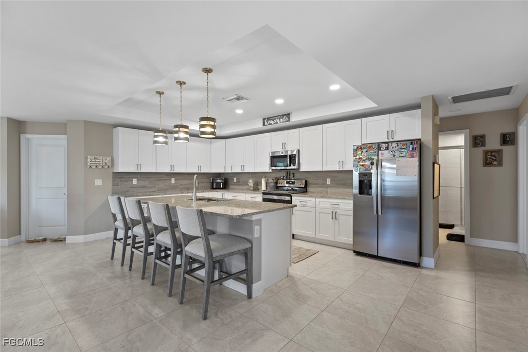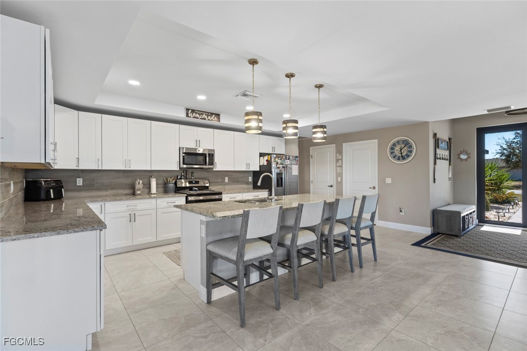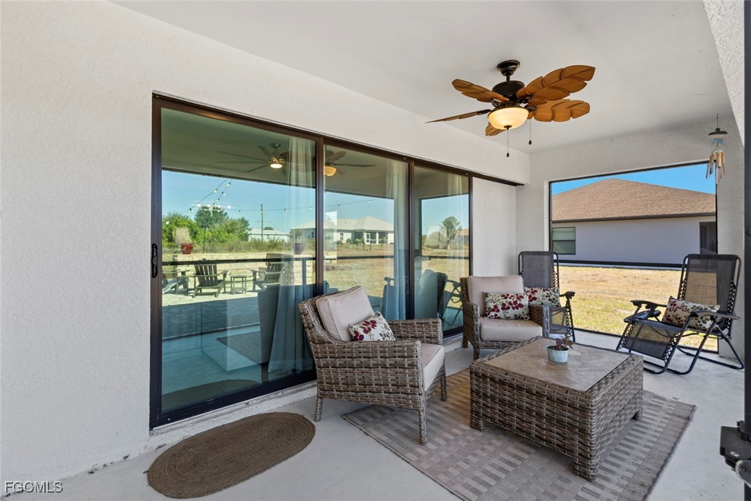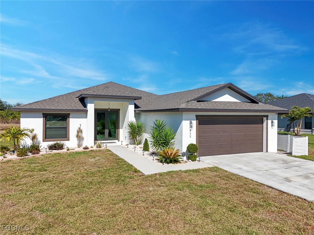 Modern efficiency meets premier outdoor living in this 2022-built Lehigh Acres home. Situated on an oversized lot, this 4-bedroom, 3-bathroom home offers 2,185 square feet of thoughtfully designed living space. Make a grand entrance through the elegant double glass door entryway into an airy, open layout featuring impact-resistant windows and doors throughout for ultimate storm safety and peace of mind. The interior is complemented by modern window treatments, ceiling fans and walk-in closets in every room. Tech-forward features include a pre-installed security camera system, Ring doorbell, and a solar panel system. The two-car garage functions as a complete workshop with a built-in workbench, overhead racks, and extensive shelving. Transition outside to a true backyard oasis featuring a screened-in lanai that leads to a 500-square-foot entertainer’s patio. This custom outdoor space is anchored by a firepit and unique tiered stadium seating, perfect for hosting gatherings. For added convenience, the exterior also features a paved walkway to a fenced garbage pad area. With low-maintenance landscaping and the structural benefits of newer construction, this home offers an incredible lifestyle in a peaceful, low-traffic setting.