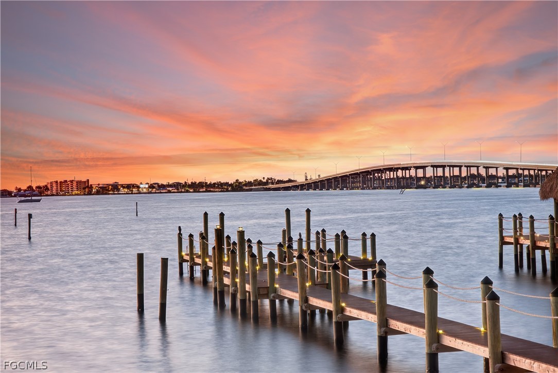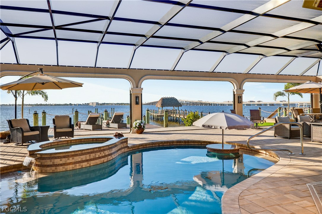 Set along the Caloosahatchee River in Riverside Estates, this extraordinary residence was engineered as a true coastal fortress — and positioned in the highly desirable X500 flood zone for added peace of mind. A double concrete seawall secures the shoreline. Solid concrete core pillars reinforce the screened enclosure. Impact-rated windows and doors, a new roof, and electric roll-down storm screens provide layered protection—all seamlessly concealed behind refined architectural detailing so that beauty, not structure, commands attention. Here, the focal point is what matters most: panoramic water views and painted-sky sunsets that feel like a nightly private showing by nature. A 160-foot private pier extends gracefully into the river, capable of accommodating vessels with 10-foot beams and up to 36 feet in length—offering exceptional flexibility for boating enthusiasts. For those with larger vessels, the owners’ 50-foot wet slip at the Riverside Marina is also available. Just beyond the screened lanai, a 20x8 open-air waterfront deck creates the perfect setting for sunbathing, and front-row seating to Fourth of July fireworks and seasonal boat parades. Outdoor living is designed for every season. A heated pool and spa invite year-round enjoyment. The covered outdoor kitchen sets the stage for effortless entertaining. A sprawling sunroom with a heat-producing fireplace creates warmth and ambiance on cooler evenings, blending comfort with the ever-present backdrop of the river through 9-foot sliding glass doors. Inside, soaring 20-foot ceilings and LED-backlit coffered details elevate the living spaces with quiet drama. The expansive primary suite is thoughtfully positioned on the first floor, offering both privacy and convenience. Upstairs, three guest suites—each with en suite baths and dual-sink vanities—deliver comfort and independence. An upstairs morning kitchen and laundry area create a retreat-like experience for guests. The open loft and study area opens through French doors to an oversized balcony—perfect for morning coffee, virtual meetings with a view, or unwinding as the sun sets over the water. On the main level, a dedicated office with a walk-in closet and Murphy bed offers flexibility as a fifth bedroom without compromising sophistication. Both offices are appointed with adjoining private baths. Located in Riverside Estates and accessed through The Landings gated main entrance, residents enjoy the rare balance of privacy and optional full or social membership to The Landings with executive golf course, tennis, two restaurants and a full calendar of events—while maintaining their own riverfront marina lifestyle within Riverside Estates. Ask your agent for The Full Scoop—insight beyond the MLS, including detailed features, upgrades, and ownership highlights designed to provide clarity and confidence.