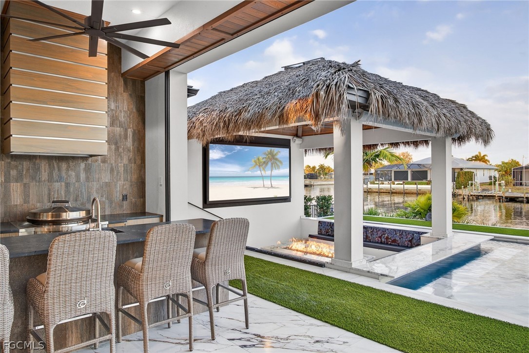Then the home opens up — literally. A full wall of bi-fold glass creates a 30-foot opening to an outdoor living environment that’s in a category of its own: dining, lounging, full outdoor kitchen, pool and spa, putting green, and a zero-entry pool ramp designed for comfort across every season of life. The signature moment is the sunken chickee lounge — seating for 20, a linear fire feature, and a custom 135-inch TV, with additional pool-side seating built right into the water so the whole party stays connected.