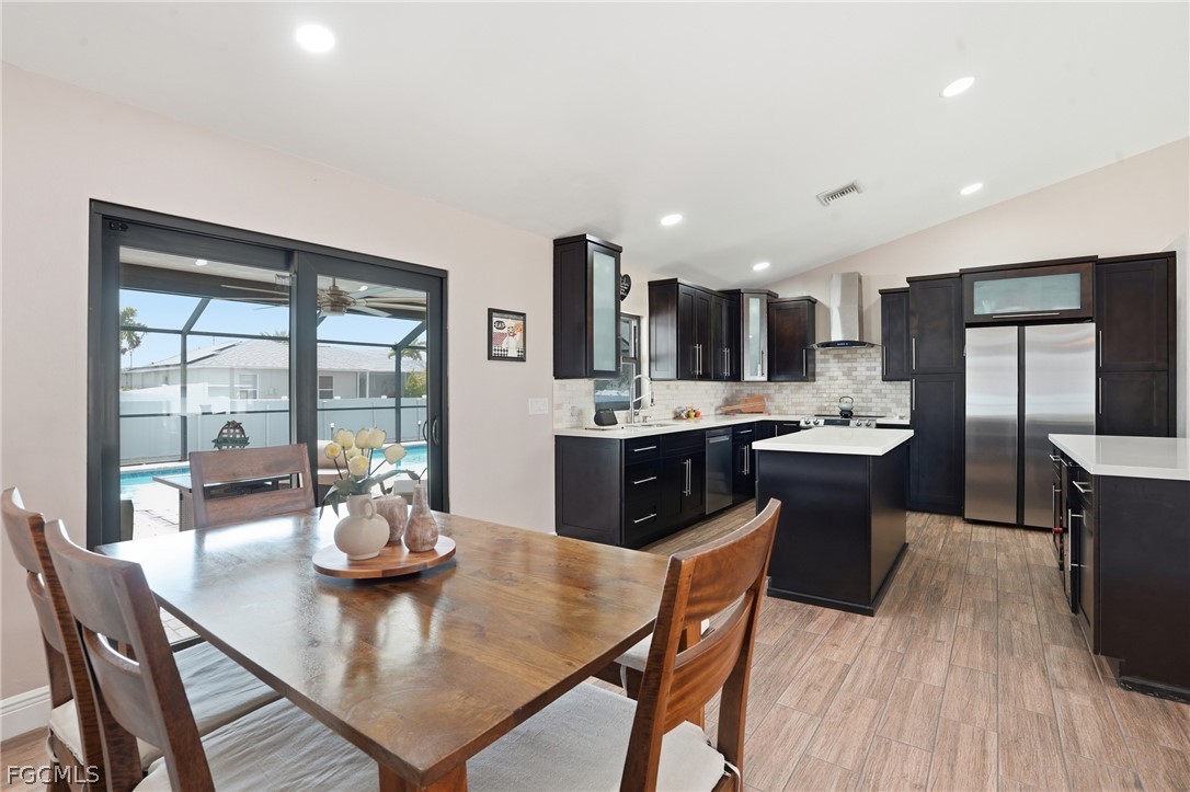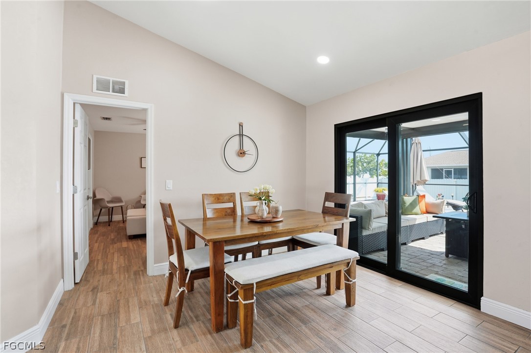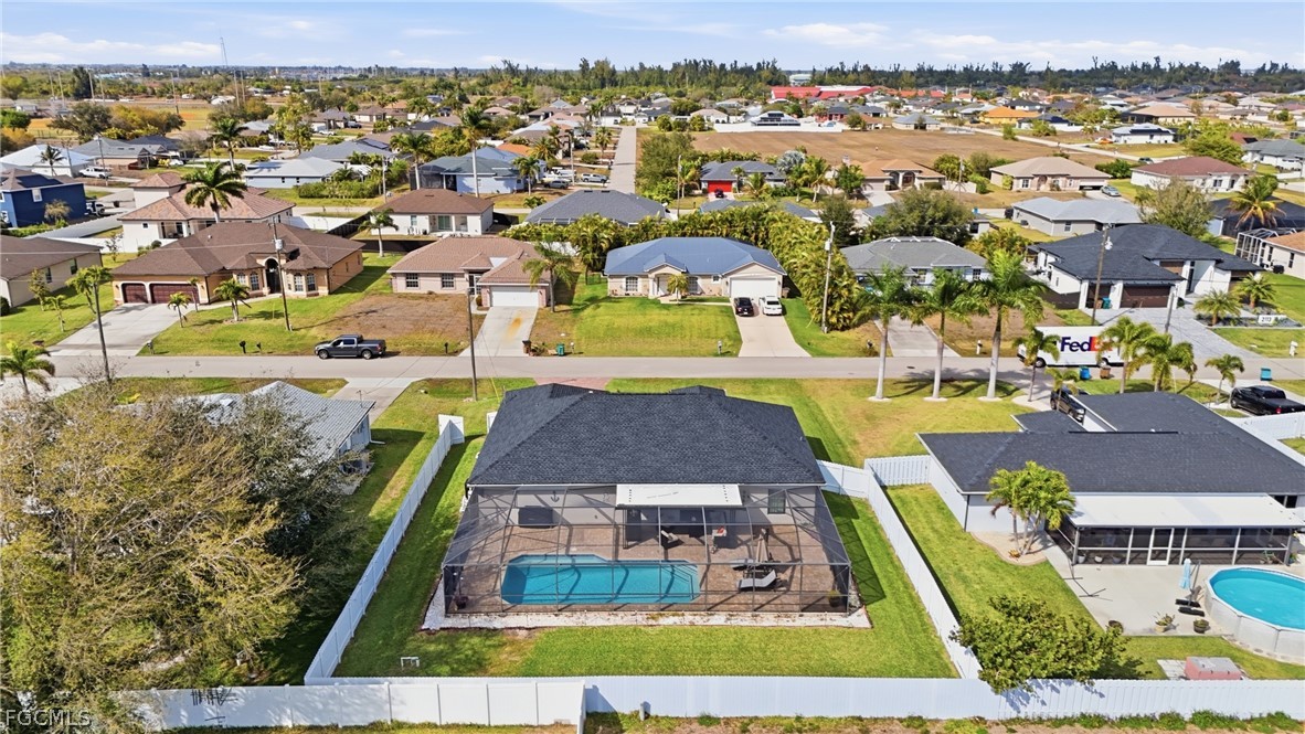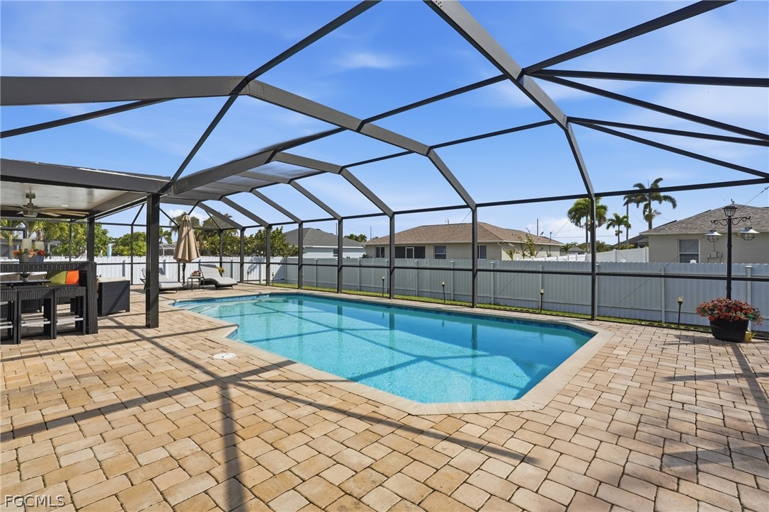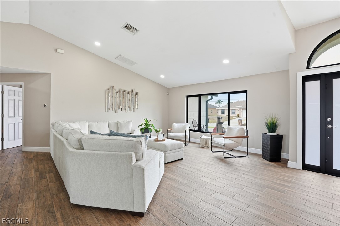 Spacious and beautifully maintained pool home in the heart of Cape Coral! This partially furnished property features a versatile 3+ den layout with 2 full bathrooms and a bright, open feel enhanced by soaring ceilings and whole-house plank tile flooring. The updated kitchen offers a modern design with a large center island, stainless steel appliances, and plenty of prep and storage space, perfect for cooking and entertaining. The primary suite includes a spa-like bathroom with dual vanities, creating a relaxing retreat. Enjoy year-round Florida living with a heated saltwater pool and fully fenced backyard, ideal for entertaining, pets, or quiet evenings outdoors. Additional upgrades include impact-resistant windows and an instant, unlimited hot water system for added efficiency and peace of mind. Conveniently located near shopping, restaurants, schools, parks, and major roadways, with easy access to Cape Coral’s waterfront lifestyle, boating, and nearby Gulf beaches.