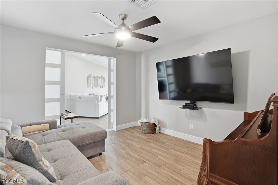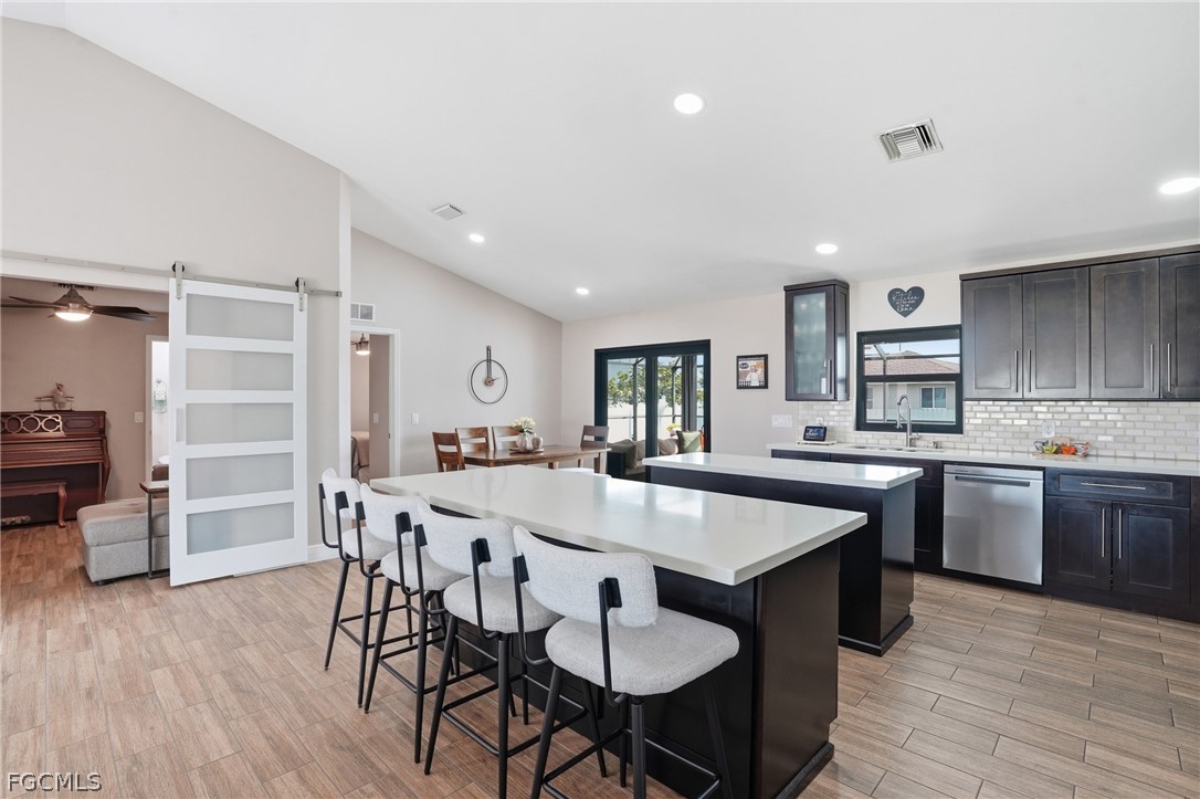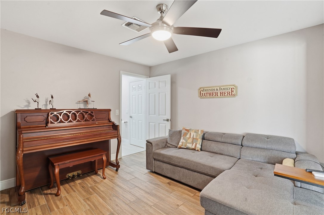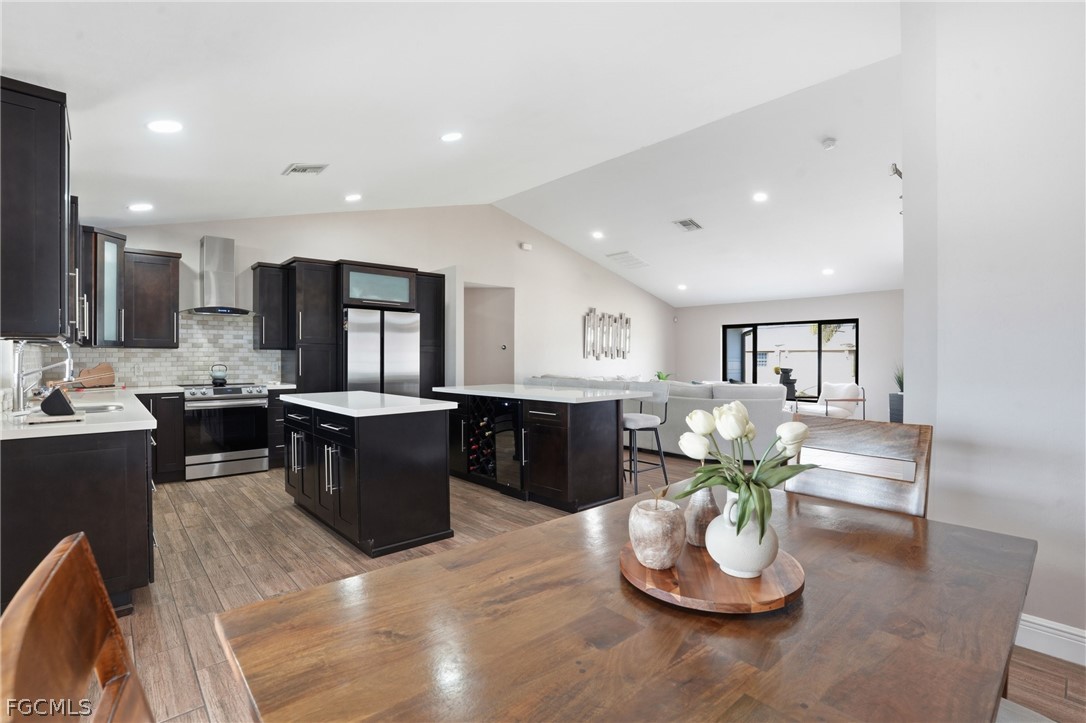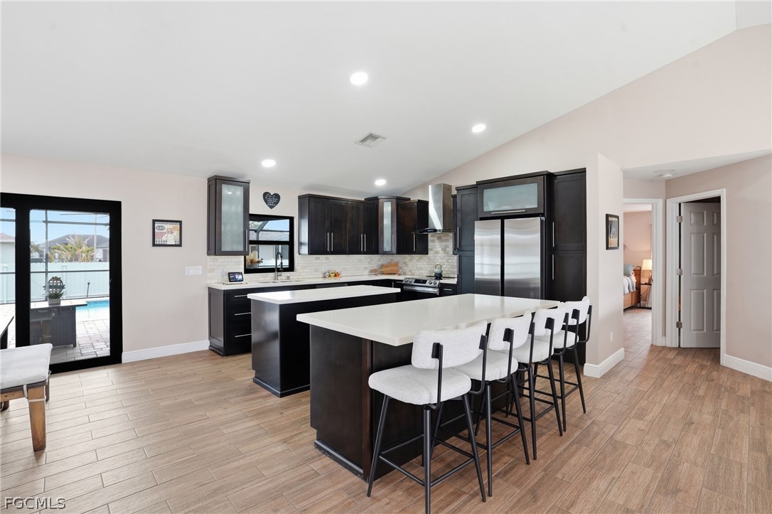 Spacious and beautifully maintained pool home in the heart of Cape Coral! This partially furnished property features a versatile 3+ den layout with 2 full bathrooms and a bright, open feel enhanced by soaring ceilings and whole-house plank tile flooring. The updated kitchen offers a modern design with a large center island, stainless steel appliances, and plenty of prep and storage space, perfect for cooking and entertaining. The primary suite includes a spa-like bathroom with dual vanities, creating a relaxing retreat. Enjoy year-round Florida living with a heated saltwater pool and fully fenced backyard, ideal for entertaining, pets, or quiet evenings outdoors. Additional upgrades include impact-resistant windows and an instant, unlimited hot water system for added efficiency and peace of mind. Conveniently located near shopping, restaurants, schools, parks, and major roadways, with easy access to Cape Coral’s waterfront lifestyle, boating, and nearby Gulf beaches.