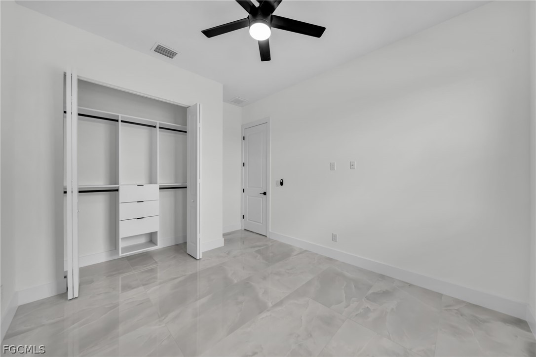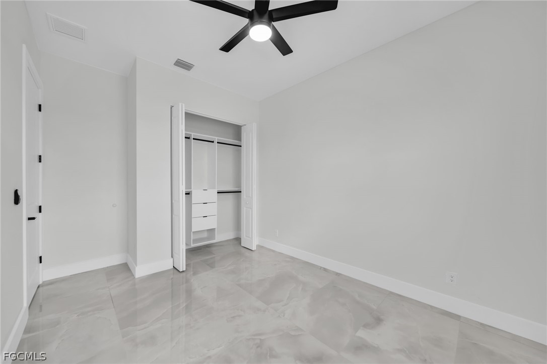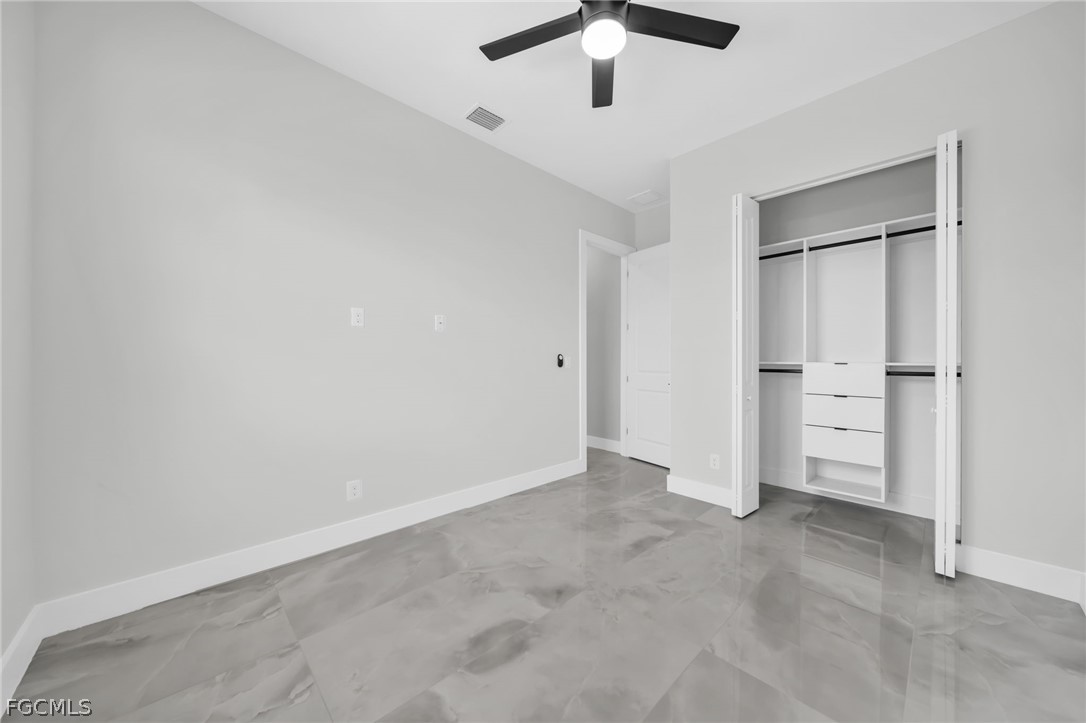 The home features an open floor plan with a large kitchen, quartz countertops, stainless steel appliances, and plenty of cabinet space. Ceiling fans are installed throughout the home for added comfort.