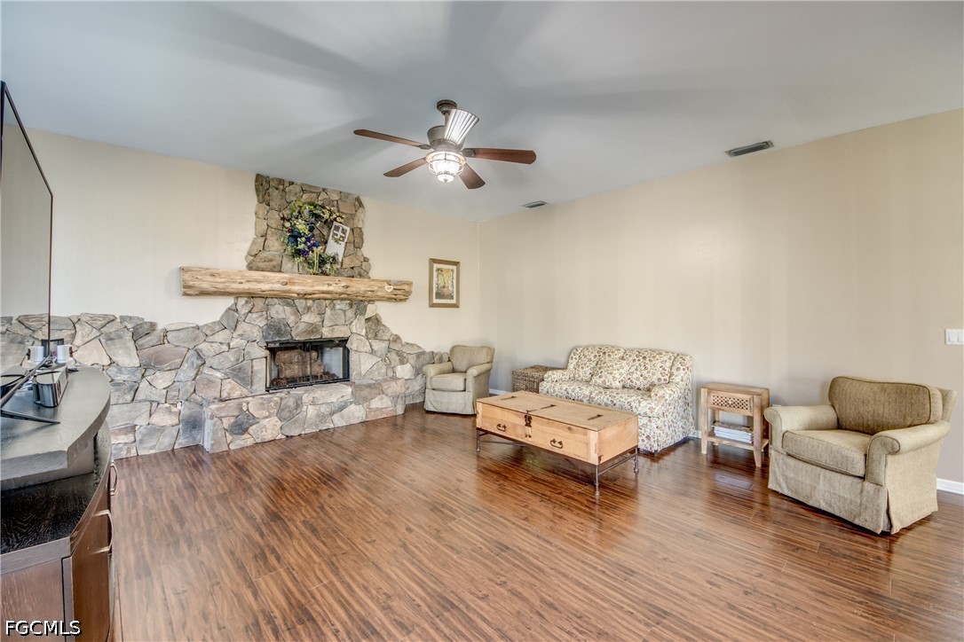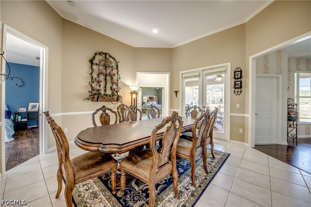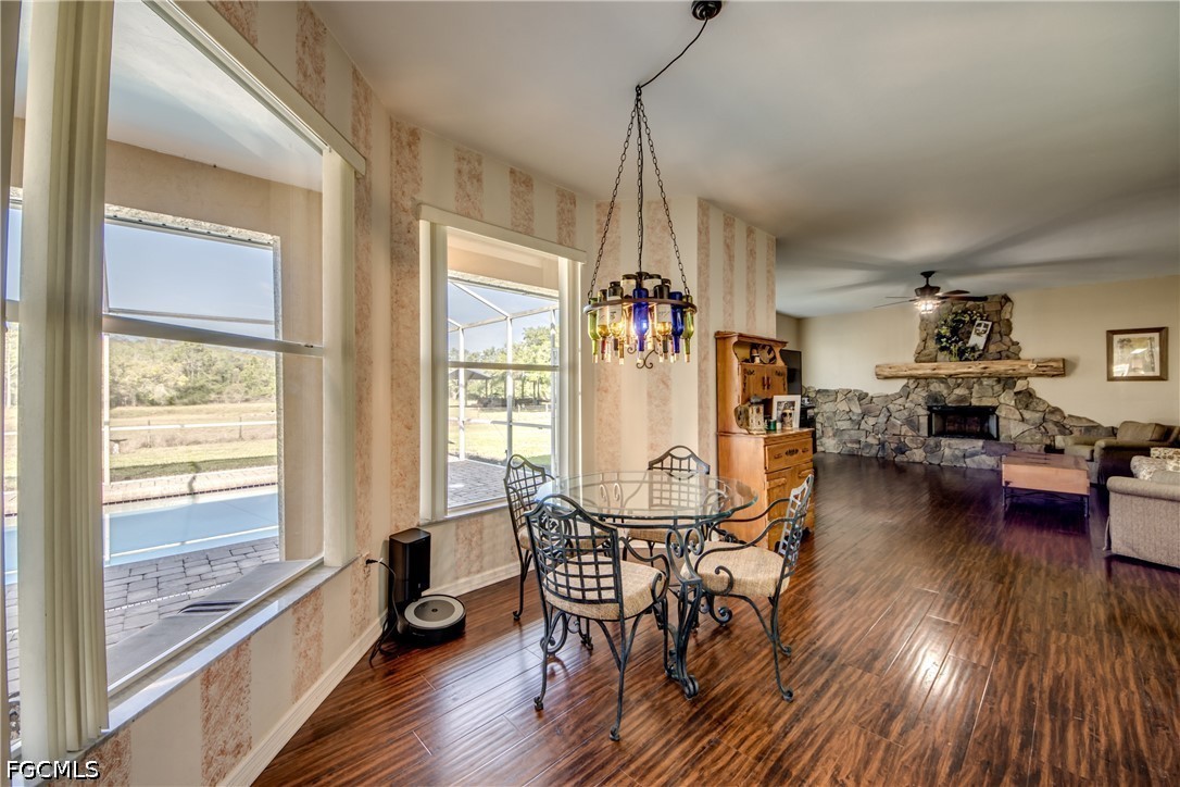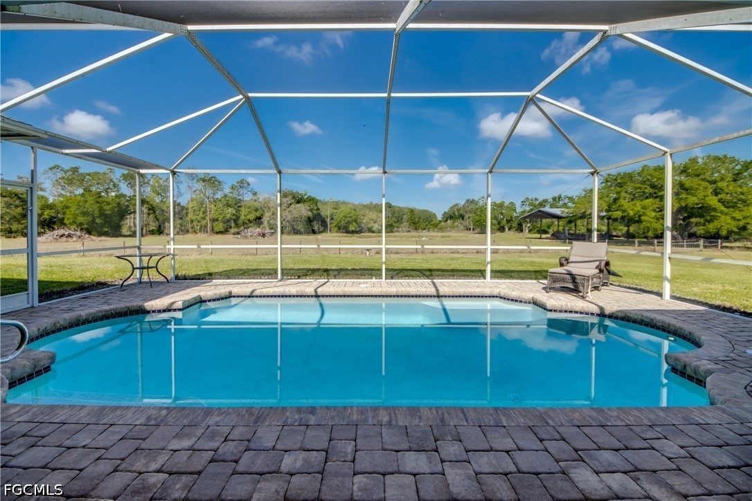 Places like this are disappearing fast in SWFL. Your private Florida retreat is here where dirt roads, crickets, and birds replace the noise of the city, and stress from the hustle and bustle of life fades as you open up your gate and pull up to the side-entry 2-car garage. A pool home with 3 bedrooms, 2.5 baths with 2,490 sqft of living space on 5.49 pristine acres. The Entire parcel is fully fenced in with one enclosure around the main home with an outbuilding equipped with a separate 200 Amp Service, and water Hook up for RV Parking. Second enclosure has approximately 3.75-acres of pasture separately fenced and a Huge 60'x40' Pole barn and private pond backing up to a private preserve. Providing an ideal space for animals, equipment, toys, or any outdoor hobby you may have. Tall French doors welcome you into a stunning formal dining area with soaring 12 ft ceilings. This open-concept floor plan is filled with plenty of natural light as you walk from the formal dining area into the living and dining area. There will be plenty of holidays and memories to be enjoyed fireside next to your fireplace lined with Riverstone rock adding to that feeling of warmth, comfort and a place to call home. You can't have the perfect house without a huge kitchen built for the avid cook with plenty of counter space, bar-height seating, stainless steel appliances, and an electric cooktop. Even your guests or family will be comfortable in oversized guest bedrooms and an exceptionally large guest bathroom with dual sinks. The owner’s suite is a true retreat, with French door entry and another set out to the lanai. The owner's suite matches the theme being oversized with a large soaking tub, walk-in shower, and a giant walk-in closet. Outdoor living shines with five separate exits to the huge covered back lanai—from the living room, formal dining room, owner’s suite, dining nook, and hallway near the powder room—creating an easy indoor-outdoor flow. The covered lanai offers plenty of room to escape from the heat or weather and includes a sink and counter space within a screened enclosure that wraps around the electric-heated pool. Watching evening sunsets over the true old Florida backdrop or a weekend entertaining, this property combines space, comfort, and a peaceful country lifestyle, all within a reasonable drive of Fort Myers conveniences located at the end of corkscrew between SR-82.