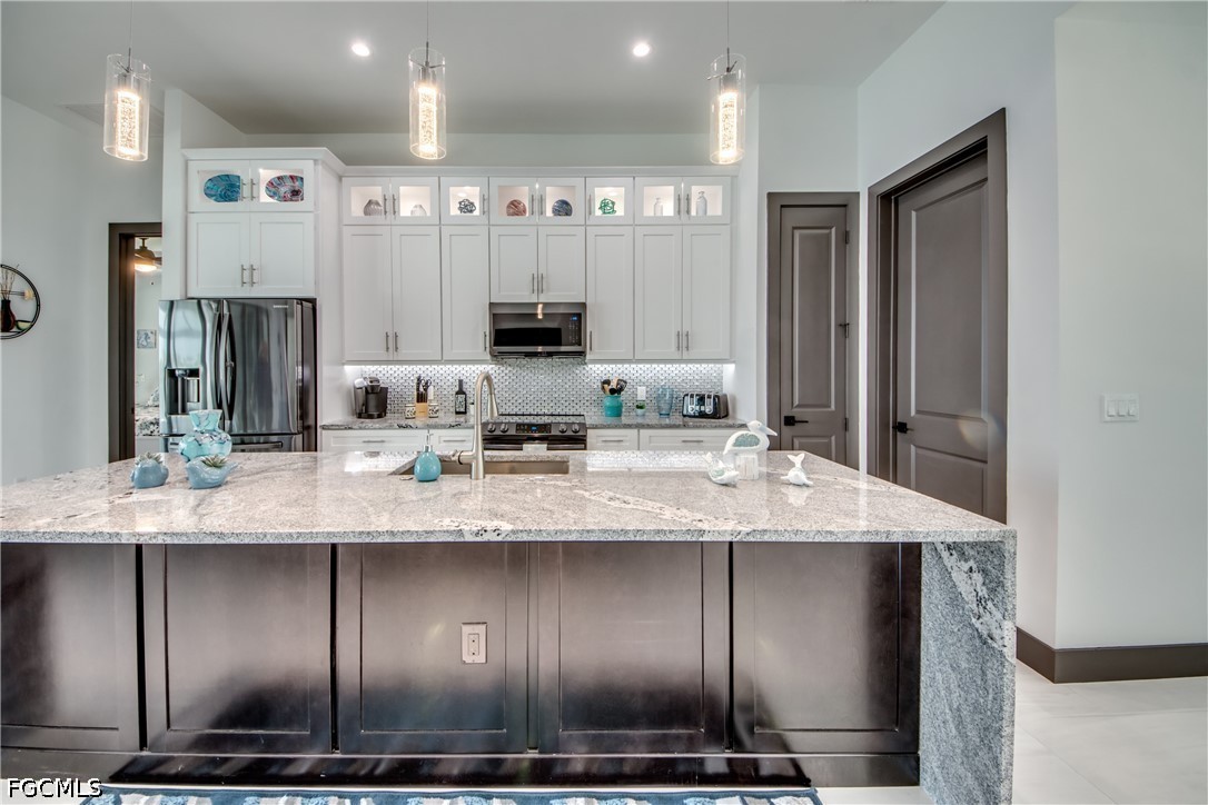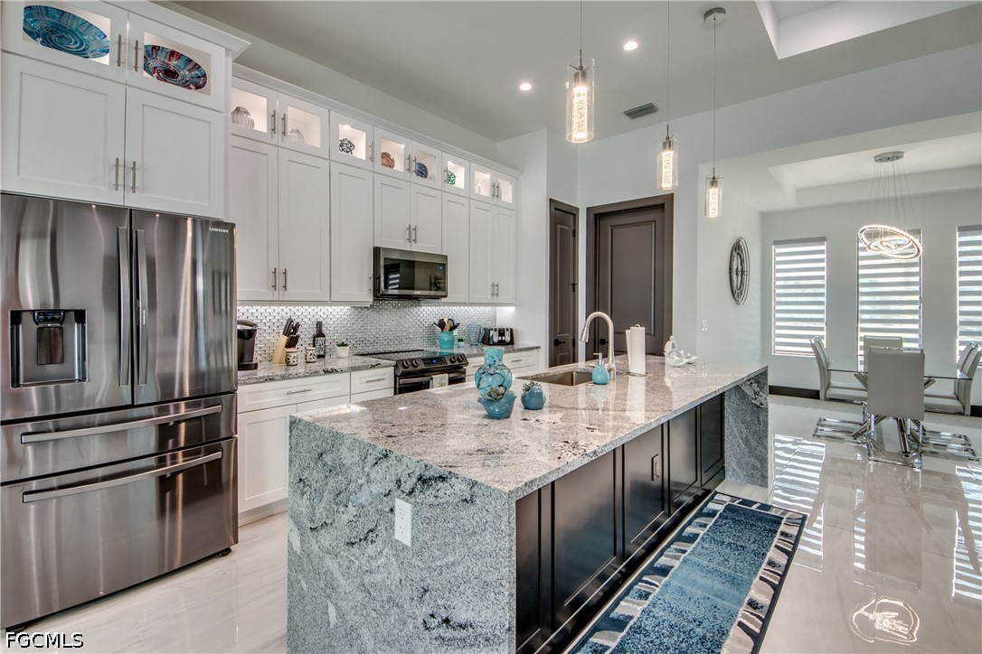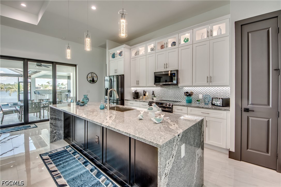 The open-concept kitchen is ideally suited for hosting gatherings, boasting bar seating, custom cabinetry, and top-of-the-line stainless steel appliances. Its layout and amenities make entertaining both effortless and enjoyable.
