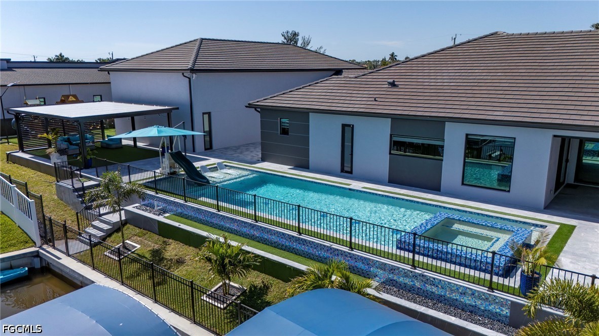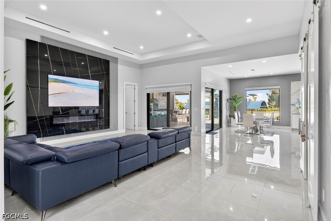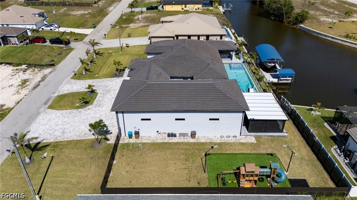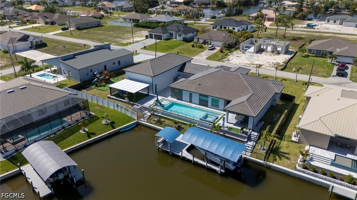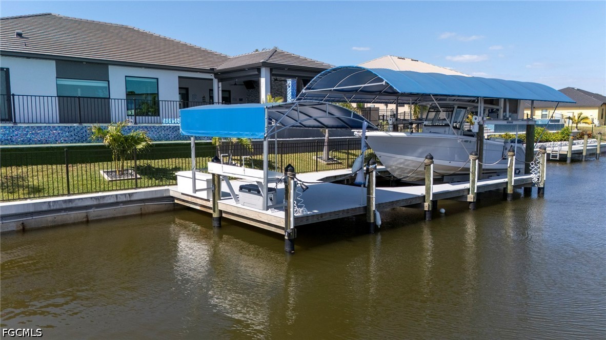 Custom-built luxury home on the Water with Gulf access, featuring a massive 2-RV garage, measuring 65' L x 30 ' W, making it ideal for RV owners, boat storage and car enthusiasts. This garage can fit one RV, plus 1 36' boat, or 1 boat and 5 cars. Built in 2024, the home provides 3,500 square feet under air with 4 bedrooms, an office, a home theater and 6 baths. The property includes a private newly constructed grey composite dock with a large canopy, a custom fish cleaning table, and a heavy-duty boat lift up to 36 feet. One of the home's most desirable features is a huge 23' x 17' home theater with a high-quality surround sound system, screen projector, bar with quartz countertop, mini fridge, microwave, custom European cabinets and 2 big closets with shelves. A panoramic picture-window screen enclosure maximizes canal views without visual obstruction. The kitchen offers quartzite countertops with a waterfall island, a huge walk- in pantry with shelves, custom cabinetry, high-end fixtures and several closets throughout the home. High-quality, large porcelain tile throughout all bathrooms. Wired speakers (two inside and 3 outside) provide an integrated entertainment experience. Wire security cameras all around home, Situated on an oversized .0.48-acre, Gulf access canal lot, this remarkable residence offers a total of 6,542 square feet under roof. The stunning outdoor living area includes a HUGE swimming pool around 50' L x 16'w with heated pool and spa, outdoor shower with cold/hot water, travertine deck, irrigation system, exterior lighting, and covered lanai, also features are new remote-control hurricane shutters. The expansive lanai along with a full outdoor kitchen, equipped with gas stove, extractor hood, ice maker and beer machine, refrigerator, double oven and two mounted televisions. whole-house reverse osmosis RO system, 6 fans with remote control, Kids Park area with turf and powerful solar lights This property combines, unique modern design, quality construction, and a prime waterfront setting to deliver a refined and distinctive waterfront living experience Minutes to Coral Oaks and Royal Tee golf courses, Publix, and the future 7 Islands waterfront dining and shopping district. Impact doors and windows, grey tile roof showings for SERIOUS buyers only!