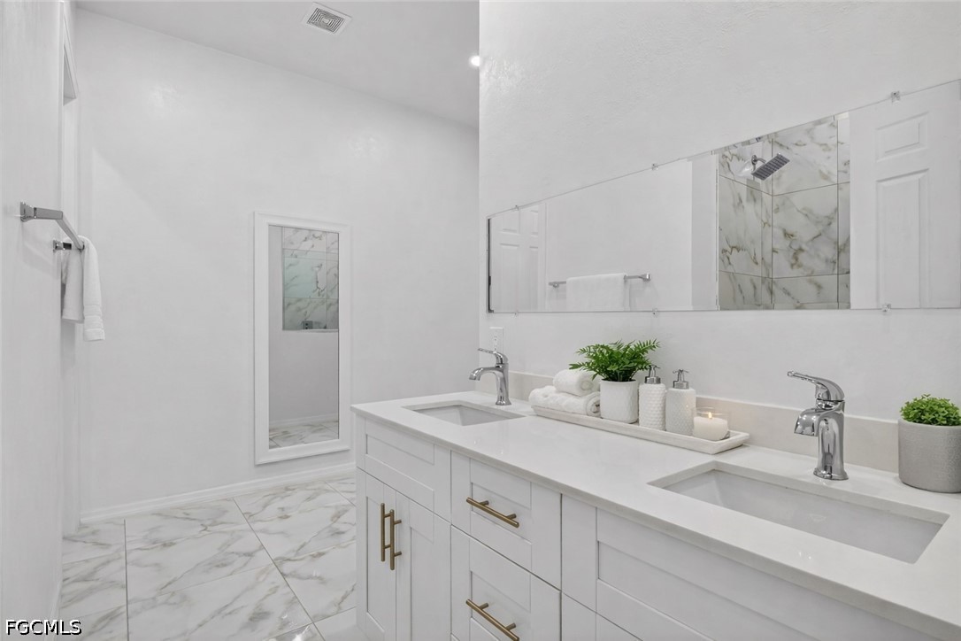 Built in 2024 by a private builder, this newer construction home sits on a spacious corner lot in Lehigh Acres and features a custom-designed layout that stands apart from typical builder-grade homes in the area. With 2,161 sq ft of living space and 2,591 total sq ft, this home is larger than many properties in the area, offering plenty of room to live, work, and entertain comfortably. This 4-bedroom residence includes multiple en-suite style bedrooms, creating ideal separation for guests, extended living, or shared households. Bright open-concept design with high ceilings, tile flooring throughout, and abundant natural light. The kitchen is centrally positioned with a large island, modern cabinetry, quartz countertops, and stainless steel appliances. The primary suite offers a spacious bath with upgraded finishes and a functional layout. Additional highlights include impact windows and doors, covered rear patio, 2-car garage, and dual driveways offering ample parking for multiple vehicles or work use. No HOA. Conveniently located near major roads, shopping, dining, and schools. Property is also available for rent—ideal for end users or investors seeking flexibility.