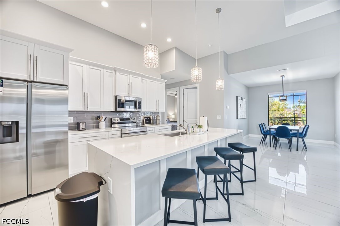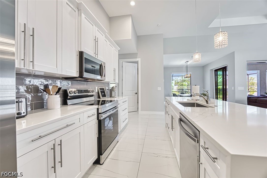 Step inside to find elegant tile flooring throughout, tray ceilings, and an upgraded lighting package that enhances the home’s bright, open feel. The kitchen is a true centerpiece, featuring hardwood cabinetry, stainless steel appliances, a custom backsplash, quartz countertops, walk-in pantry and an oversized island—perfect for entertaining.